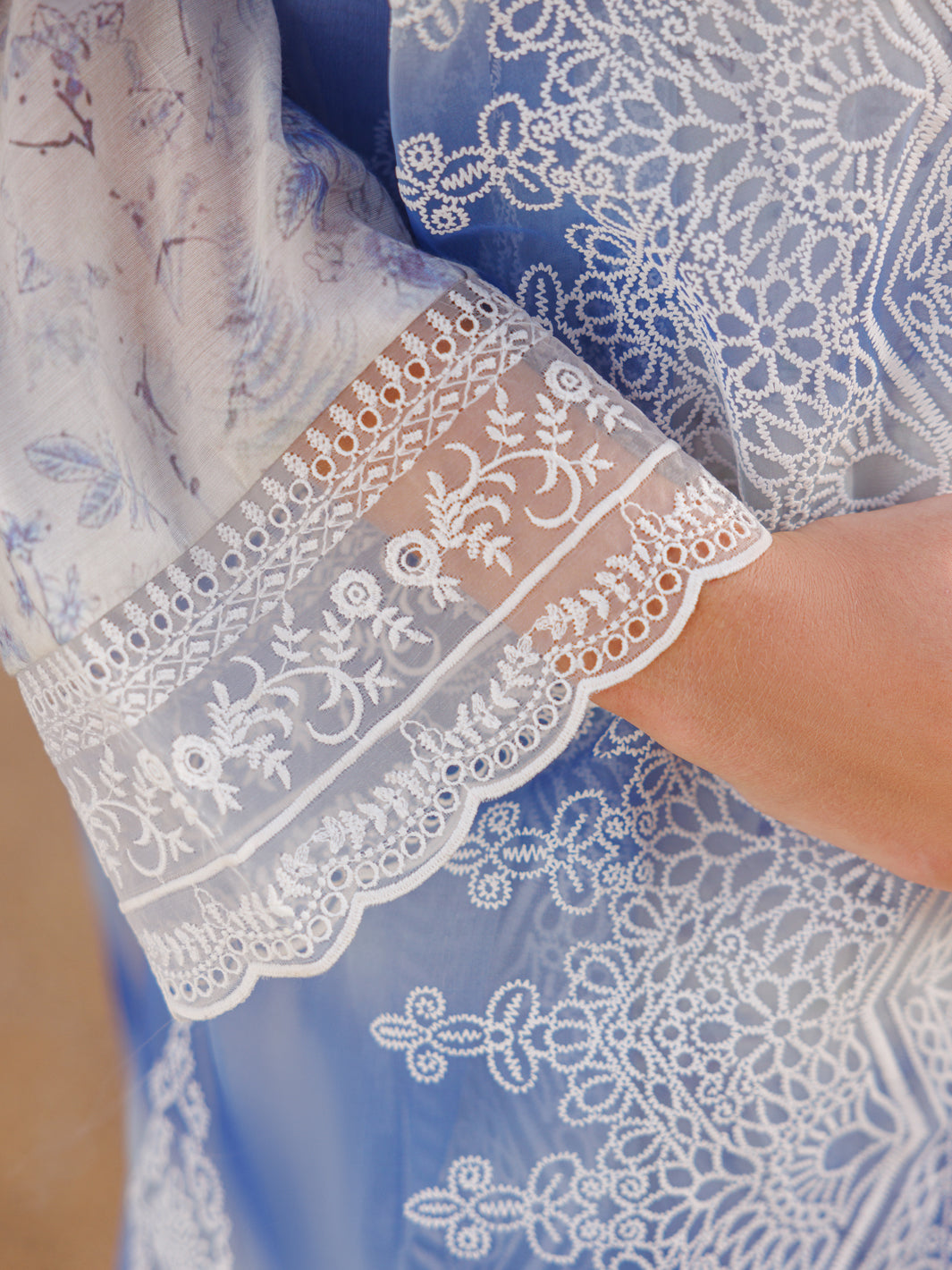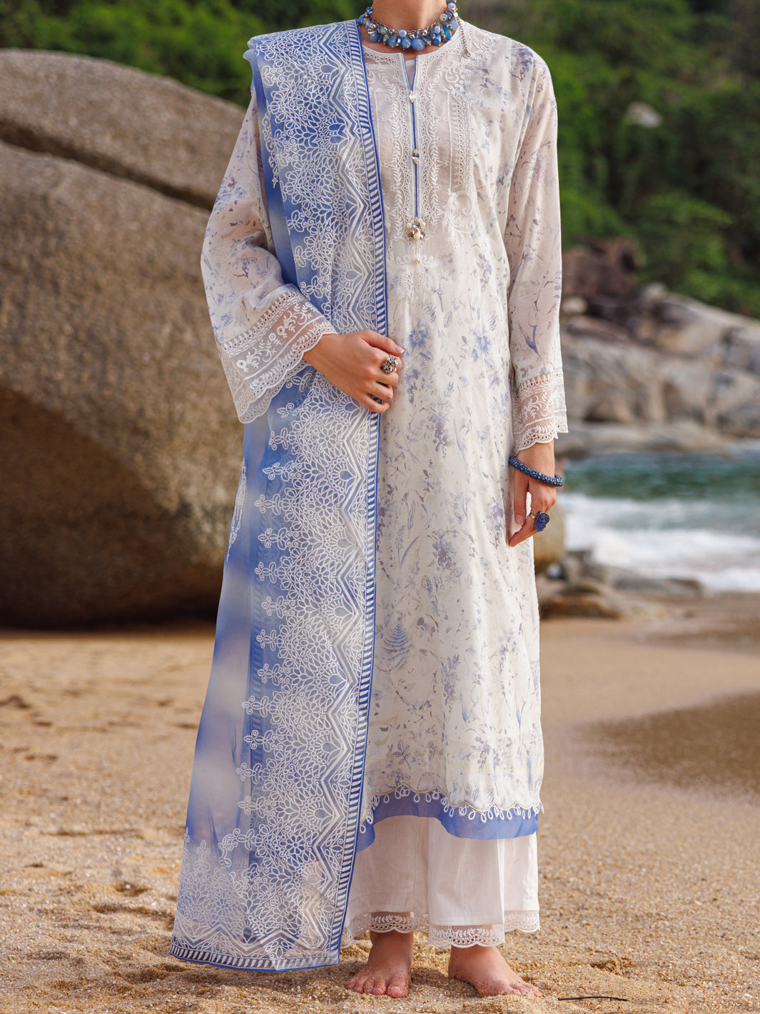 swiss foil digital printed shirt: 2.28 meters organza foam printed dupatta: 1 pc lawn dyed trouser: 2 meters neckline embroidered bunch: 1 pc sleeves embroidered border: 1 meter trouser embroidered border: 1.40 meter chalk embroidered patti: 2.5 meters
