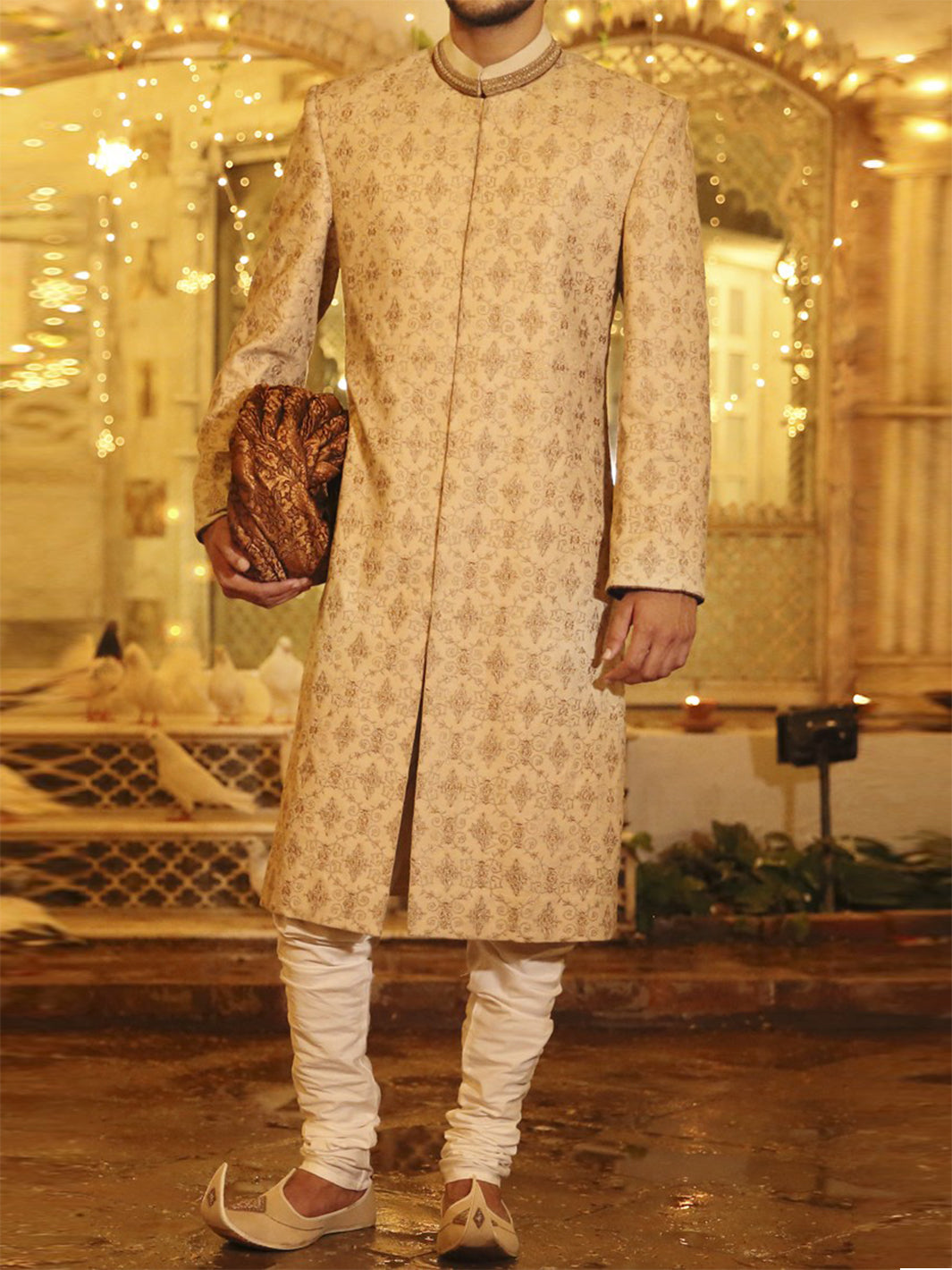 beige colored sherwani with handwork on front panels, collar and sleeves. stitched in jacquard fabric. once the order is placed, our customer support team will contact you for the complete measurement guide & requirements. our experts will help you get the perfect fit through bespoke tailoring for your special events. delivery time varies between 10 - 15 days depending on the shipping location. should you require any further information please email us at [email protected] or call our helpline +92 21 38781662 (mon-sat, 9:00 am - 8:00 pm pkt)
