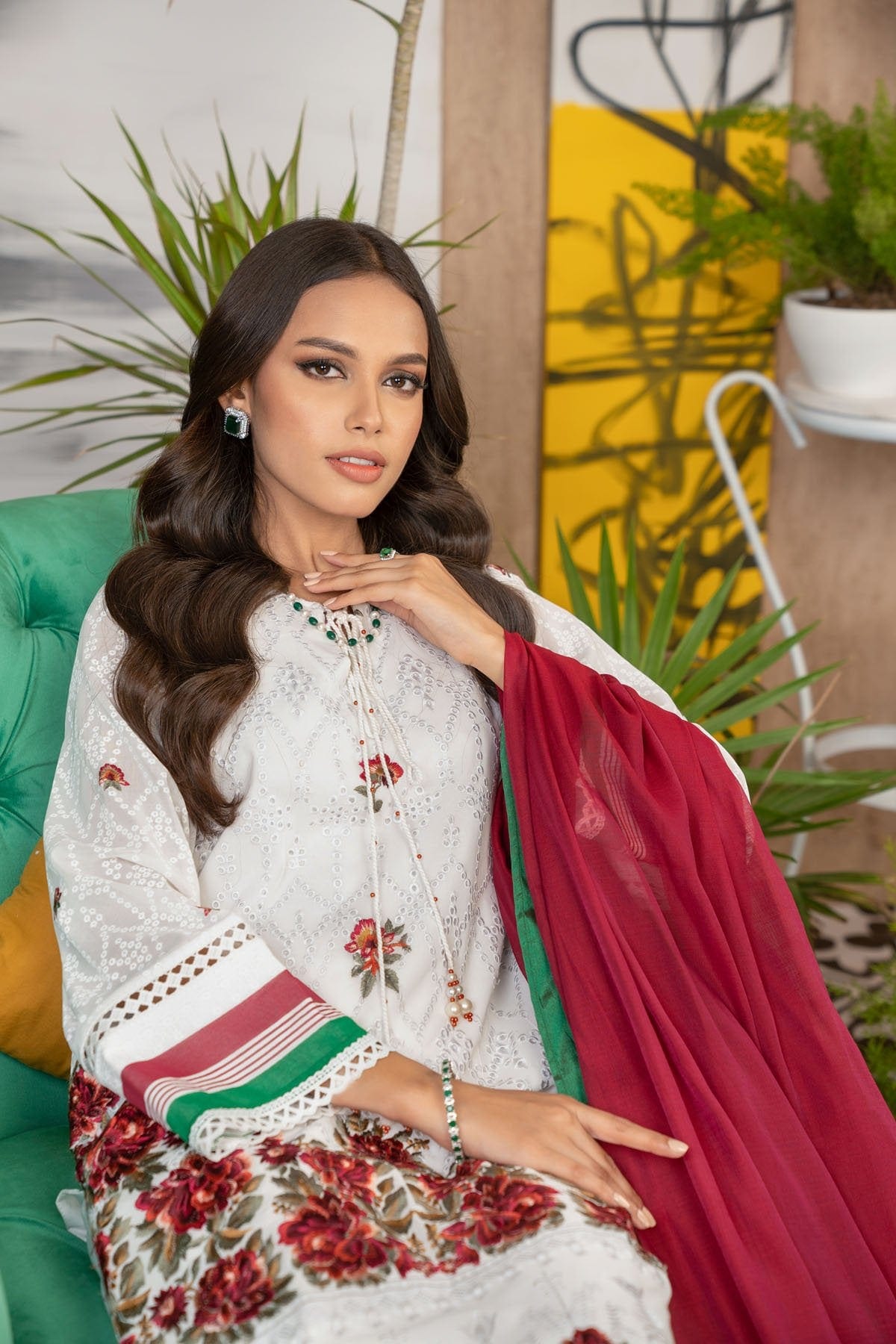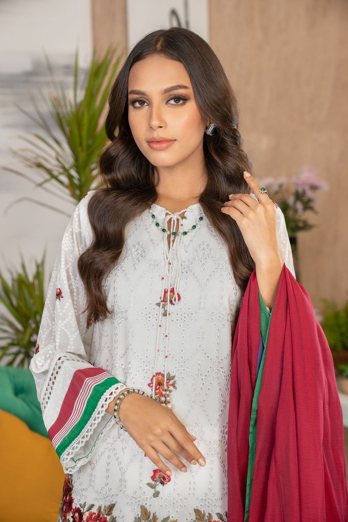 unstitched 3 piece embroidered swiss voile suit with yarn dyed dupatta season: mid-summer color: white shirt: embroidered swiss voile shirt 3.13 meters embroidered sleeves fabric: swiss voile dupatta: yarn dyed dupatta fabric: yarn dyed trouser: dyed cambric trouser fabric: cambric disclaimer: due to the difference in lighting used during photoshoots, the color or texture of the actual product may slightly vary from the image.