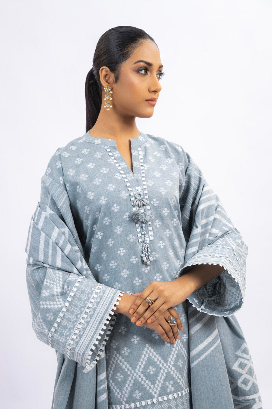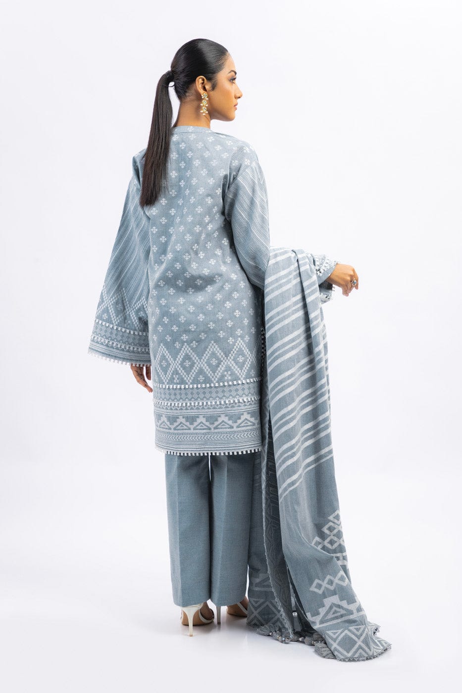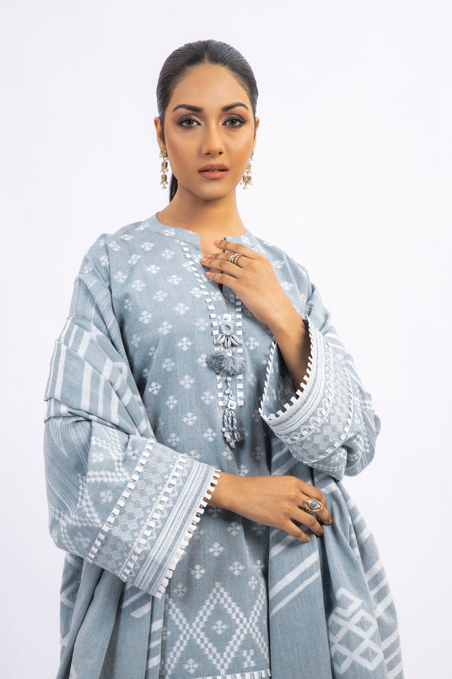 unstitched 3-piece shamery jacquard suit with shamery jacquard dupatta color: light blue shirt:: shamery jacquard shirt 3.13 meters fabric: jacquard dupatta:: shamery jacquard dupatta 2.50 meters fabric: jacquard trouser: : plain shamery trouser 1.80 meters fabric: shamery disclaimer: due to the difference in lighting used during photoshoots, the color or texture of the actual product may slightly vary from the image.