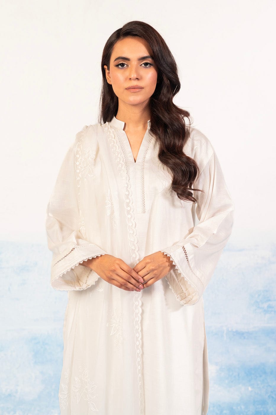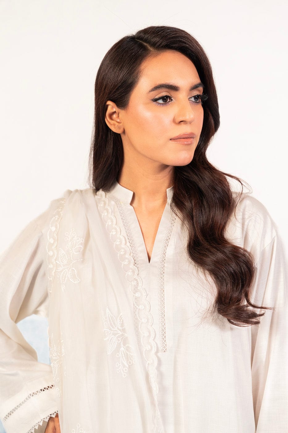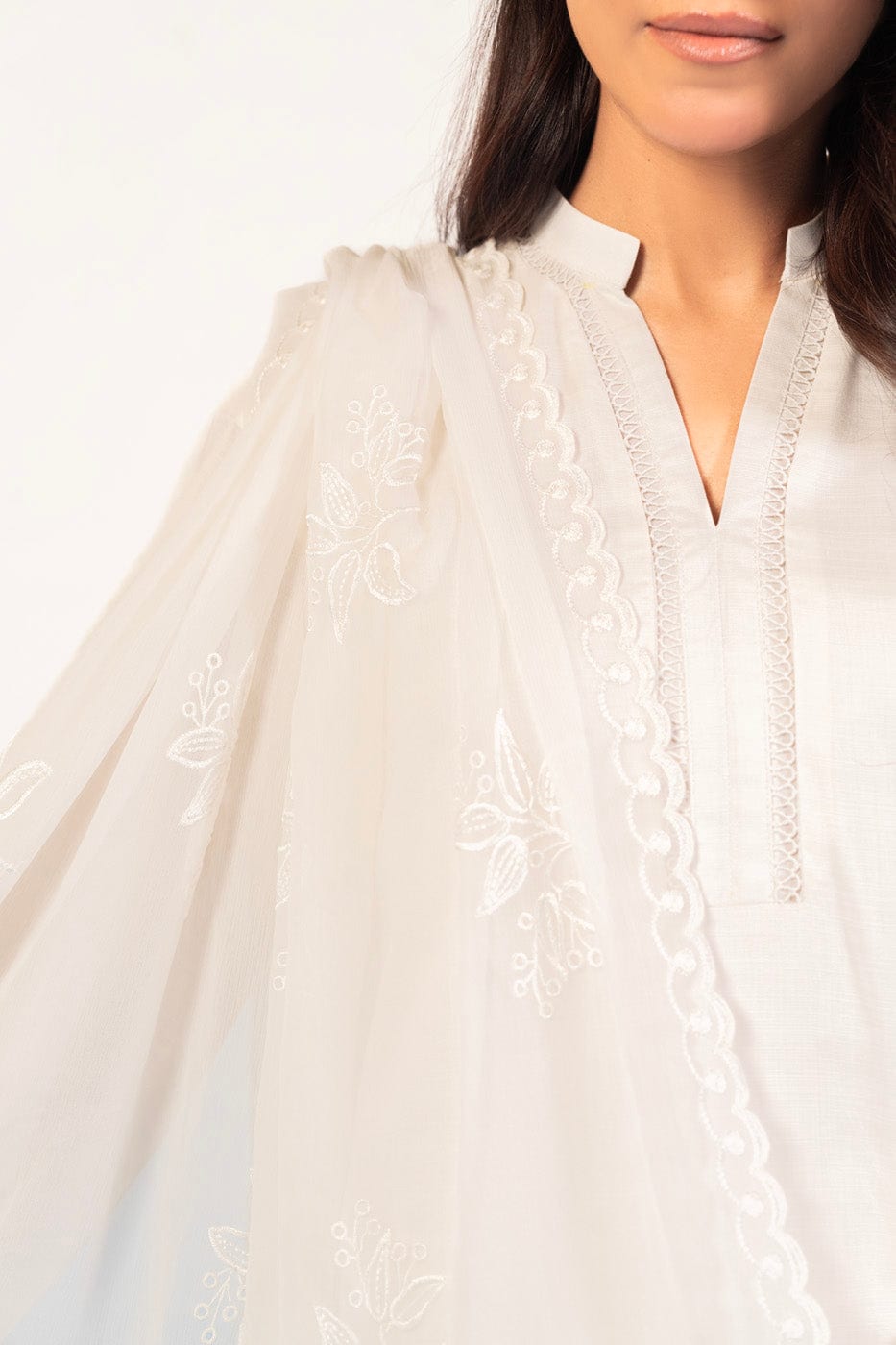 unstitched 1-piece embroidered chiffon dupatta color: white dupatta: embroidered chiffon dupatta 2.5 meters fabric: chiffon disclaimer: due to the difference in lighting used during photoshoots, the color or texture of the actual product may slightly vary from the image.
