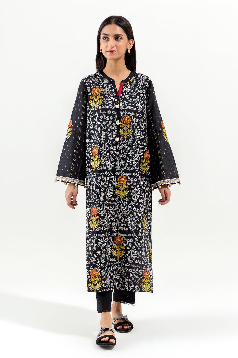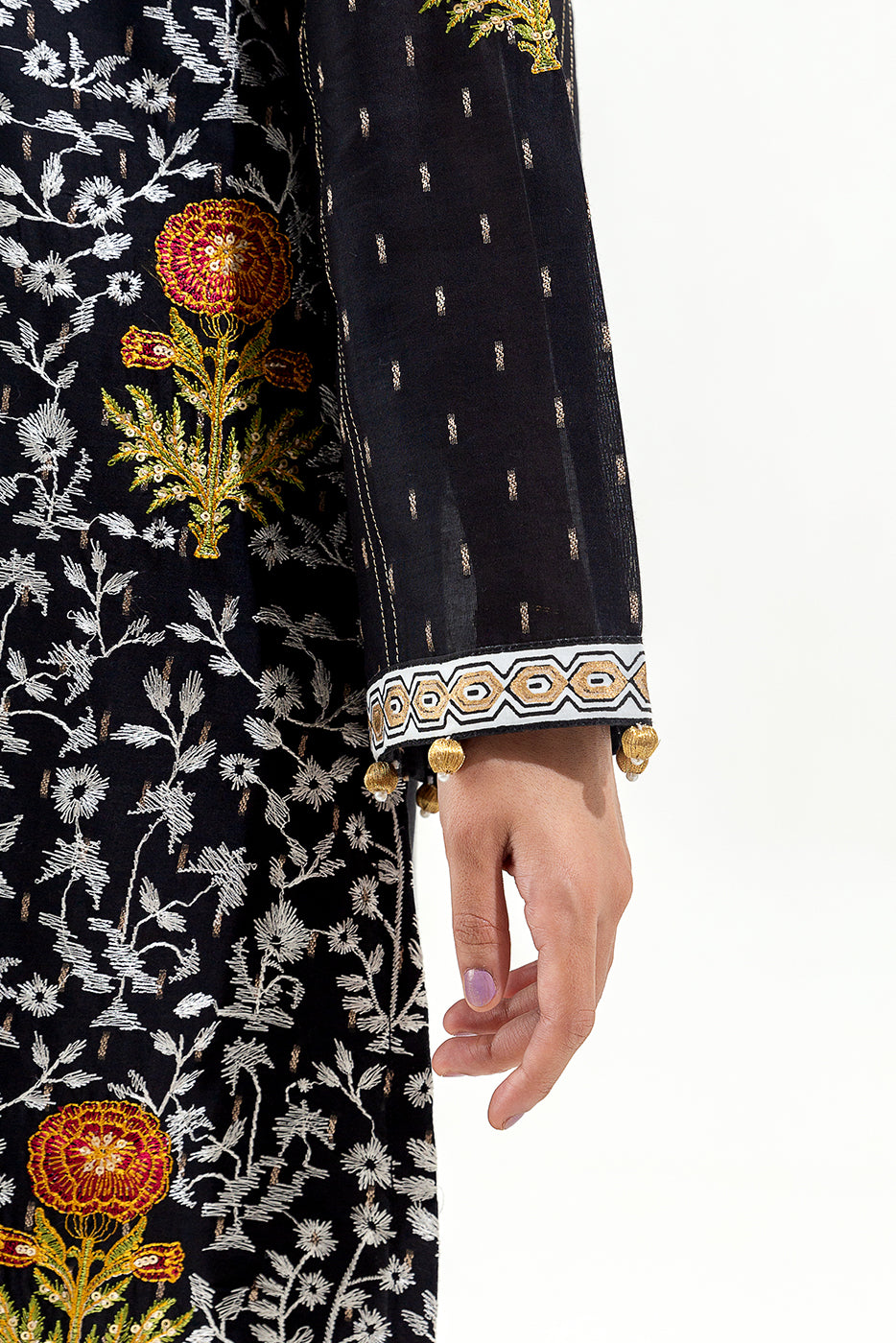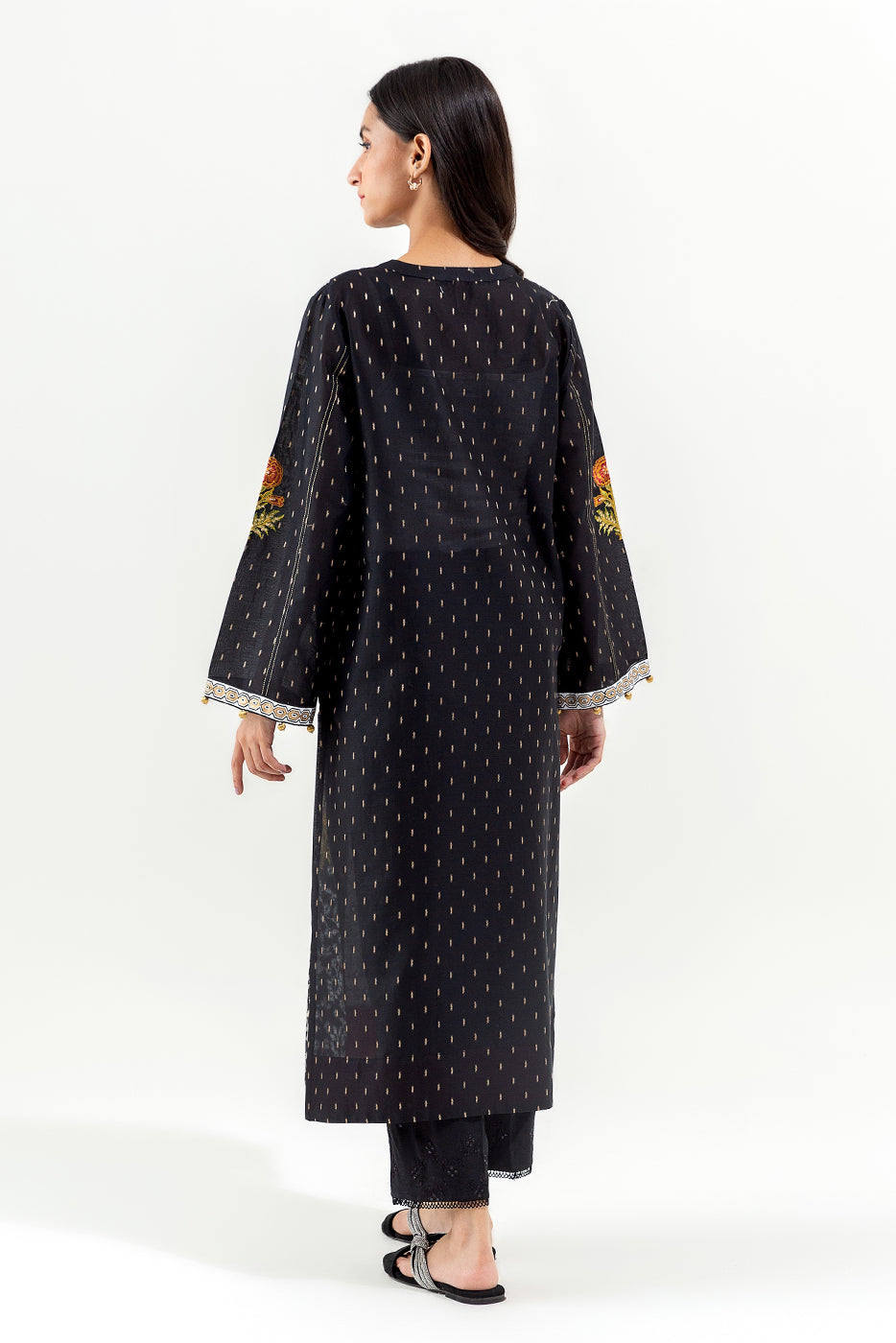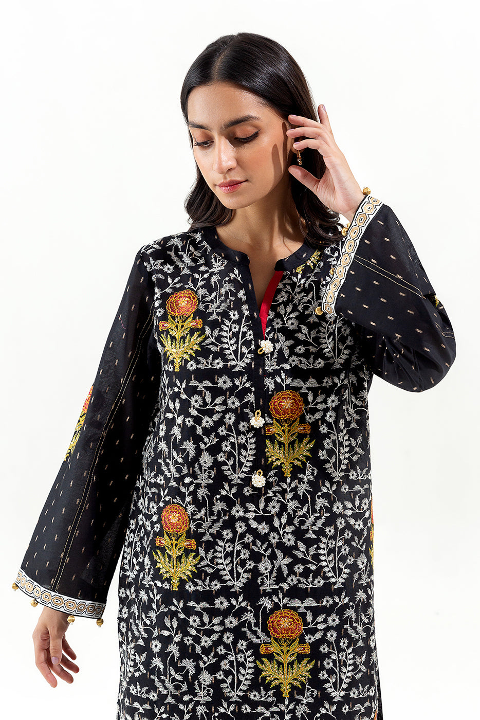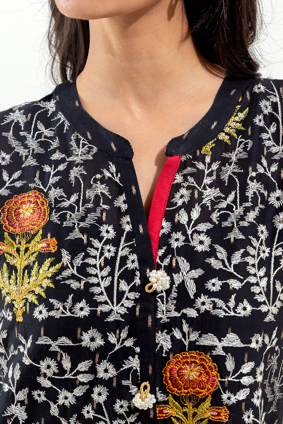 description: embroidered kurta with band neckline and placket.button detail on placket.embroidered sleeves with block patti.straight hem. fabric: jacquard what you'll get: shirt fit: casual fit size & fit: model height is 5'6" model is wearing 8 size