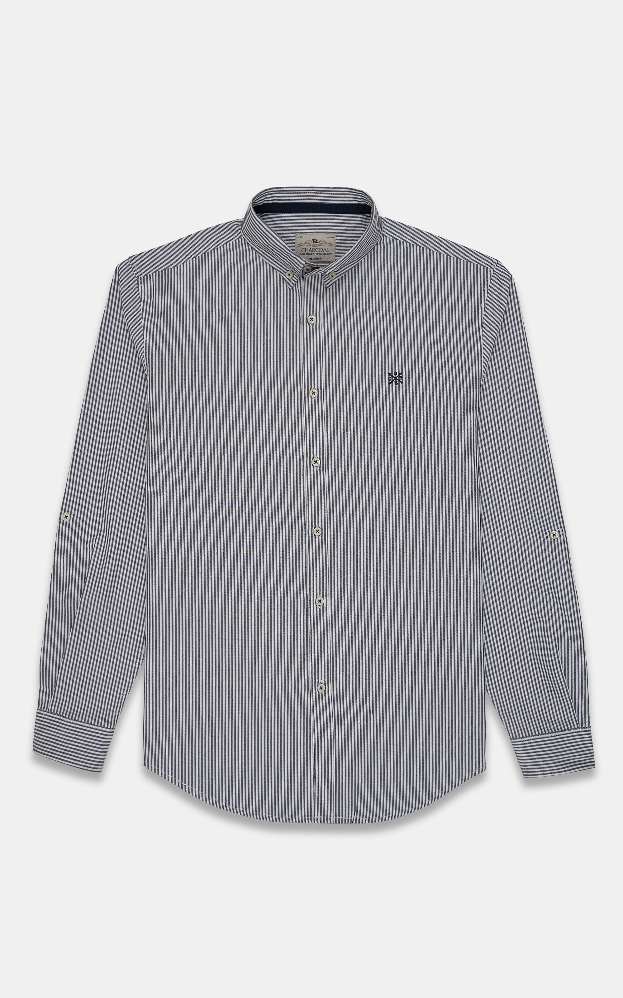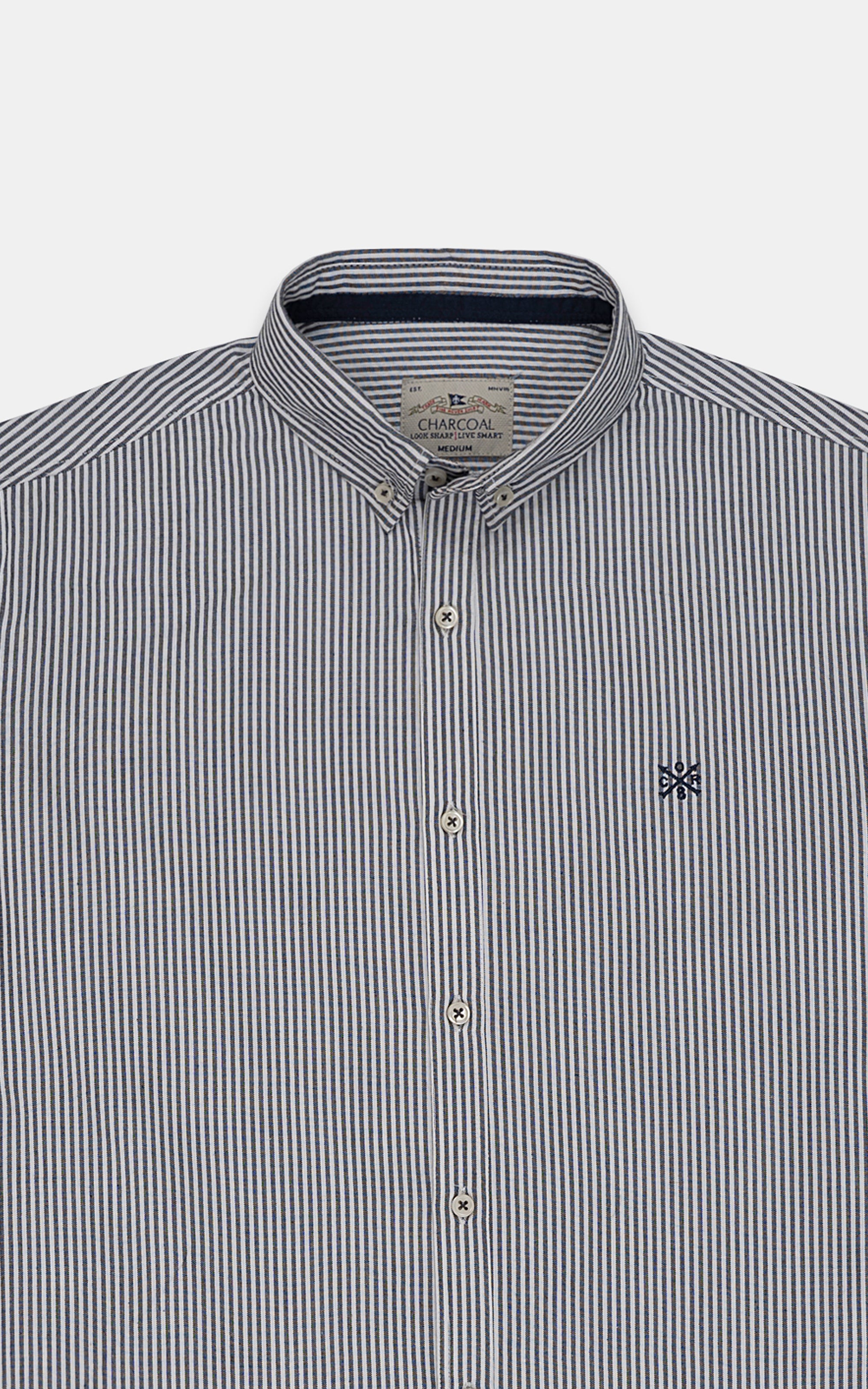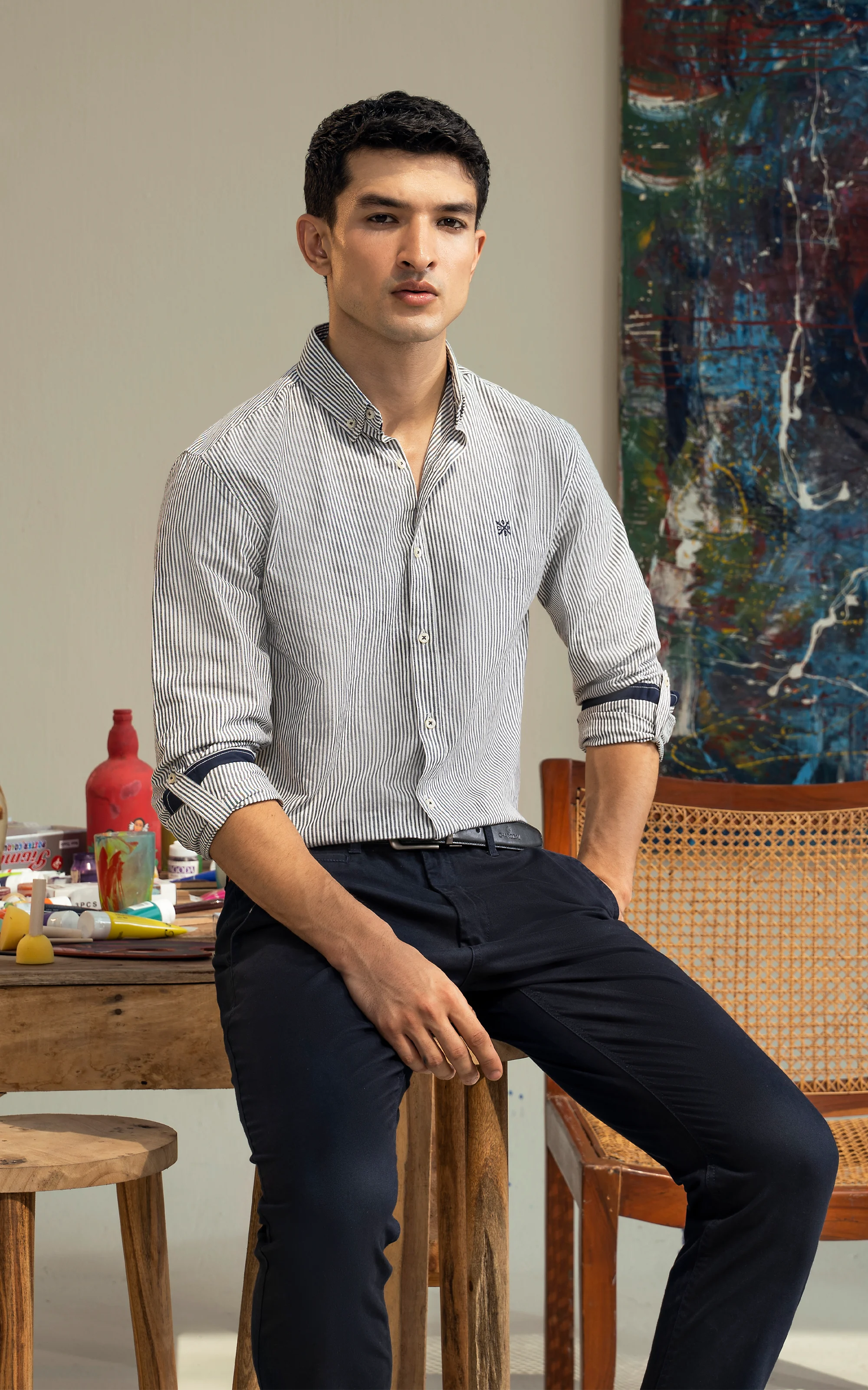 this shirt features full sleeves with a button-down collar and a stylish contrast band inside the collar. it boasts fashion bar tacks on the button placket and intricate front embroidery for added flair. the cuffs are half-contrast with a round design, and the shirt includes a back loop and knife pleats for a tailored look. contrast button threads enhance its overall style, while the stripe pattern and cotton-rich fabric ensure both comfort and sophistication