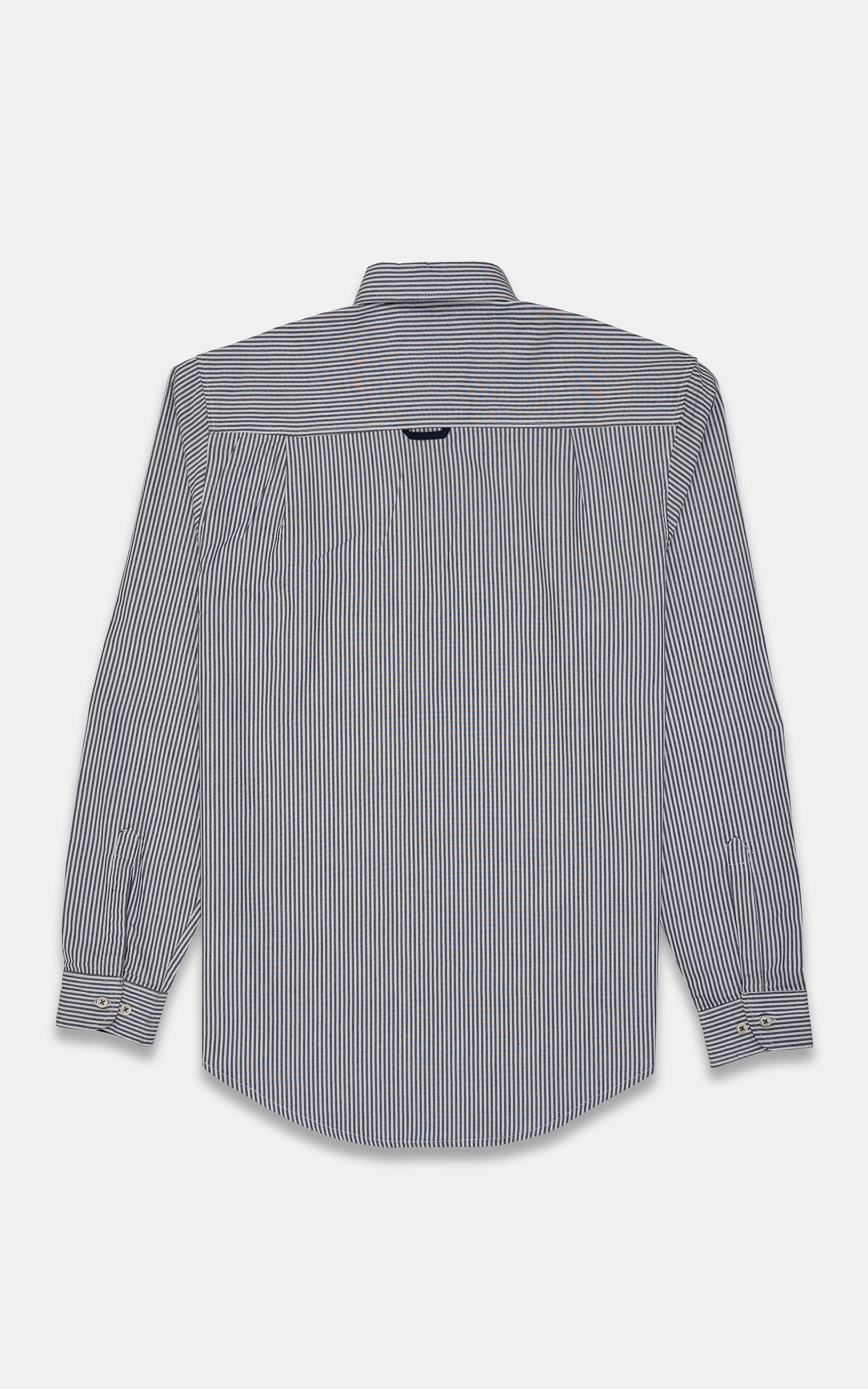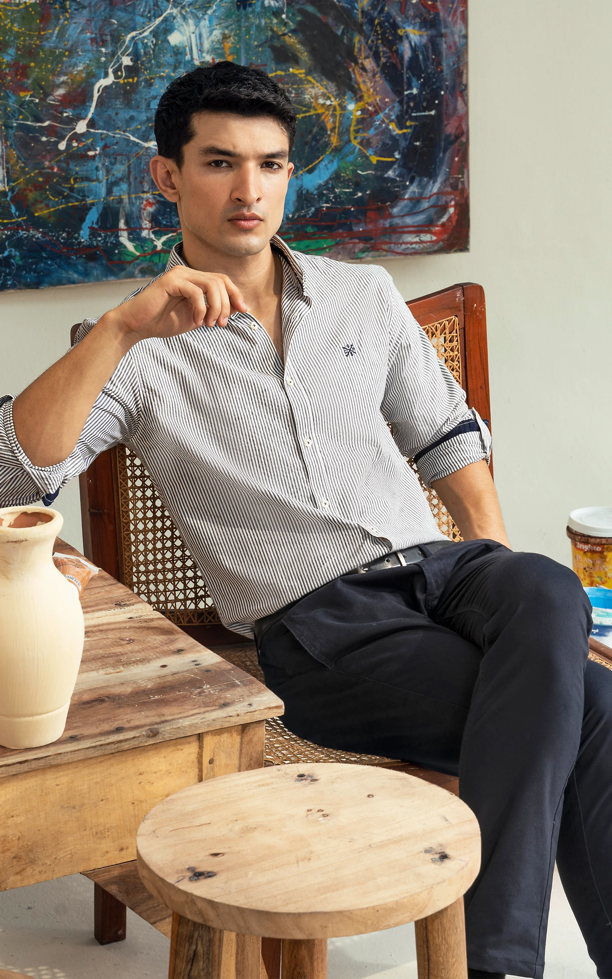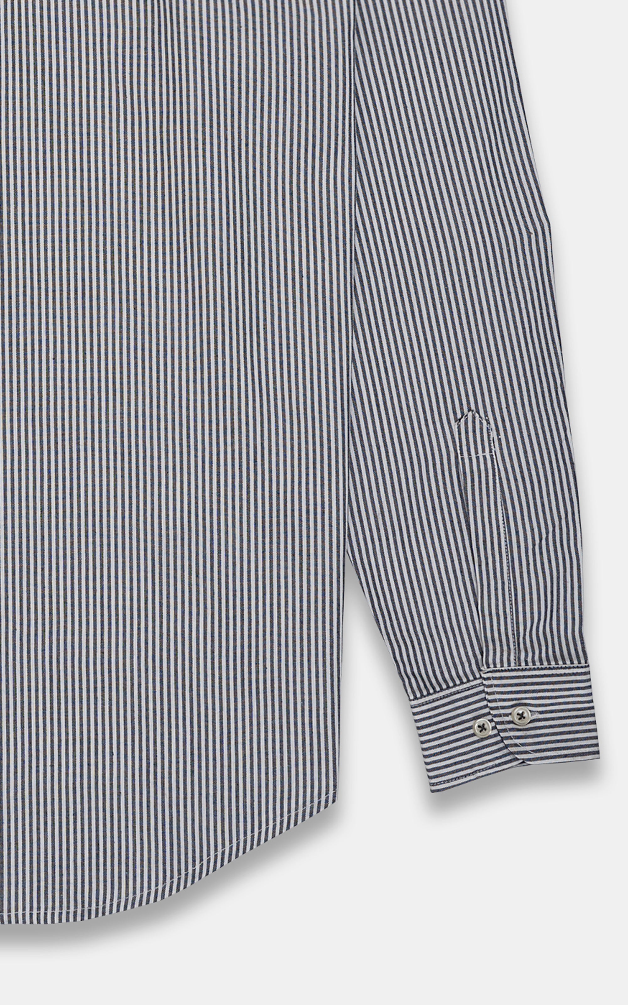 this shirt features full sleeves with a button-down collar and a stylish contrast band inside the collar. it boasts fashion bar tacks on the button placket and intricate front embroidery for added flair. the cuffs are half-contrast with a round design, and the shirt includes a back loop and knife pleats for a tailored look. contrast button threads enhance its overall style, while the stripe pattern and cotton-rich fabric ensure both comfort and sophistication