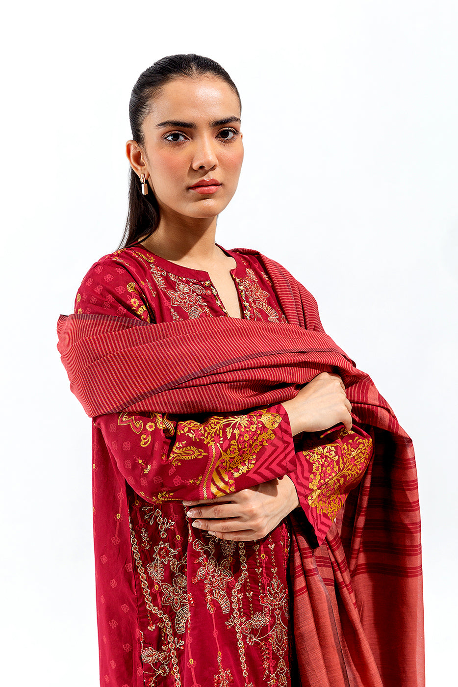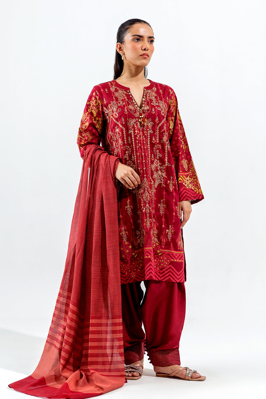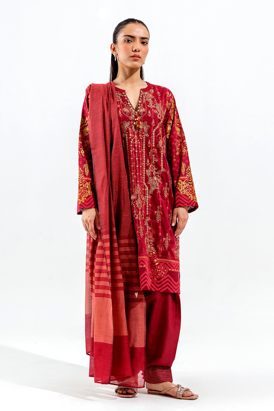 description: basic band collar neckline with embroidered front . hand embellished detail on neck paired with yarn dyed dupattan and matching skinny shalwar. fabric: lawn what you'll get: shirt+dupatta+pants fit: casual fit size & fit: model height is 5'6" model is wearing 8 size