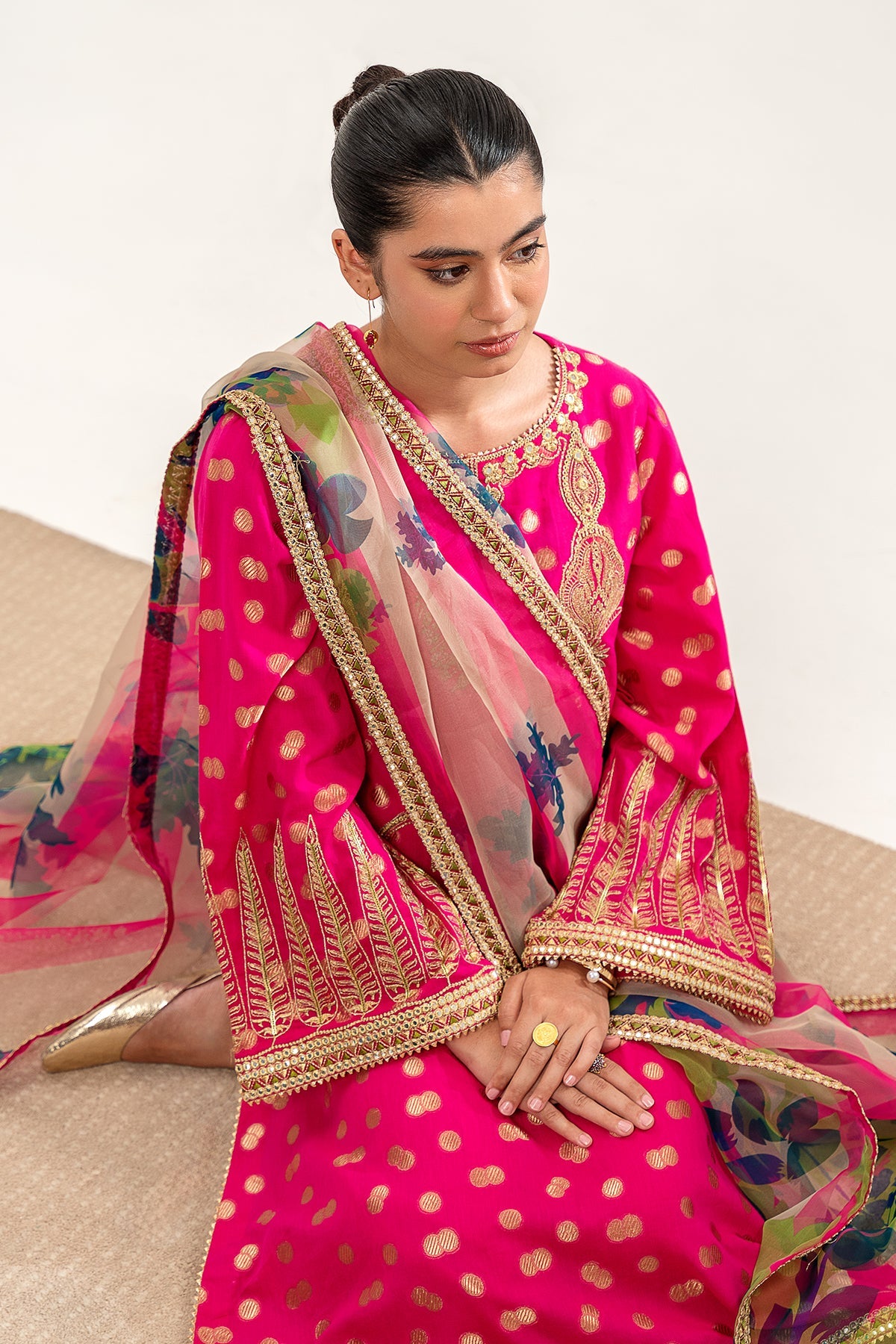 shirt : magenta lawn embroidered shirt with printed neck fashion and sleeve fashion. trouser : lawn plain trouser finished. dupatta : zari lawn dupatta with printed fashion. xs s m l measurement length 36" 36" 38" 38" flare/ daman width 26" 26" 26" 26"