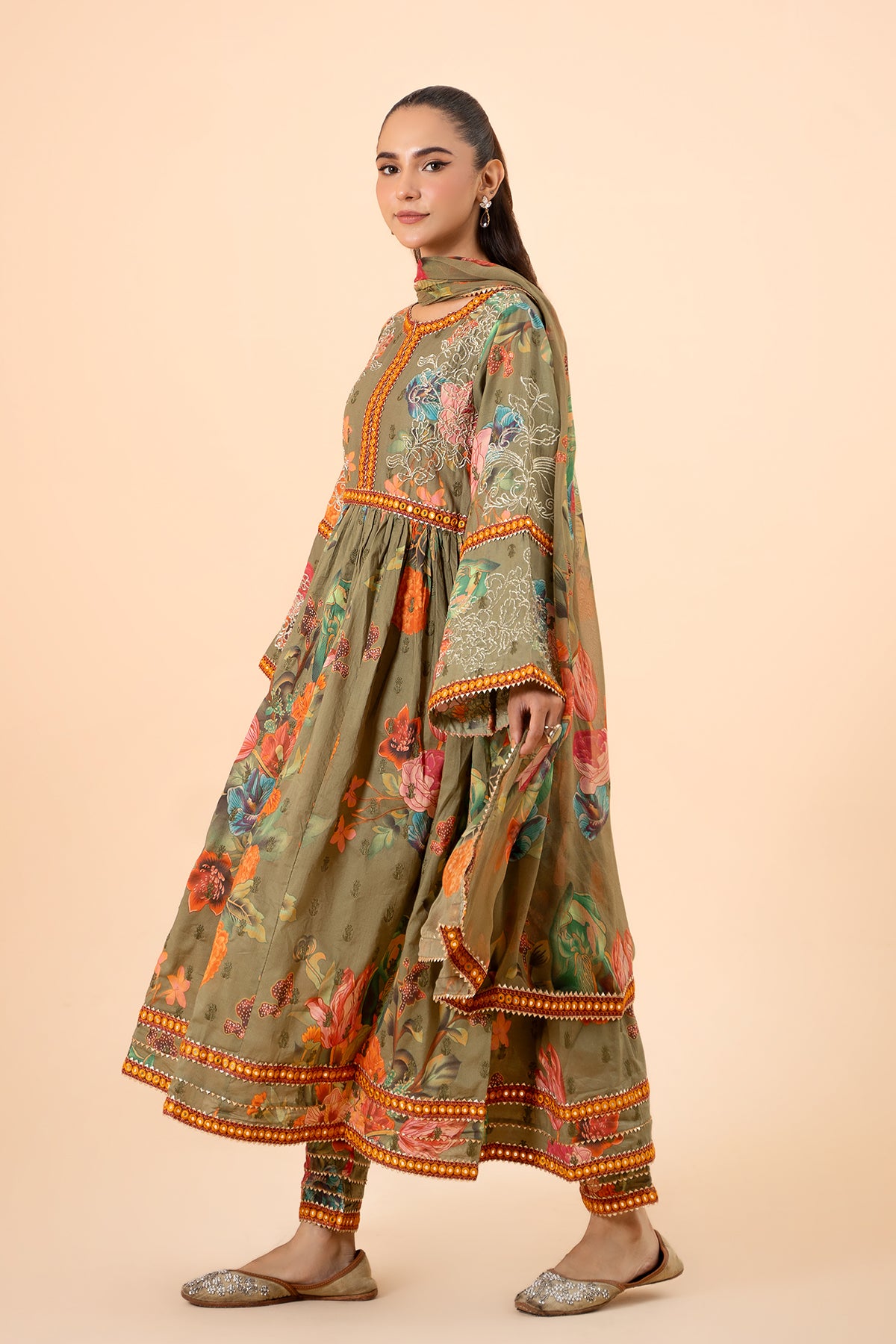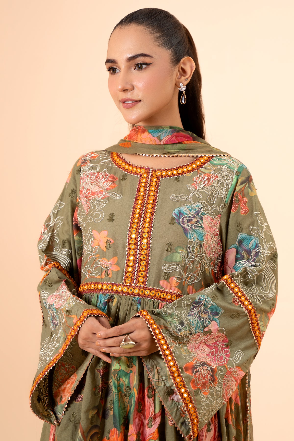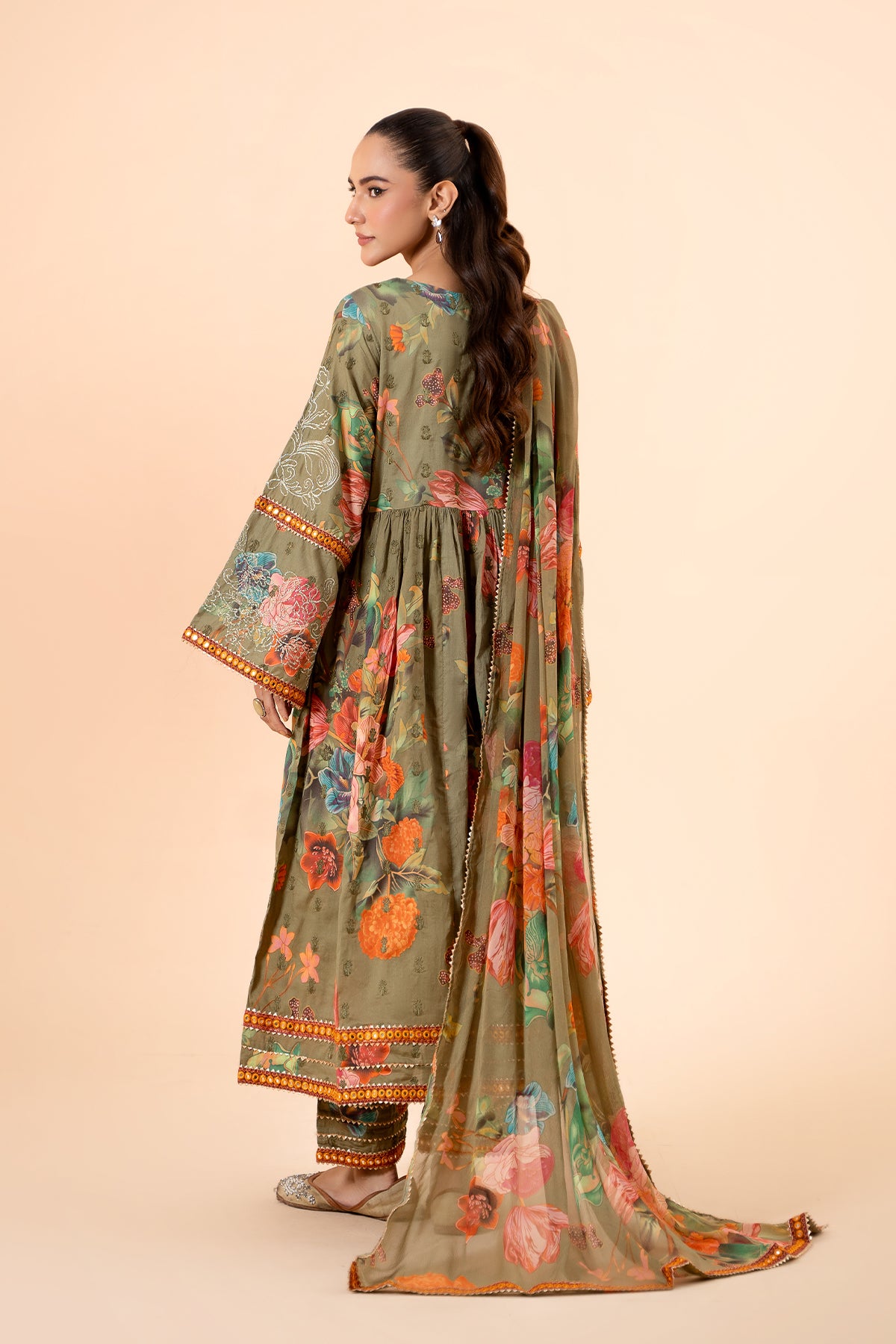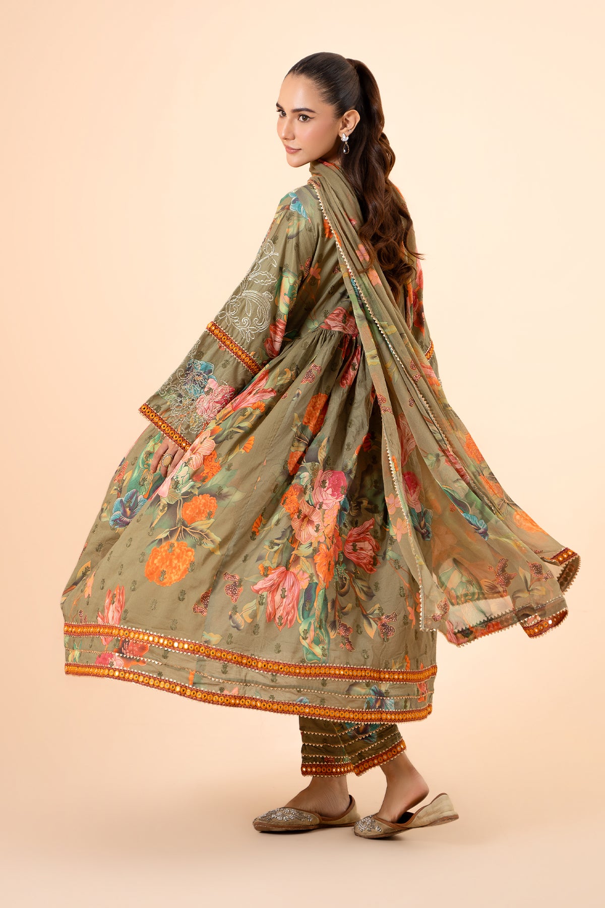 - lawn digital olive printed pleated shirt finished with front emb youk, sleeves patti, neckline patti with all over daman patti. - printed finished trouser - printed bamber chiffon dupatta. size s m l measurement length 46" 48" 48" flare/ daman width 115" 115" 115"