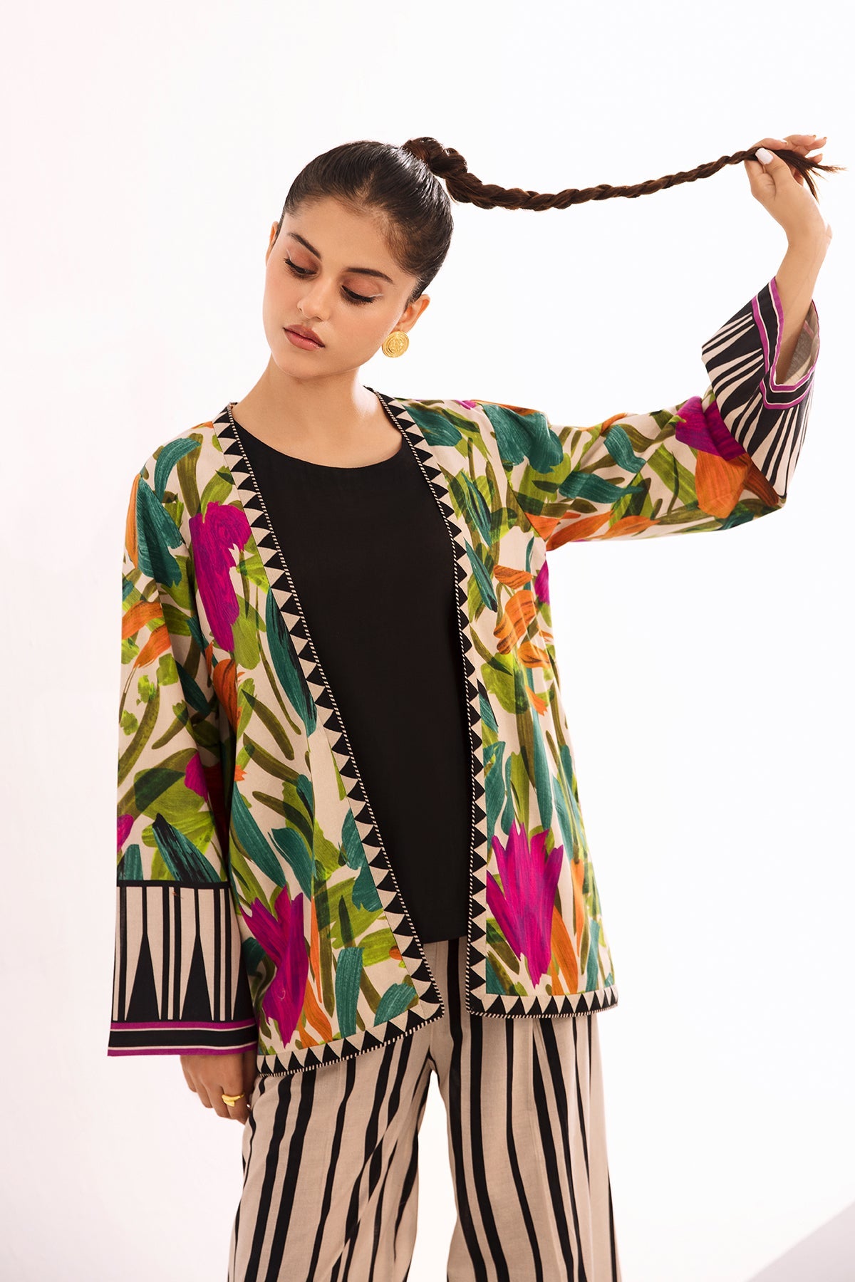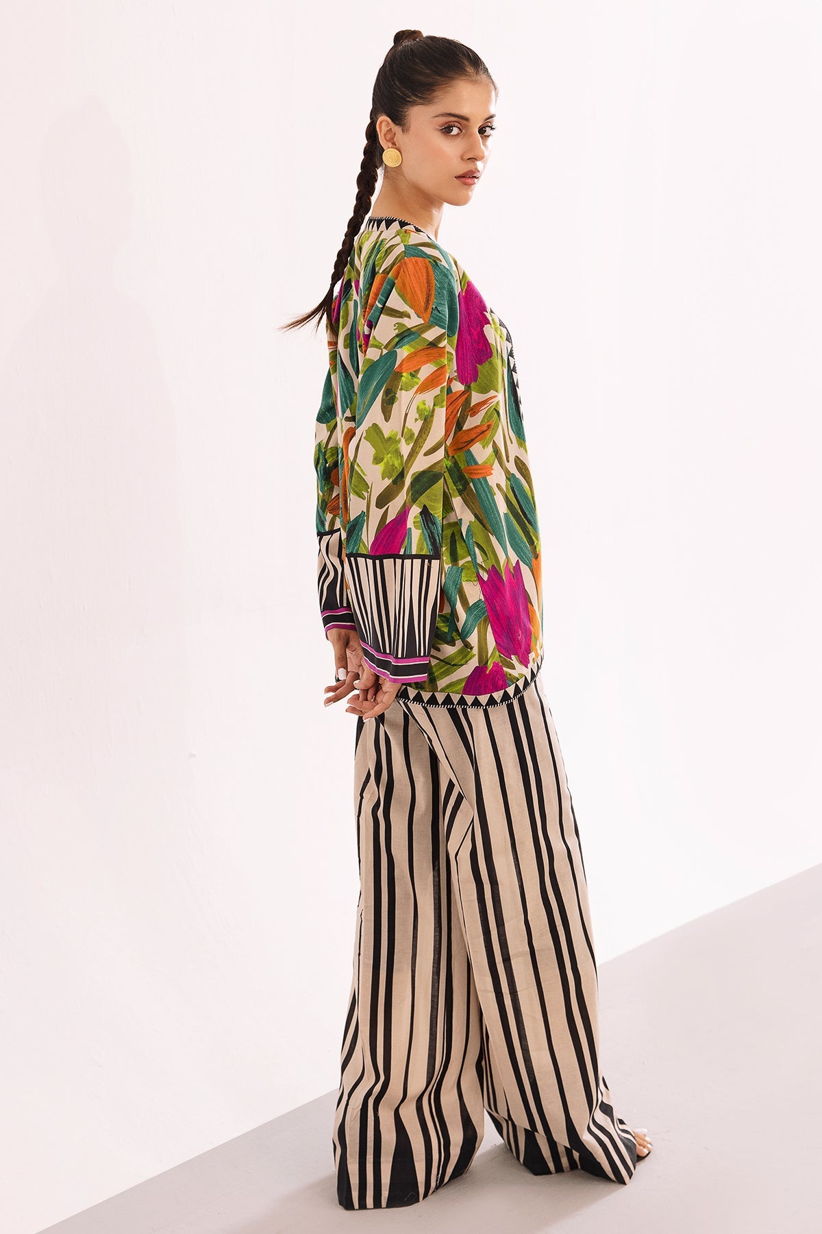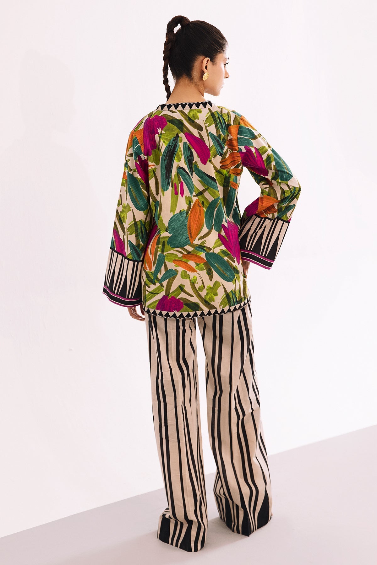shirt: multi color raw silk printed shirt jacket with inner shirt, printed sleeves and front lace for finishing. trouser: raw silk printed trouser finished with stitching detail." size s m l measurement length 26" 28" 30" flare/ daman width 24" 26" 28"