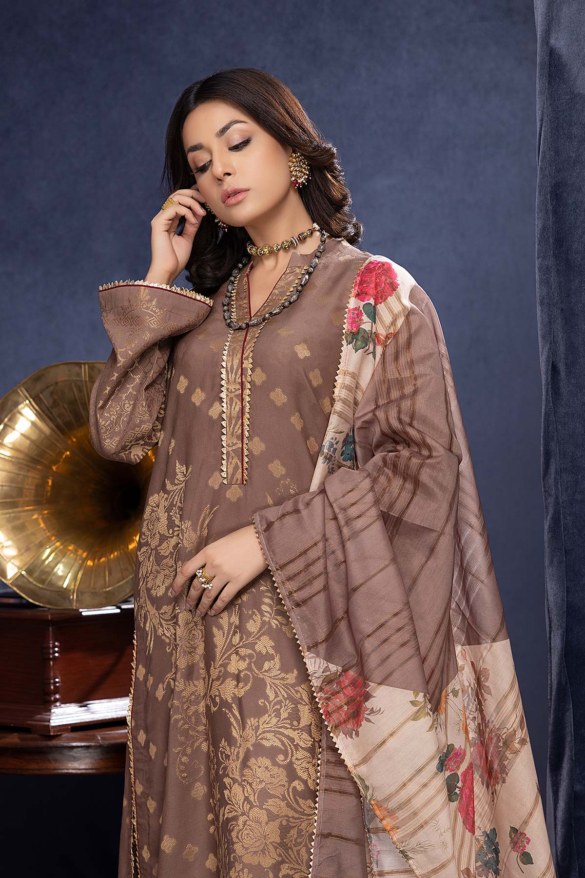 - broshia jequared shirt - front back and sleeves finished with laces and stitching details - digital printed zaari organza dupatta finished with laces and stitching details - linen qlot trouser finished with lace and stitching details body length xs 45",s 45",m 46", l 46"