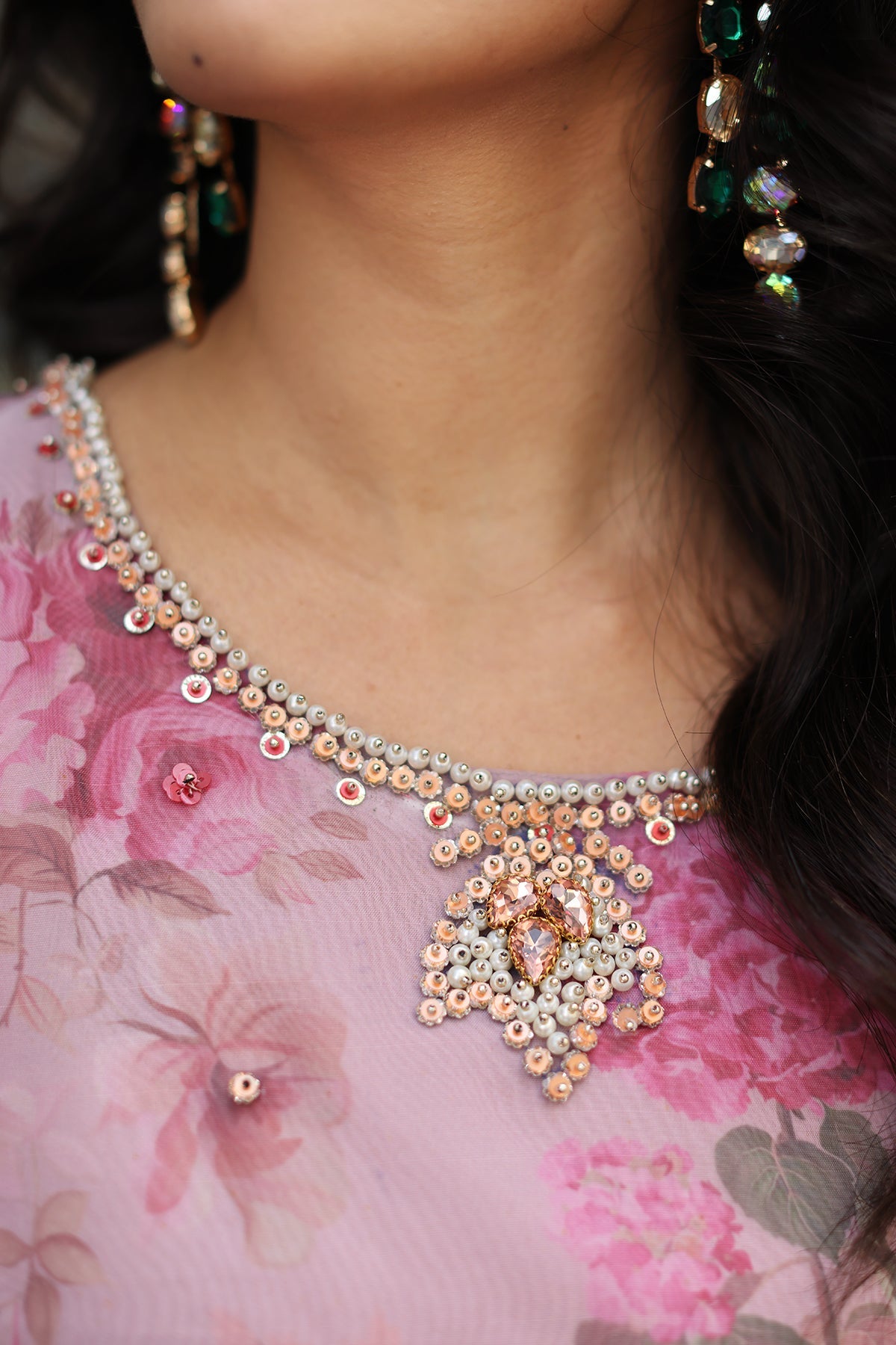 shirt : organza printed shirt with embroidered front neck,embroidered sleeves lace,embroidered front back daman lace and chok lace.raw silk inner shirt. embellished with adda work and patch work. finished with stitching detail. trouser : raw silk trouser with organza printed trouser fashion. finished with stitching detail. dupatta : organza printed dupatta with embroidered 4 side dupatta lace. size : s m l measurement length 42" 44" 46" flare/daman width 23" 25" 27"