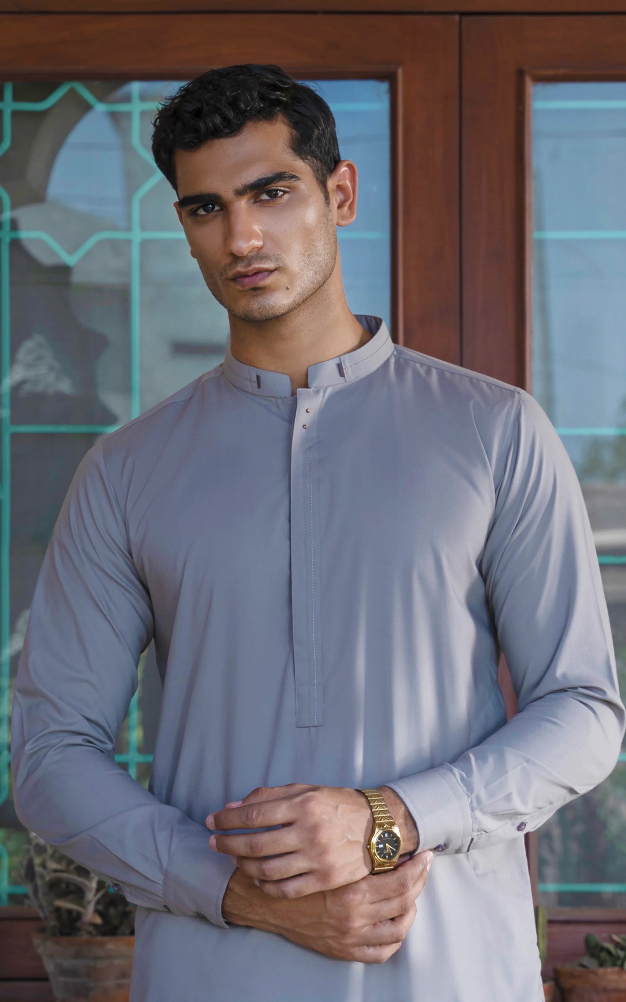 this fabric is constructed from special fibres of polyester and viscose. this fabric is fine and eminently blended. it strives to give comfort and has an elegant look. this article is available in light colors. mandarin ban stitching details on ban hidden placket stitching and trim details on front placket dtm buttons inside stitching details on sleeve placket cut cuff straight hem wash & wear fabric