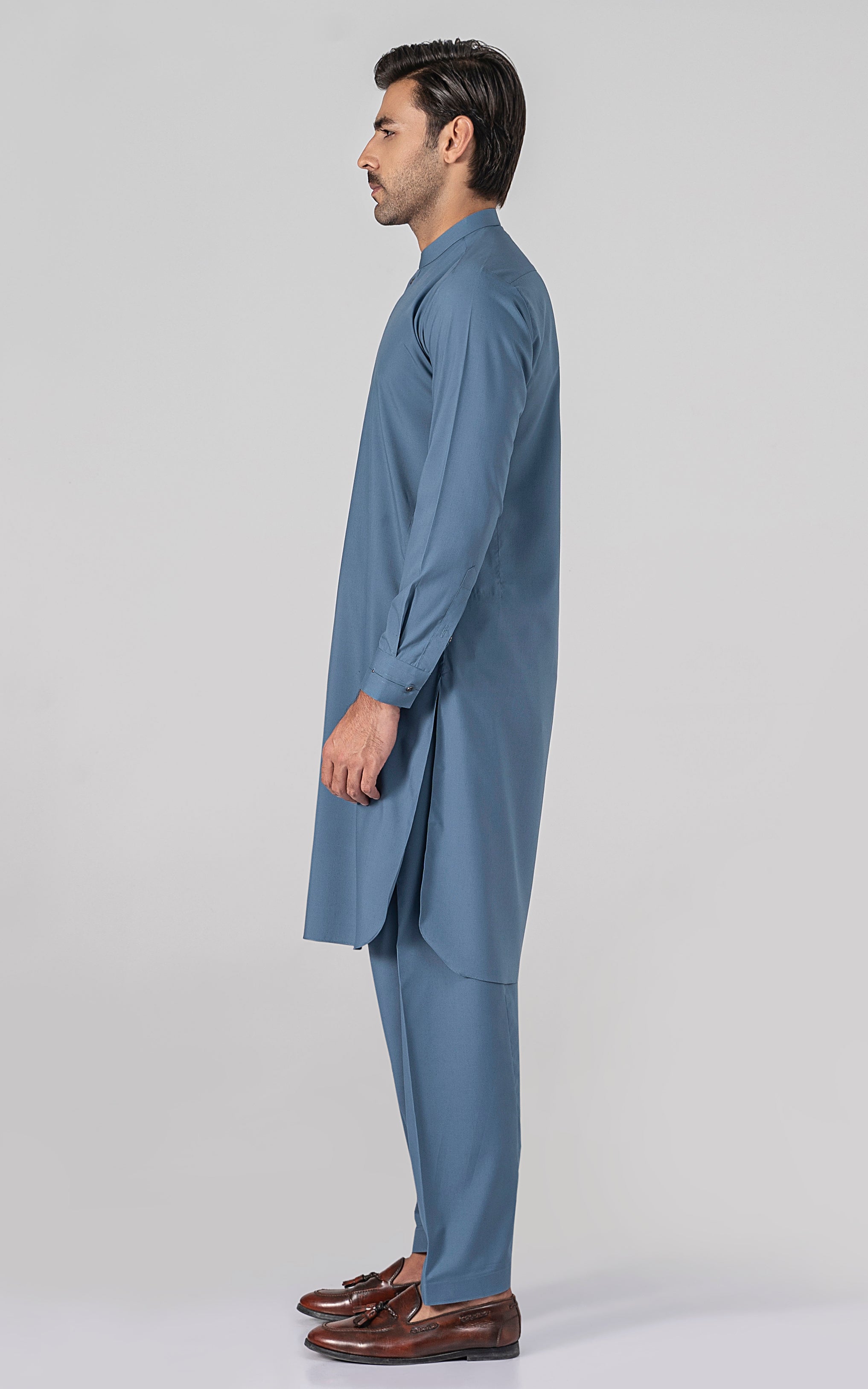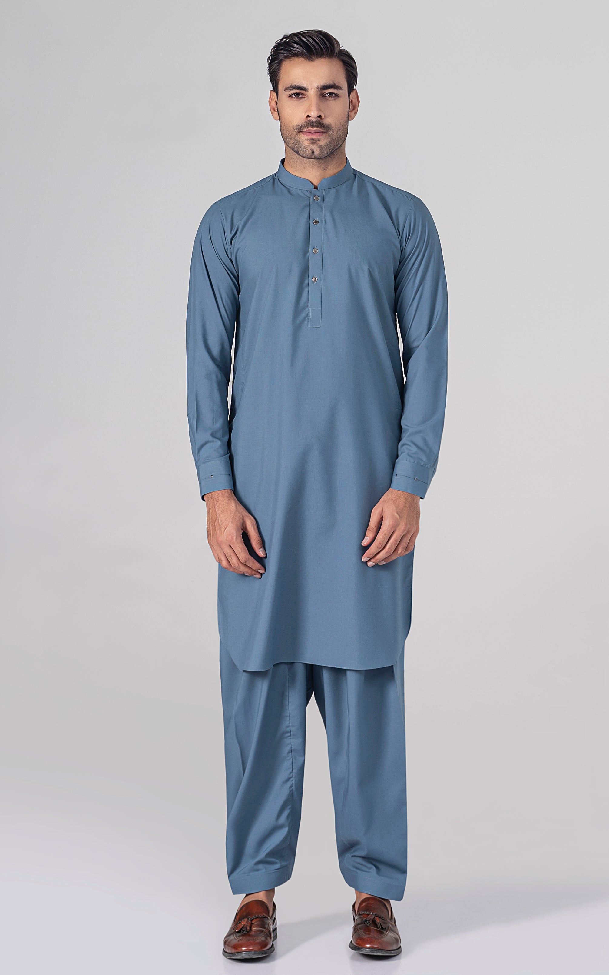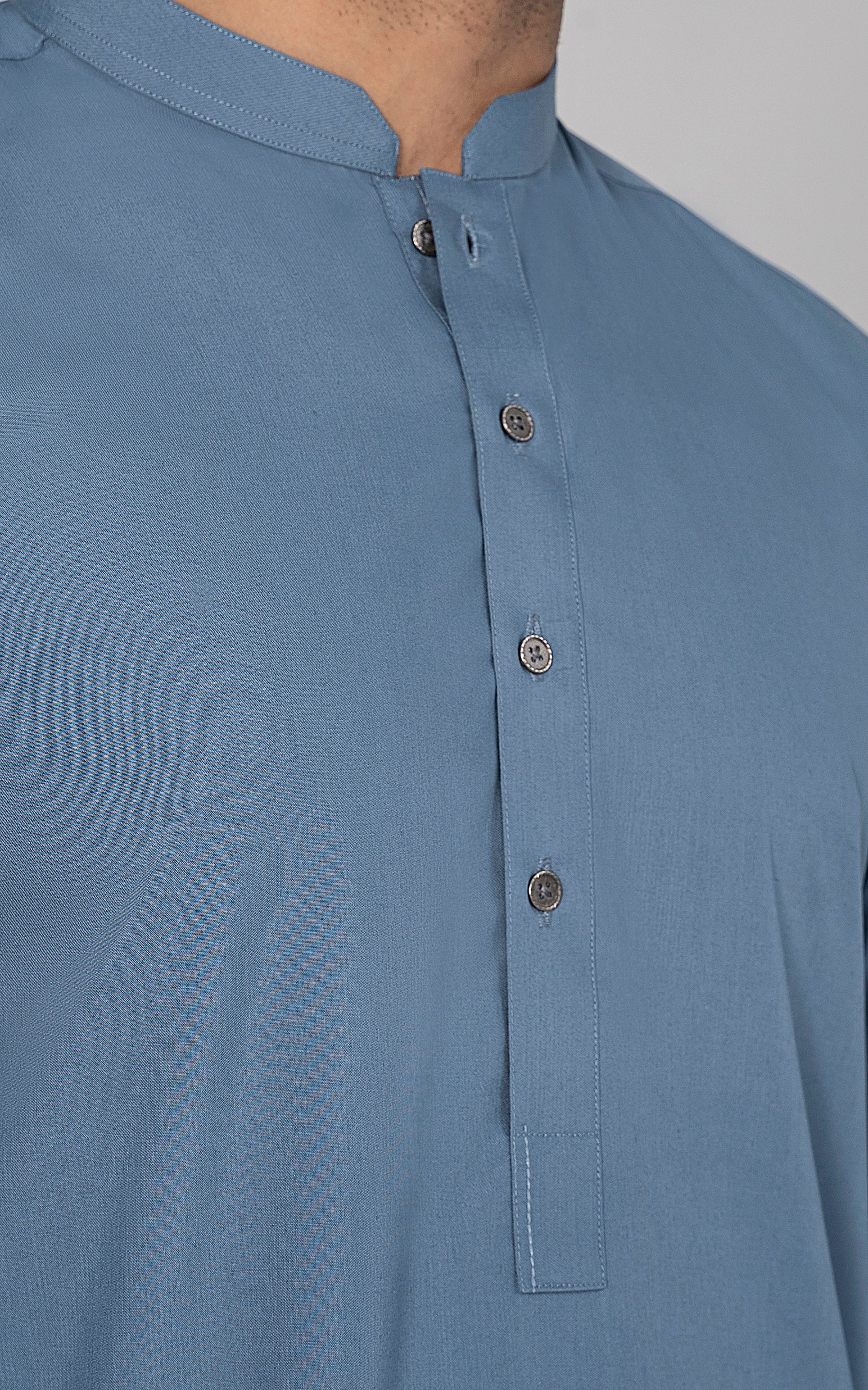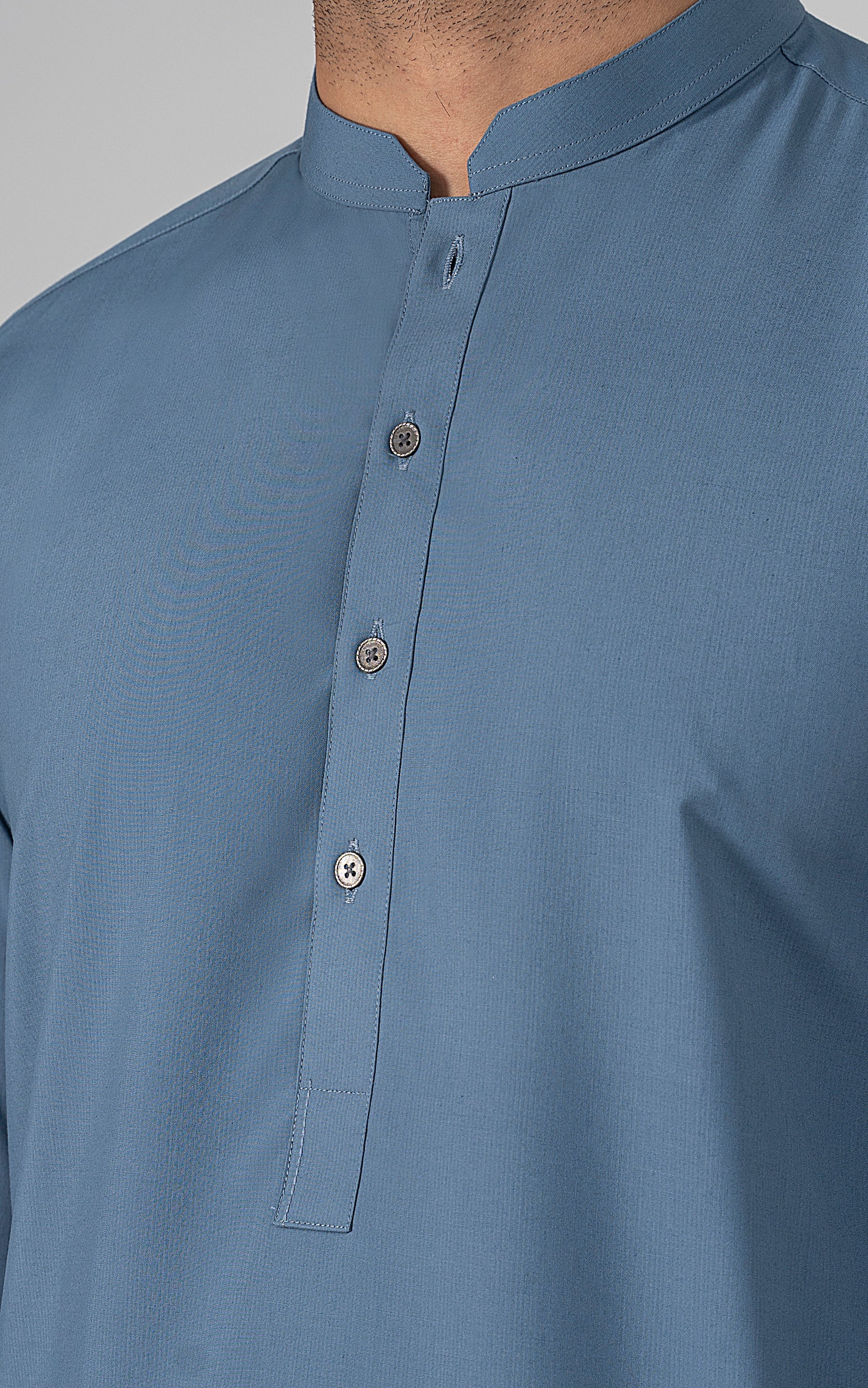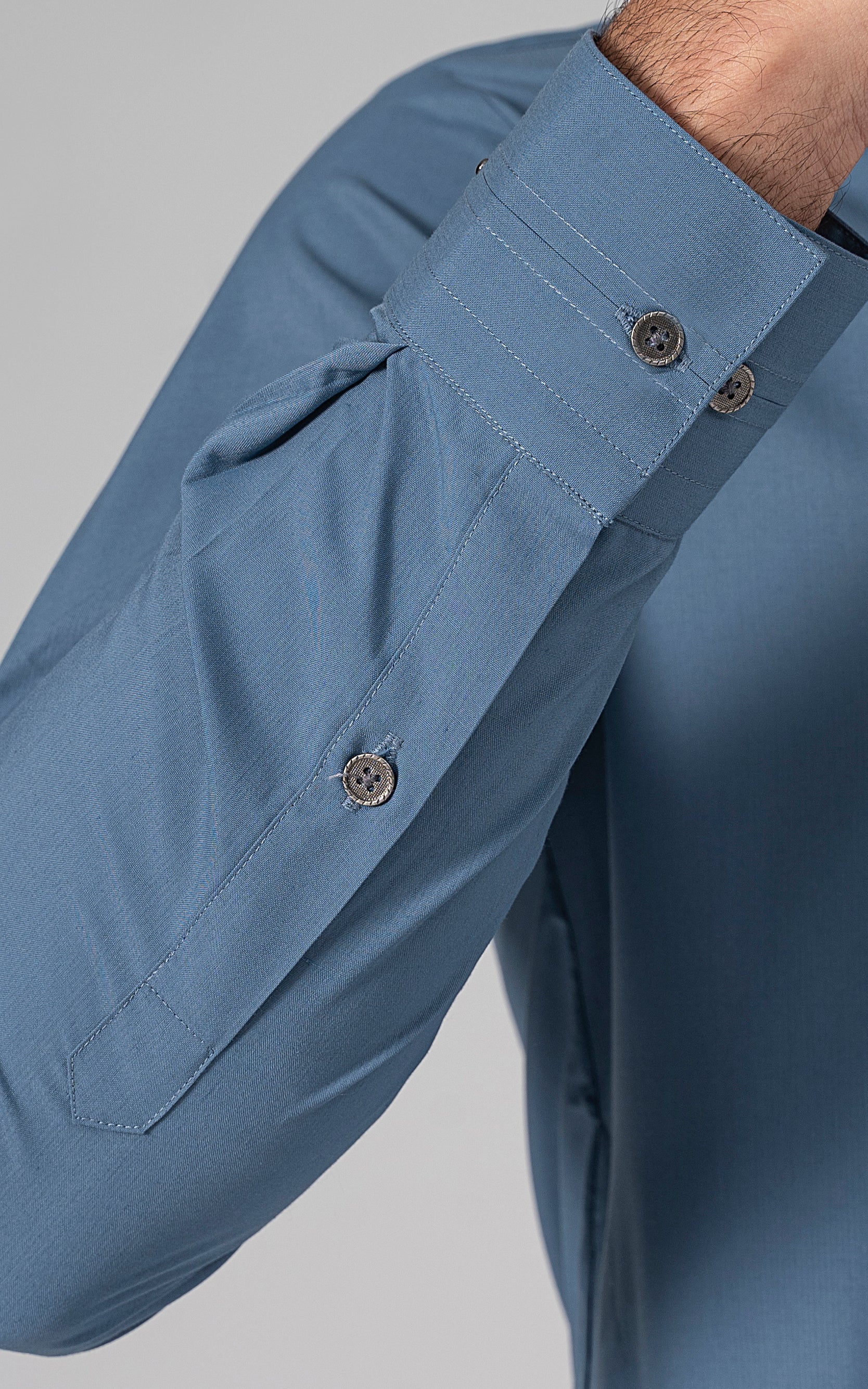 this fabric is ethereal and eminent blend of polyester and viscose. it is a marvelous fabric with a delicate touch and is admirably lustrous. elevate your wardrobe with this versatile garment, designed to ensure comfort in every wear. this article is available in light and dark hues. angled ban, piping on button placket, stitching details on front and sleeve placket, visible placket, metal buttons, straight cuff, stitching and trim details on cuff, round hem, wash & wear fabric.