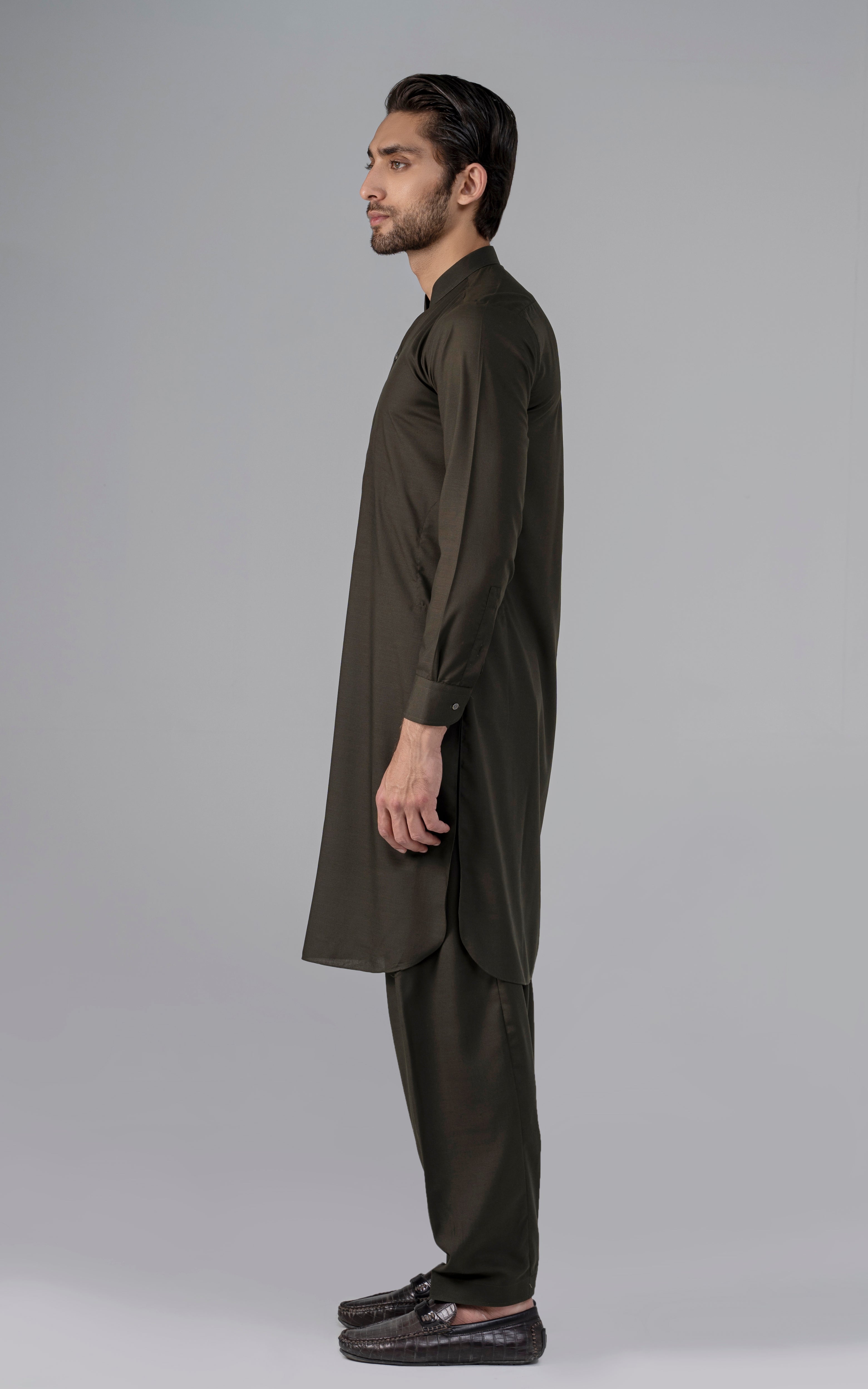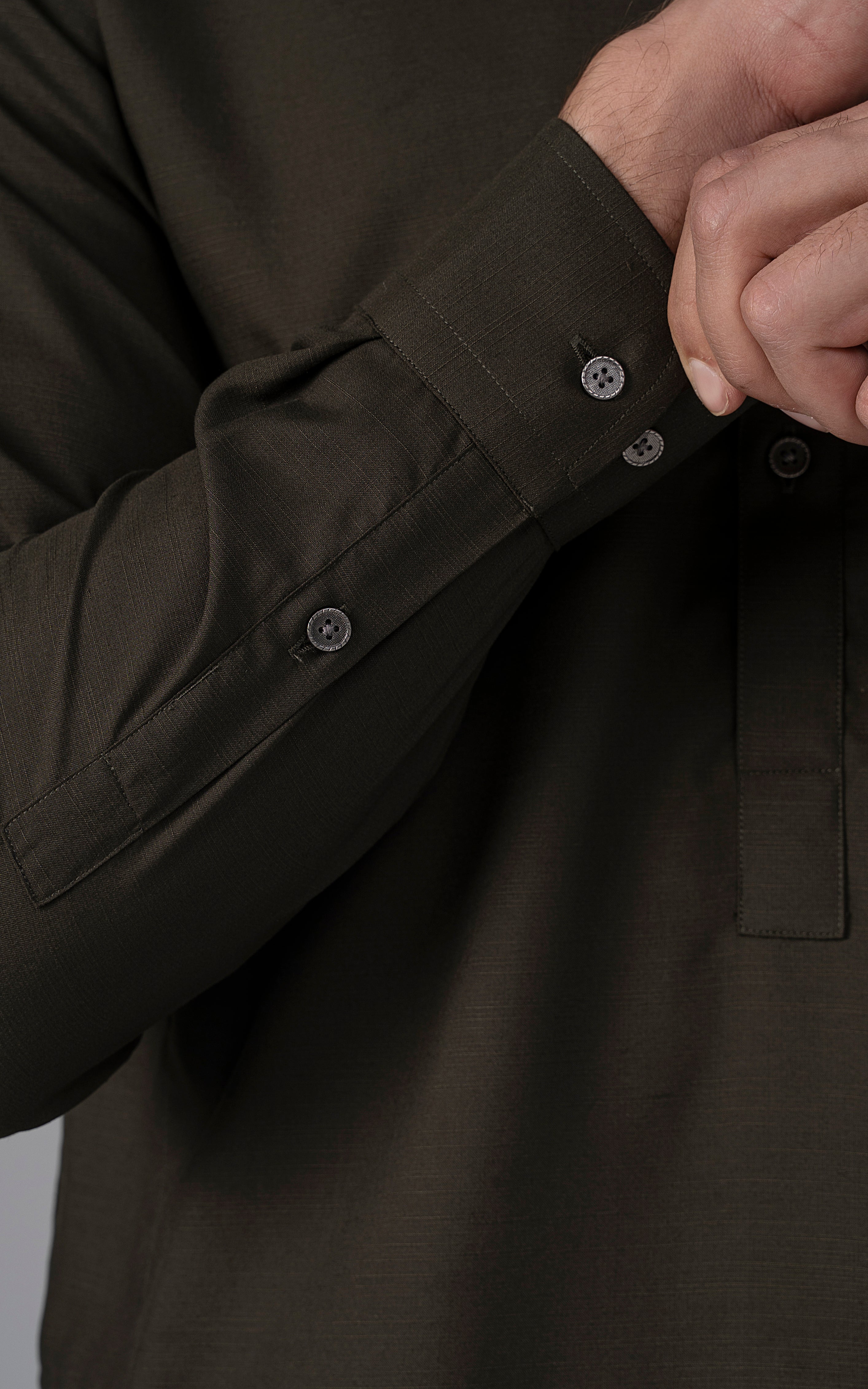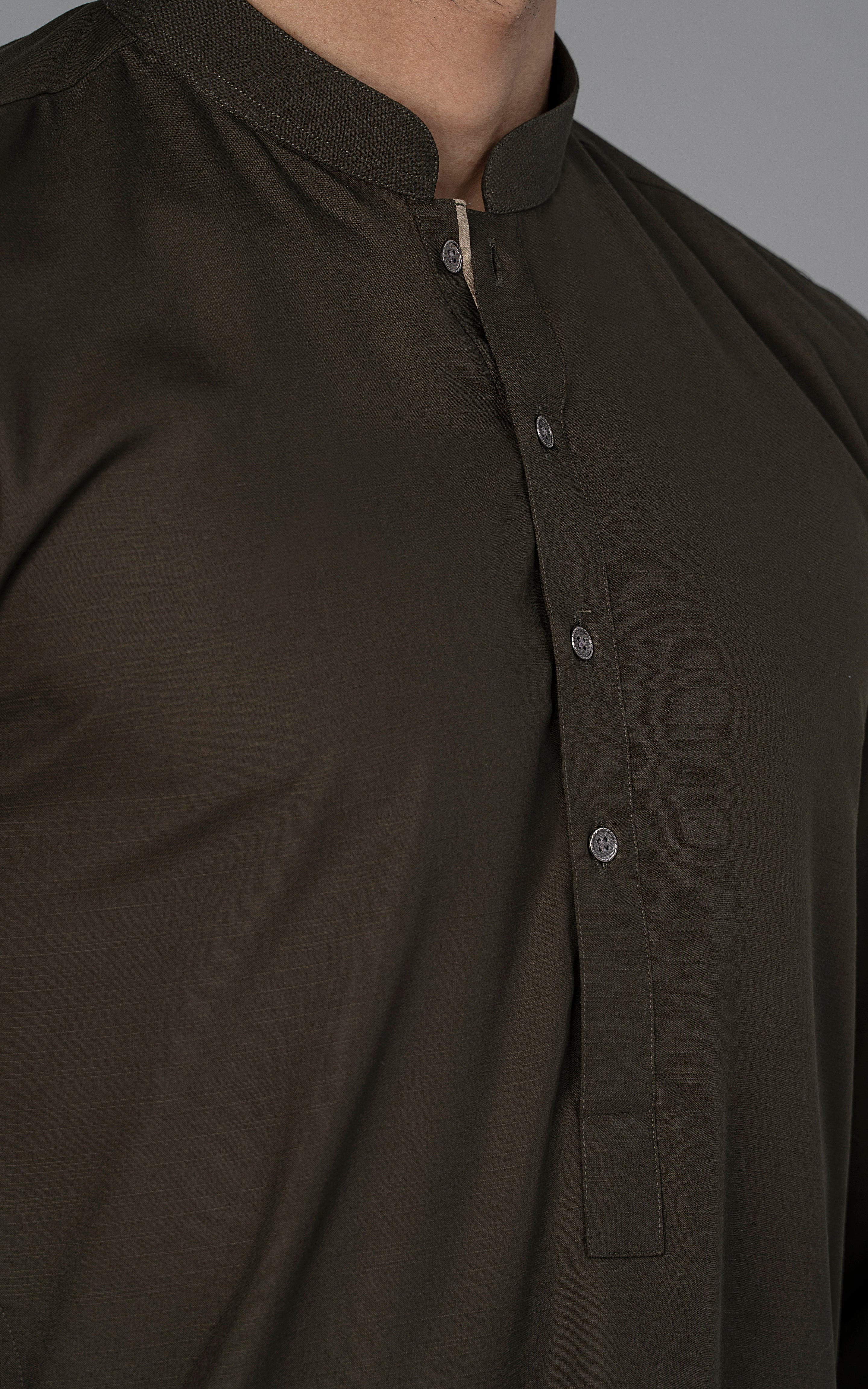 a slubbed fabric is created with slight knots and knobbles, which can be seen as thicker. these 'imperfections' are either a characteristic of the yarn, or created purposely with the intention of giving the fabric an organic, tactile look and feel. this slub fabric is an opulent union of two exceptional fibres of polyester and viscose. mandarin ban, piping on button placket, visible placket, round cuff, round hem, metal buttons, wash & wear
