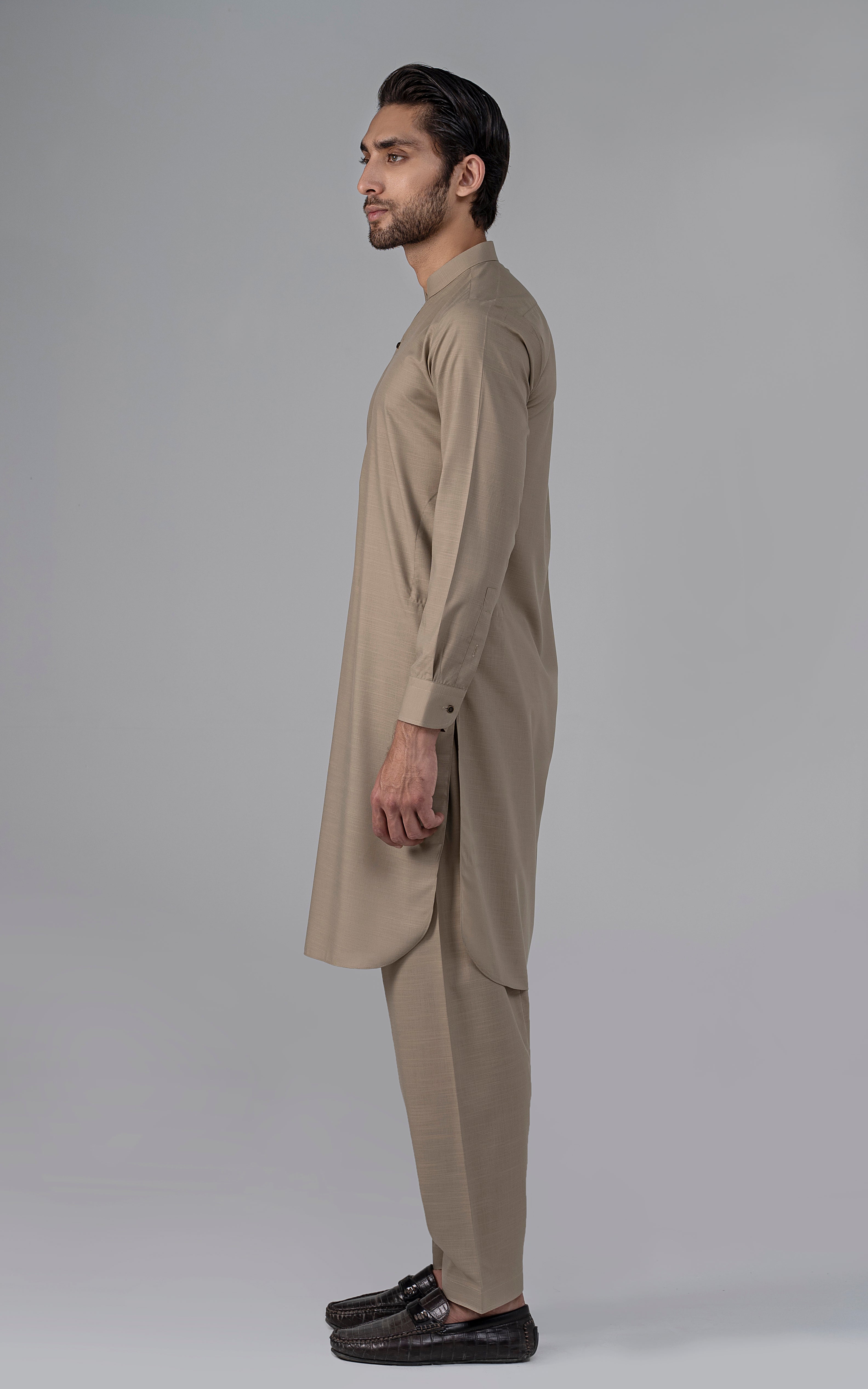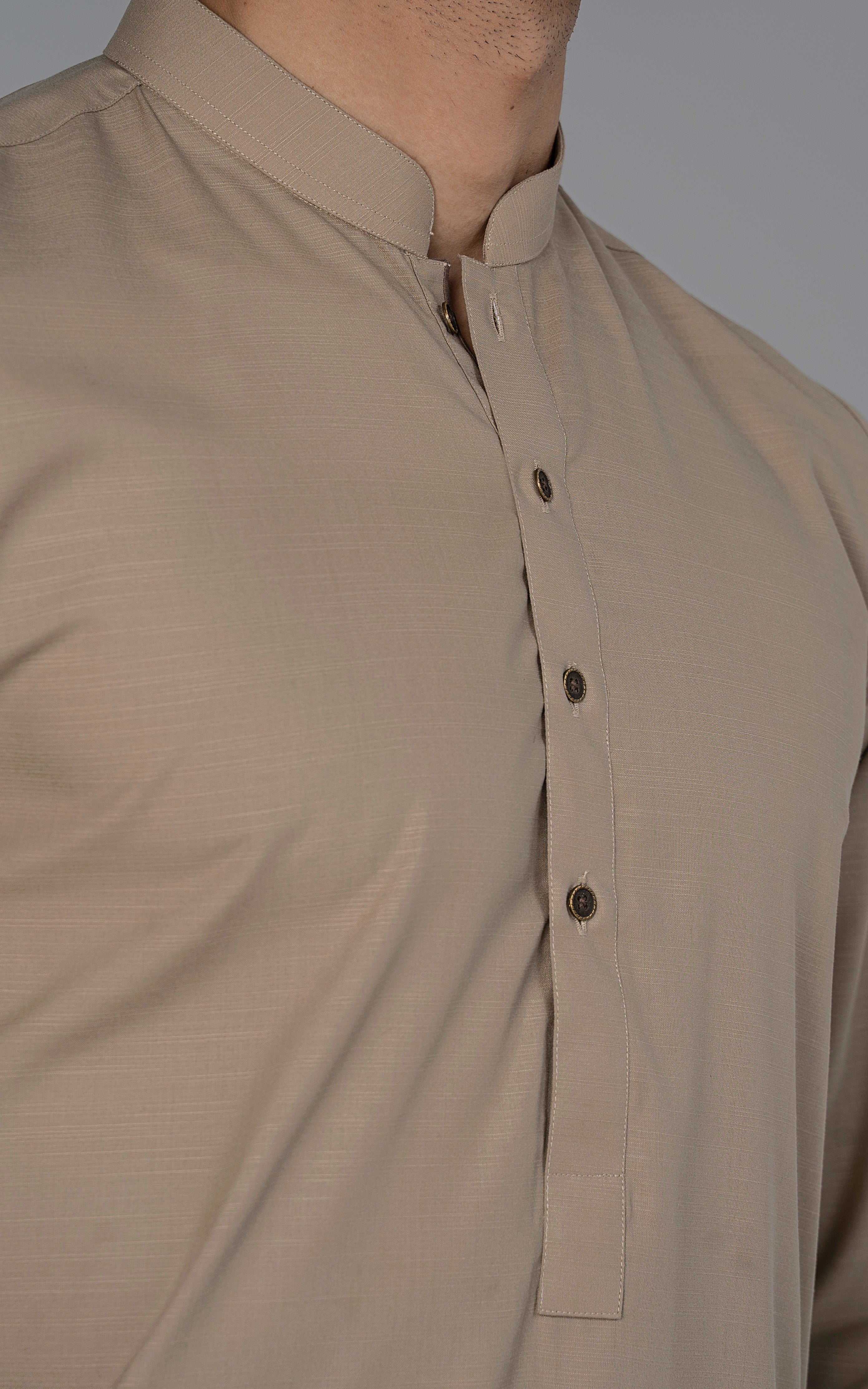 a slubbed fabric is created with slight knots and knobbles, which can be seen as thicker. these 'imperfections' are either a characteristic of the yarn, or created purposely with the intention of giving the fabric an organic, tactile look and feel. this slub fabric is an opulent union of two exceptional fibres of polyester and viscose. mandarin ban, piping on button placket, visible placket, round cuff, round hem, metal buttons, wash & wear