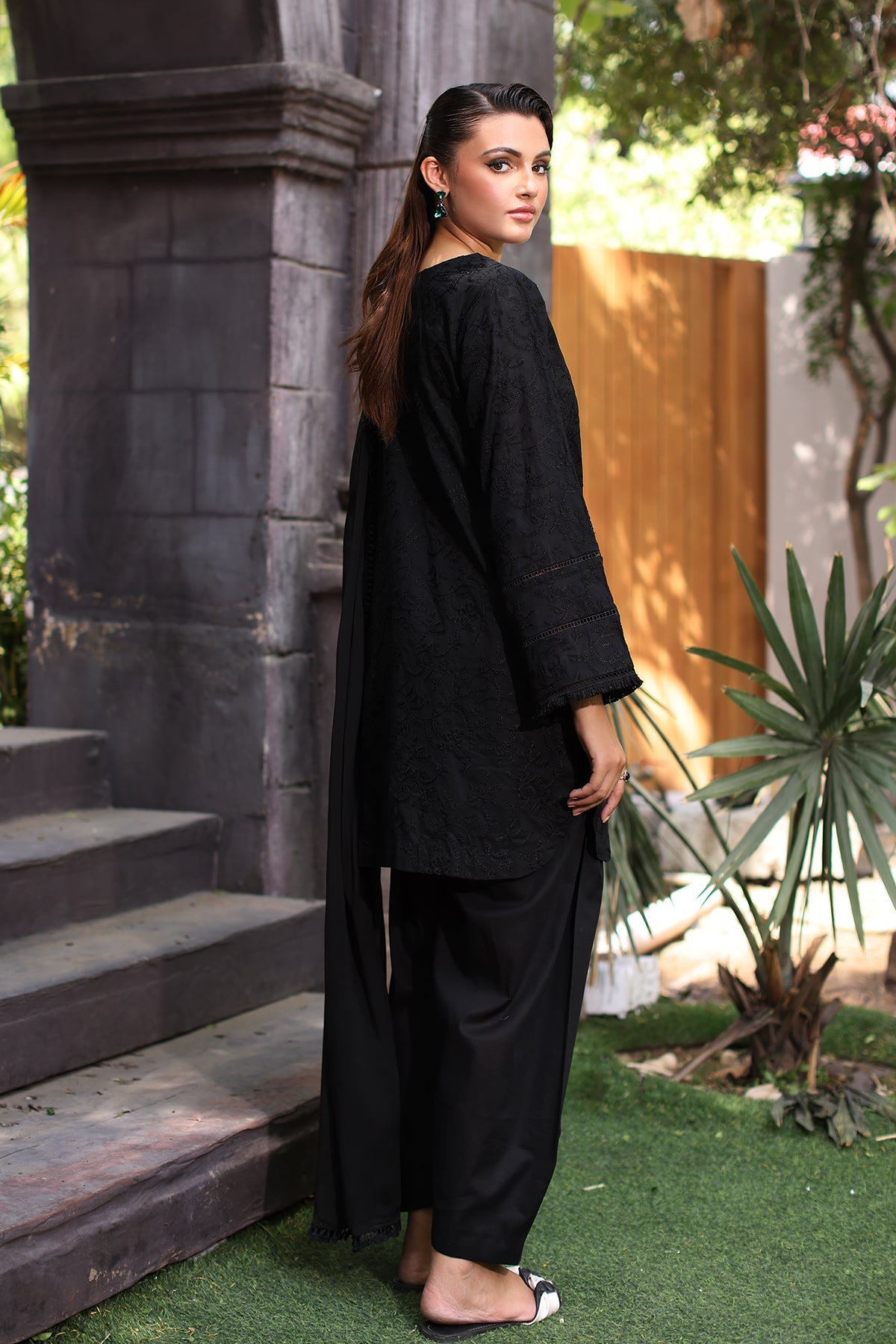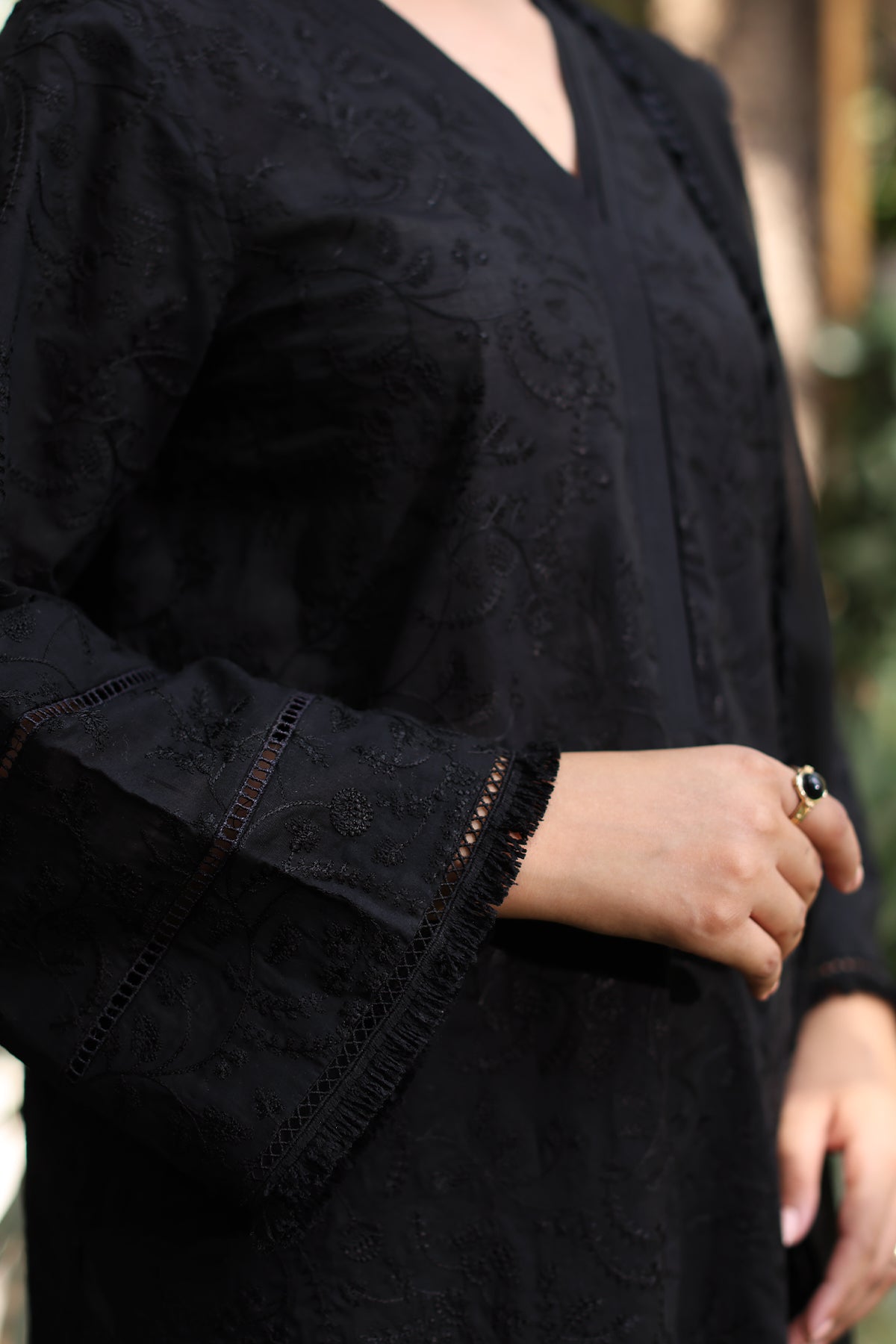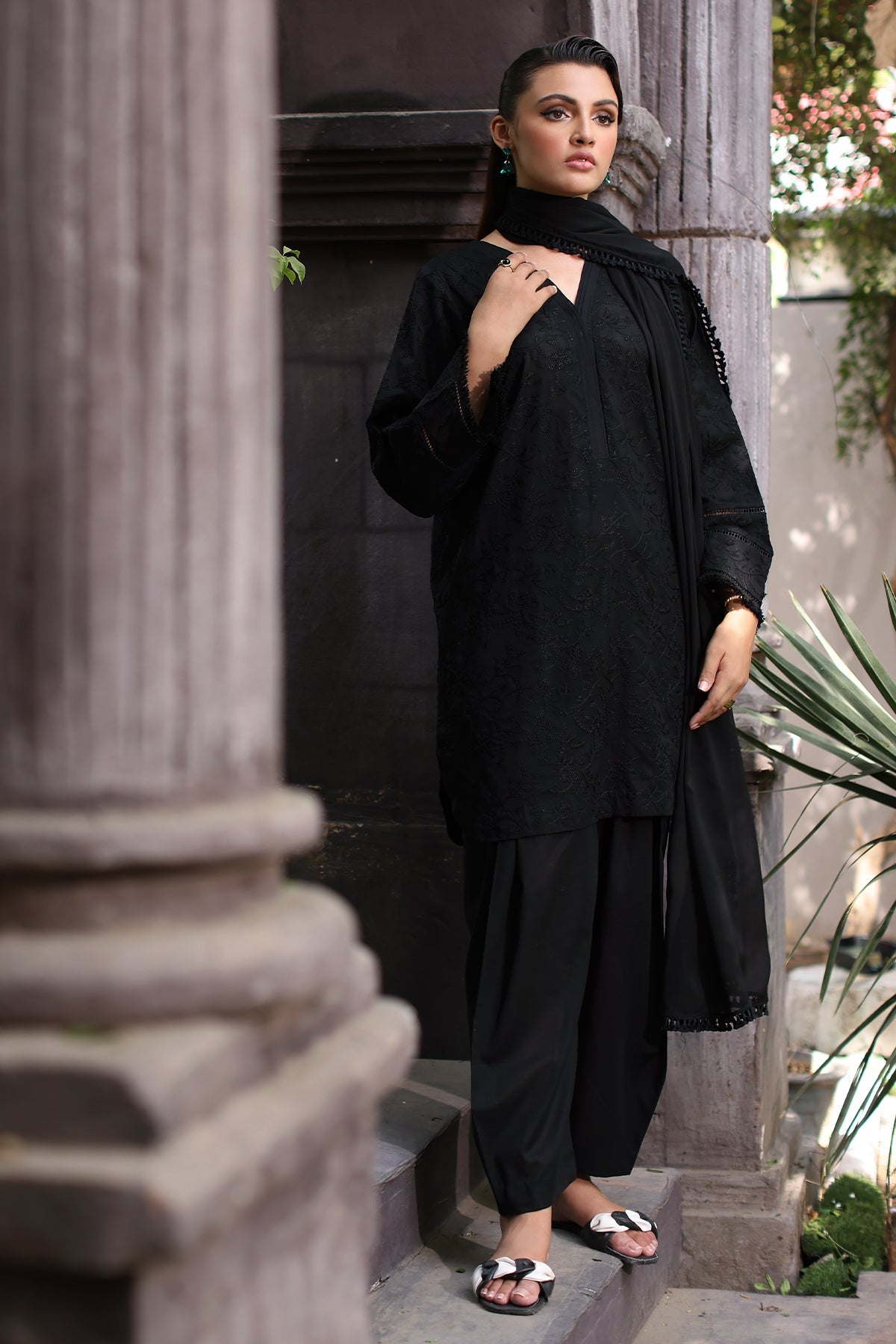 shirt: black cotton shirt with embroidered front back sleeve all over jall. finished with stitching detail. trouser: black cotton trouser with fashion. finished with stitching detail. dupatta: black chiffon dupatta. finished with stitching detail. size : s m l measurement length 34" 36" 38" flare/daman width 24" 26" 28"