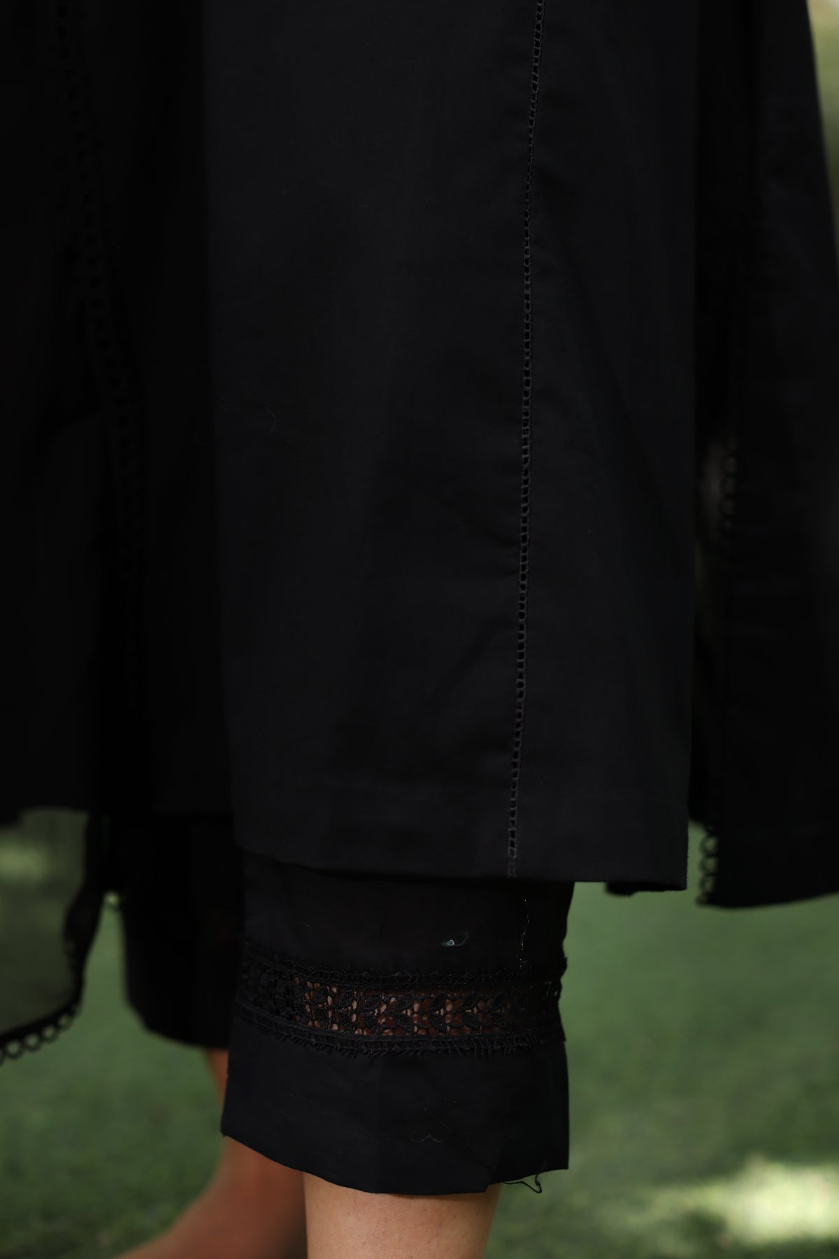 shirt: black cotton shirt. finished with stitching detail. trouser : black cotton trouser. finished with stitching detail. dupatta: chiffon dupatta. finished with stitching detail. size : s m l measurement length 44" 45" 46" flare/daman width 34" 35" 36"