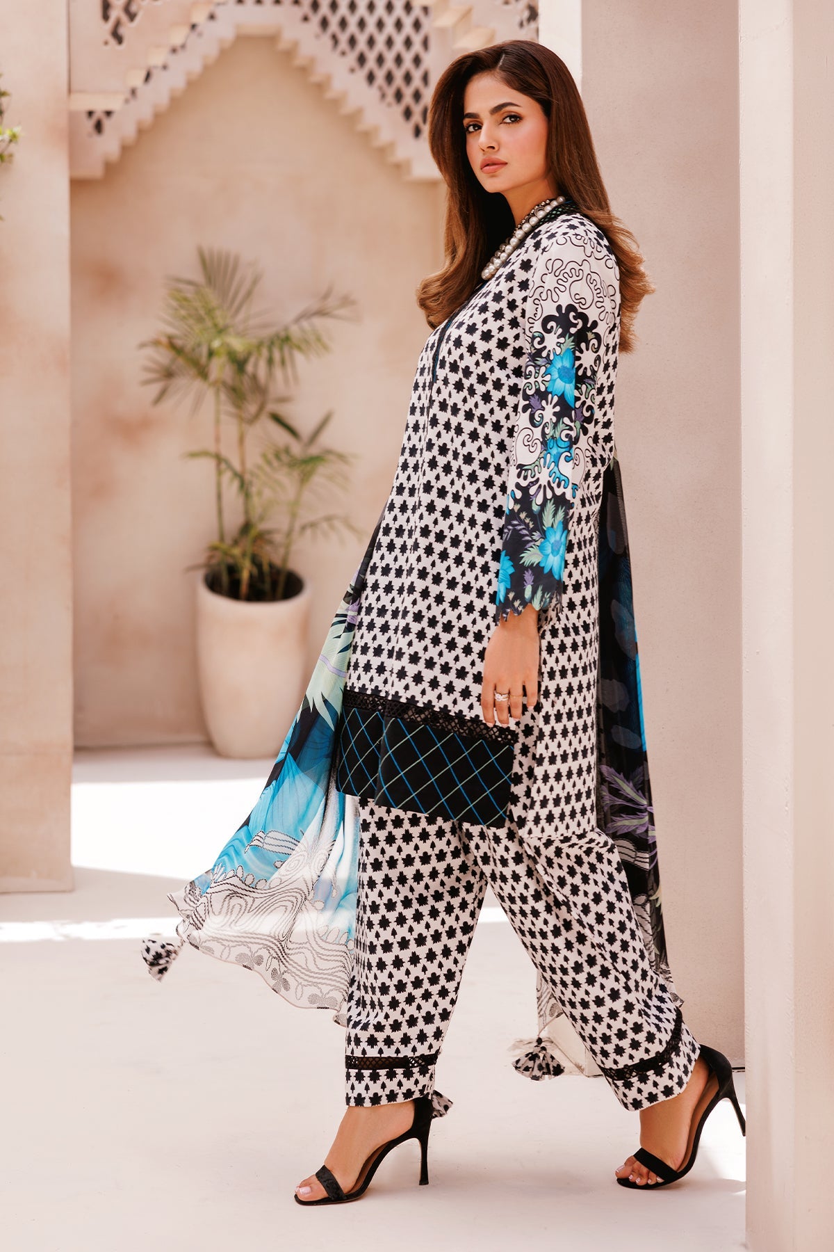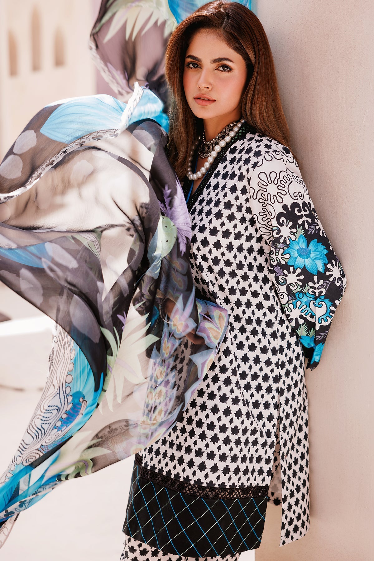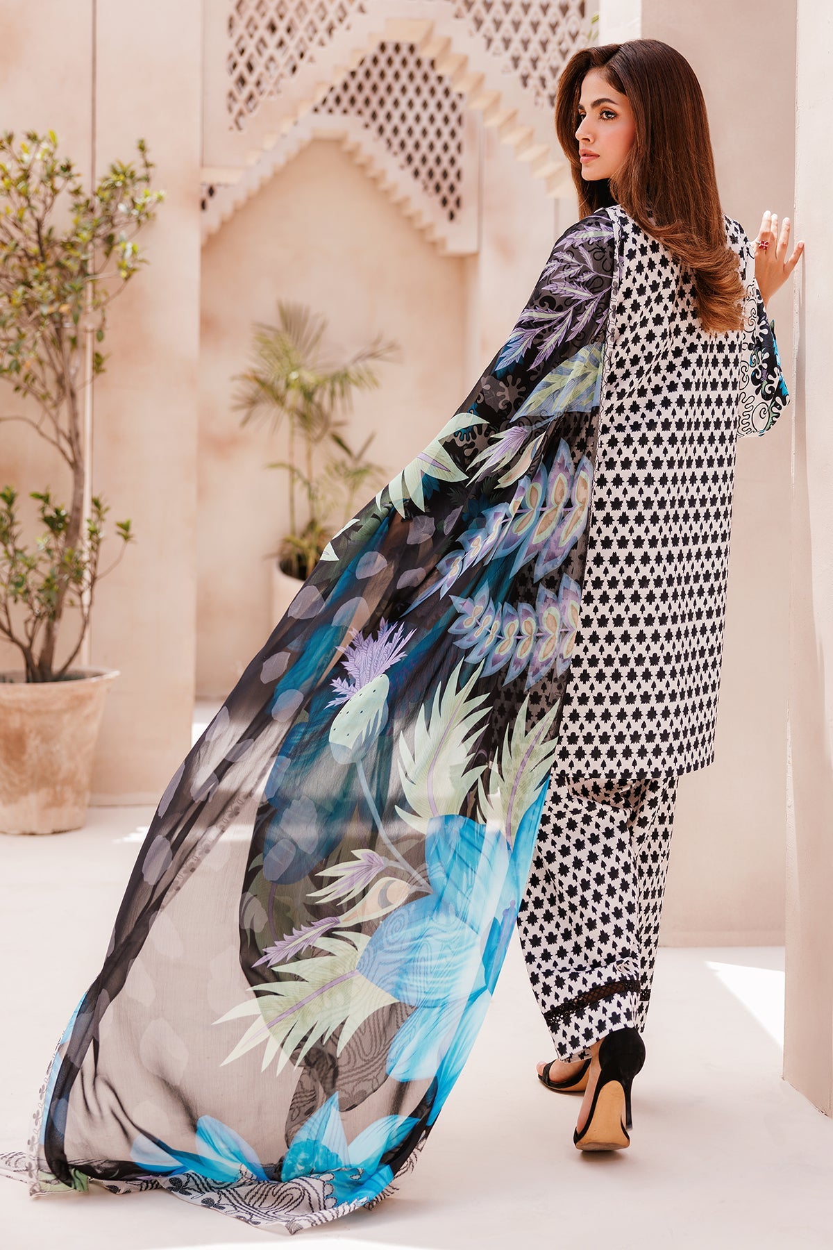 shirt: cotton printed shirt with front daman patti and fashion. finished with stitching detail. trouser: cotton printed trouser. finished with stitching detail. dupatta: chiffon printed dupatta. finished with stitching detail. size : s m l measurement length 35" 37" 39" flare/daman width 24" 26" 28"