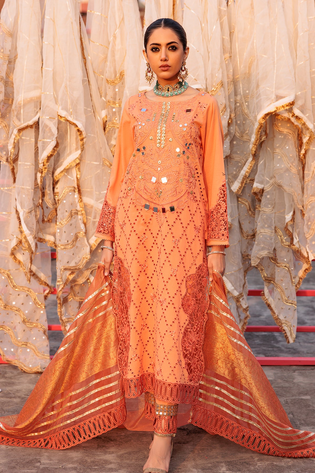 embroidered +adda work dyed lawn front 1.25mtr dyed lawn back+sleeves 2mtr embroidered sleeves motif 2pcs embroidered front motif 2pcs embroidered front +back+trouser +dupatta pallu patti 5mtr embroidered trouser patti 1mtr dyed cotton trouser 2.5mtr dyed organza jacquard dupatta 2.5mtr
