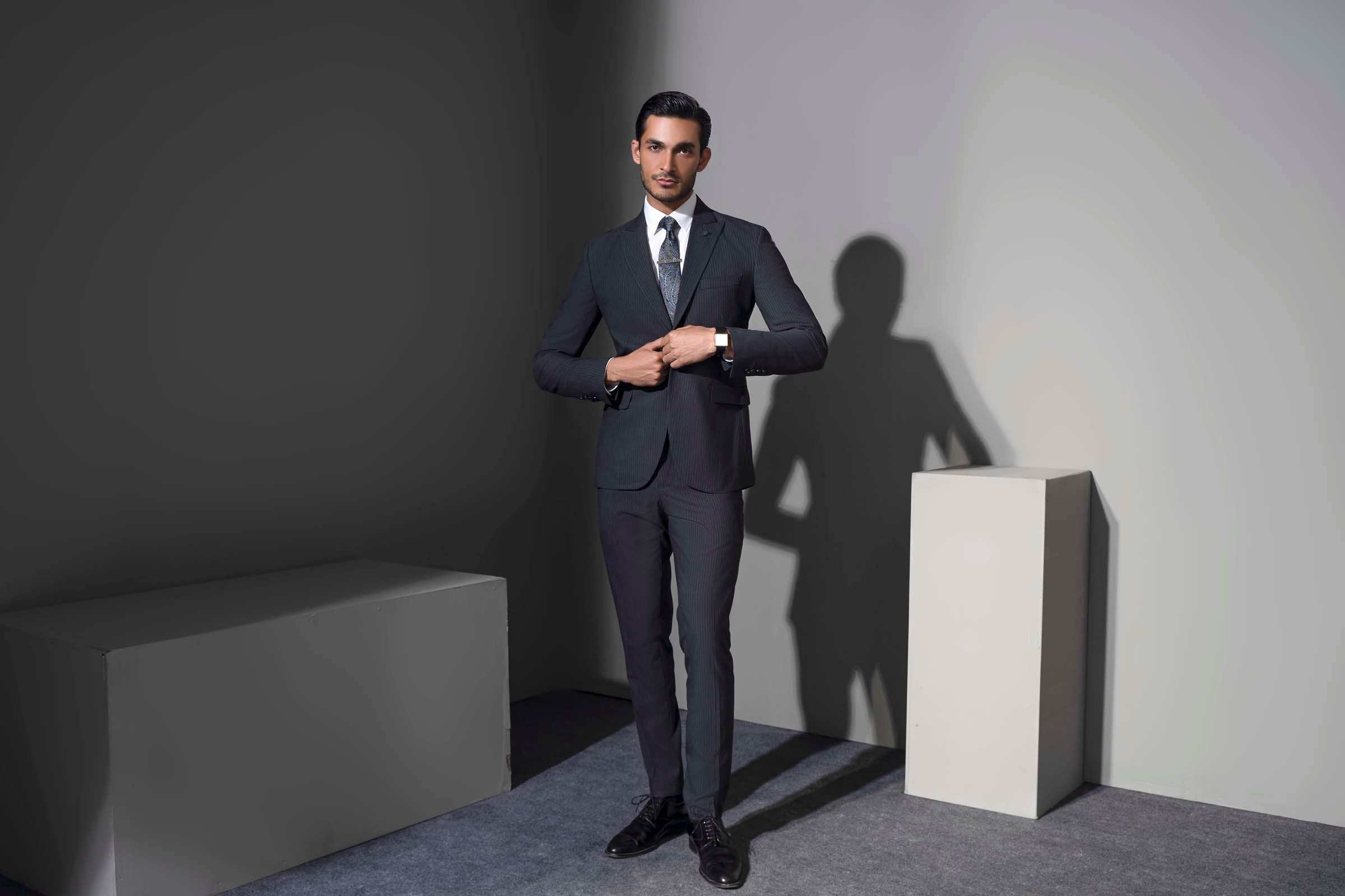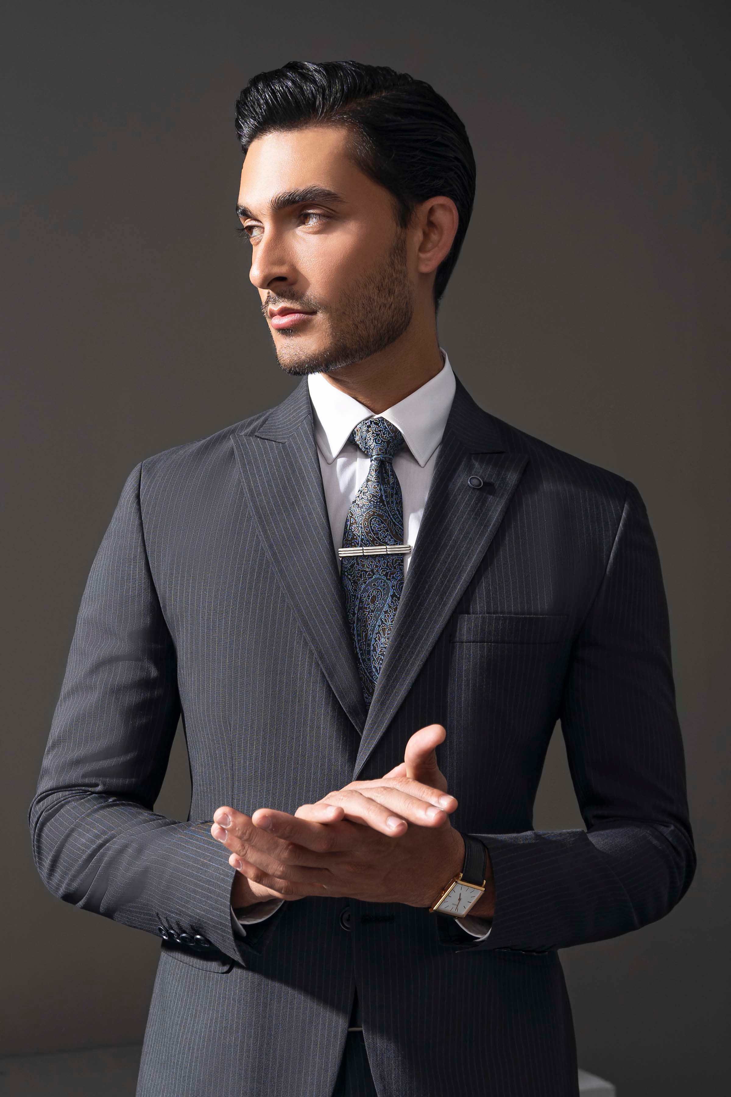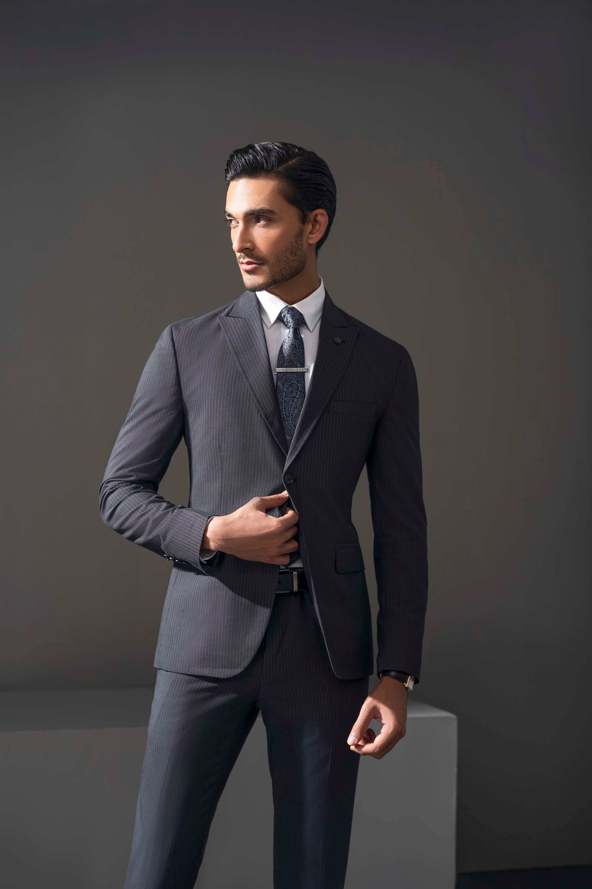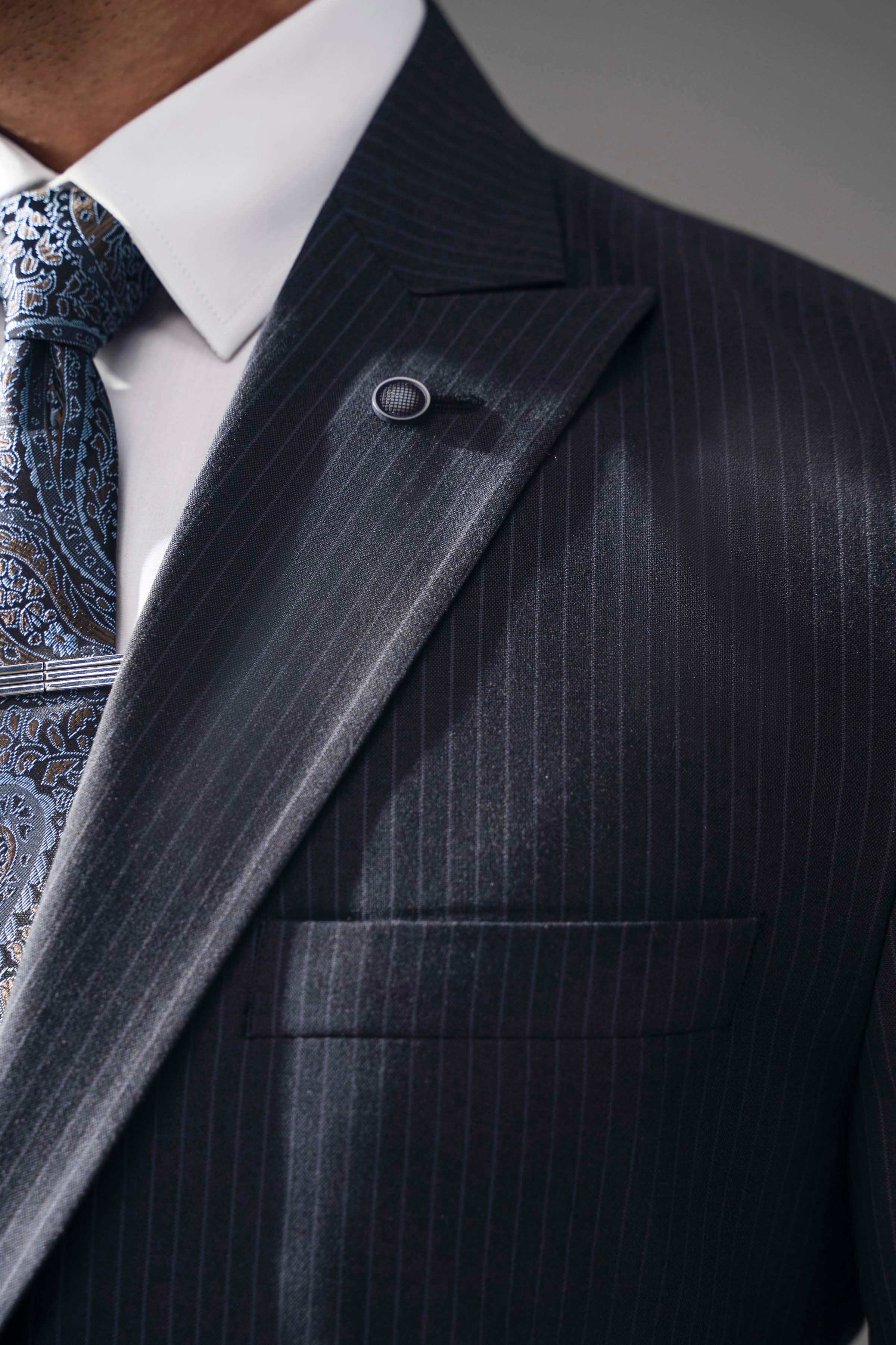 this refined two-piece suit boasts a peak lapel and a sophisticated two-button closure, giving it a sharp, elegant edge. the front flap pockets are both functional and stylish, while the back's two side vents offer enhanced mobility and comfort. made from a tropical stripe fabric, this suit not only provides a distinctive pattern but also ensures breathability, making it perfect for warmer weather. the slim fit silhouette accentuates a modern, tailored appearance, ideal for making a statement at any formal or semi-formal event.