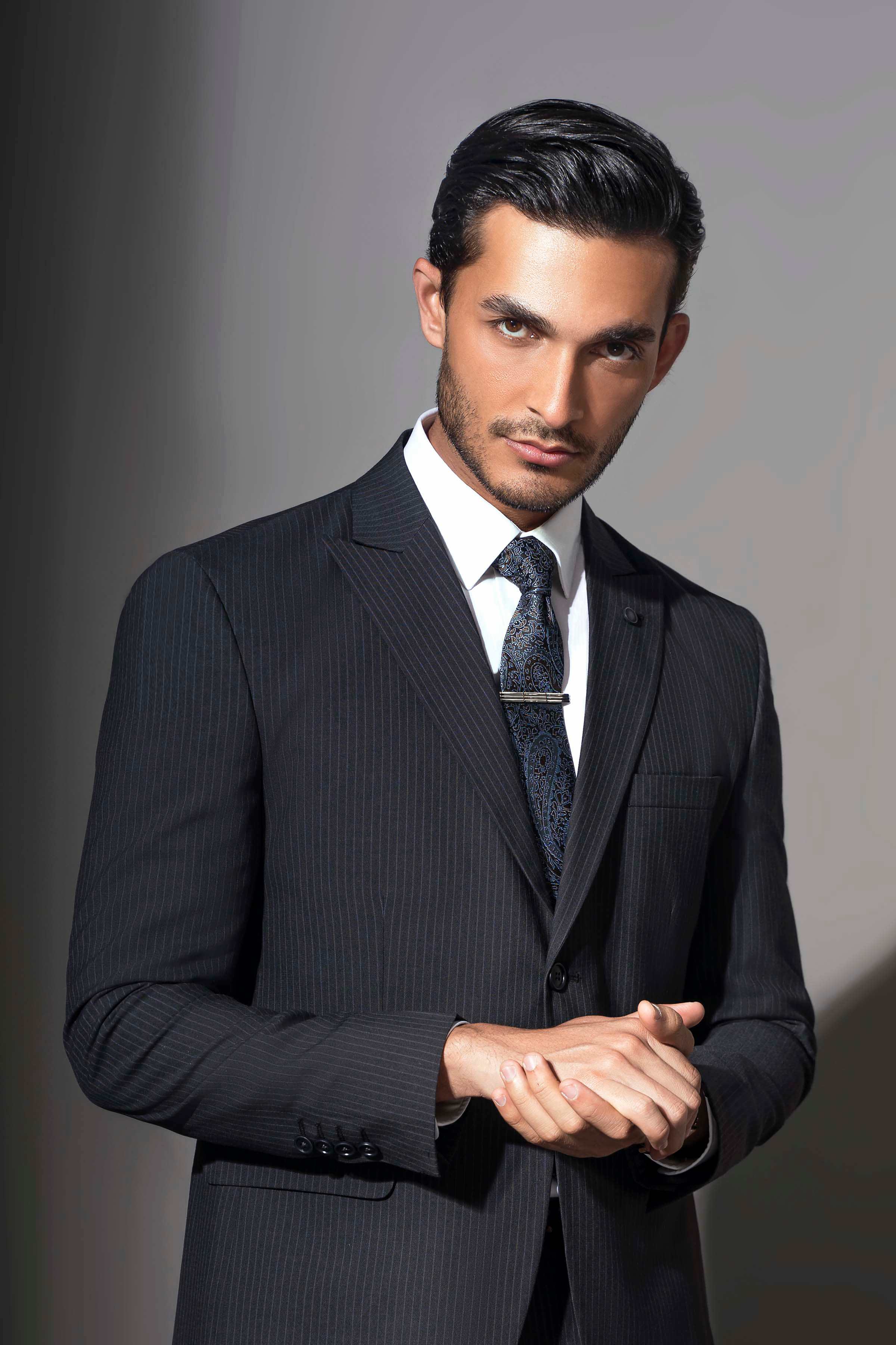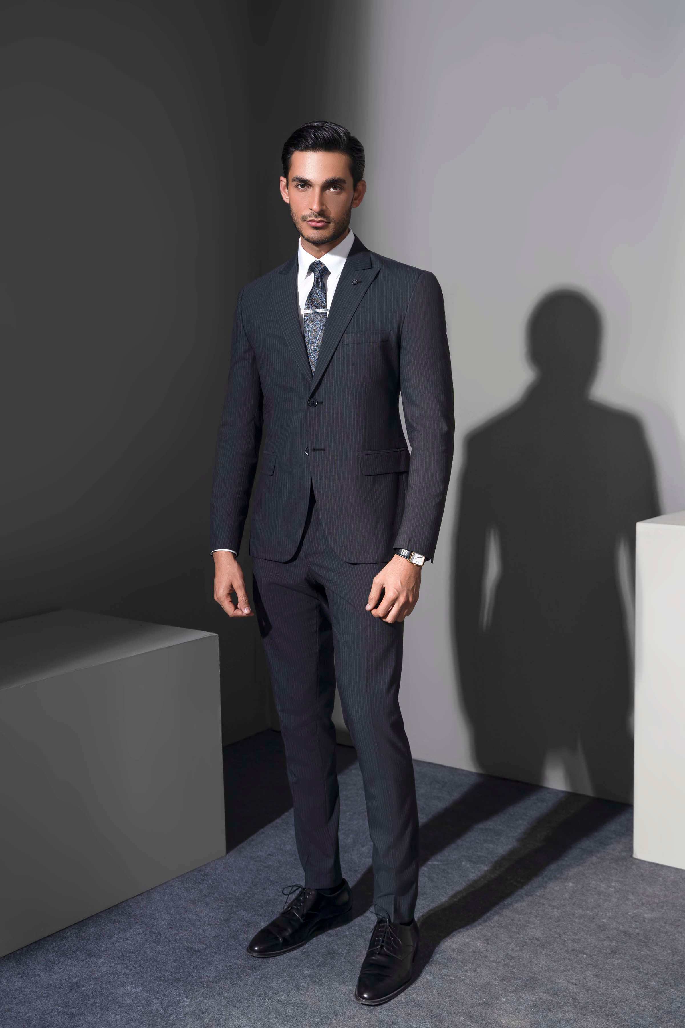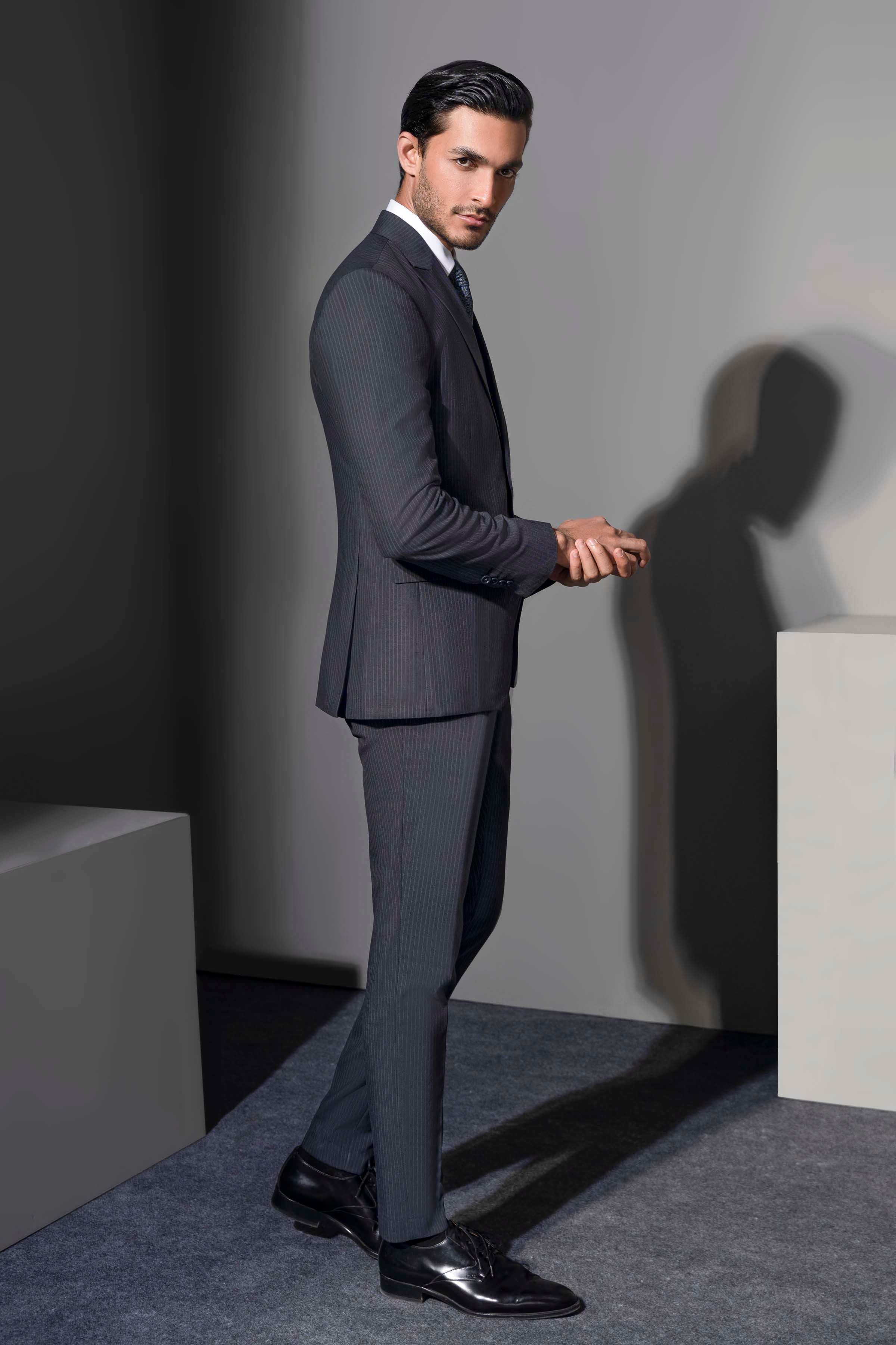 this refined two-piece suit boasts a peak lapel and a sophisticated two-button closure, giving it a sharp, elegant edge. the front flap pockets are both functional and stylish, while the back's two side vents offer enhanced mobility and comfort. made from a tropical stripe fabric, this suit not only provides a distinctive pattern but also ensures breathability, making it perfect for warmer weather. the slim fit silhouette accentuates a modern, tailored appearance, ideal for making a statement at any formal or semi-formal event.