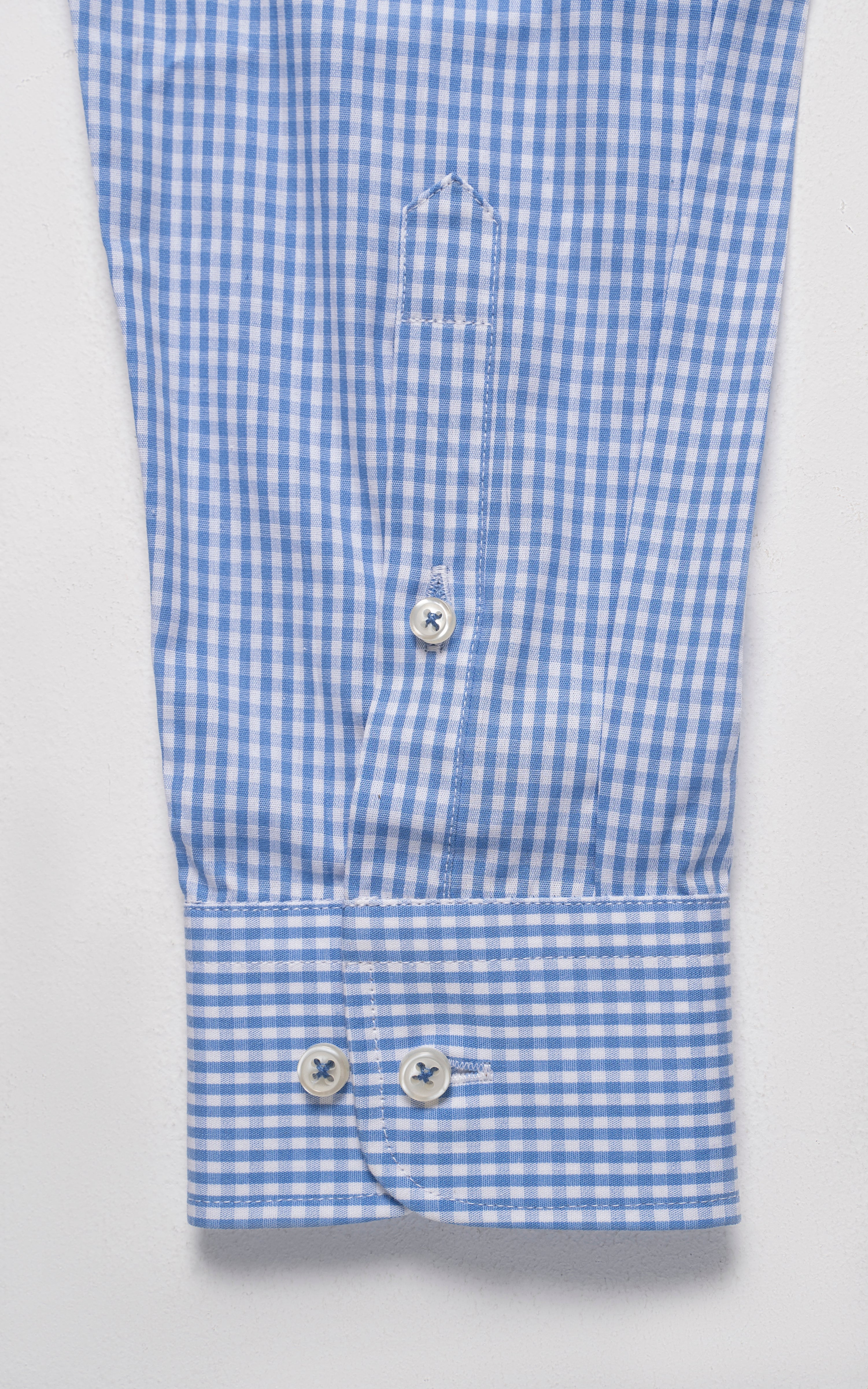 this shirt features a stylish french collar with a distinctive half contrast and twill tape detailing inside the band. it is crafted from cotton-rich mini check fabric for a classic yet modern look. the design includes a front pocket adorned with elegant embroidery and round cuffs for a refined touch. with full sleeves and the convenience of being machine washable, this shirt combines sophistication with practicality