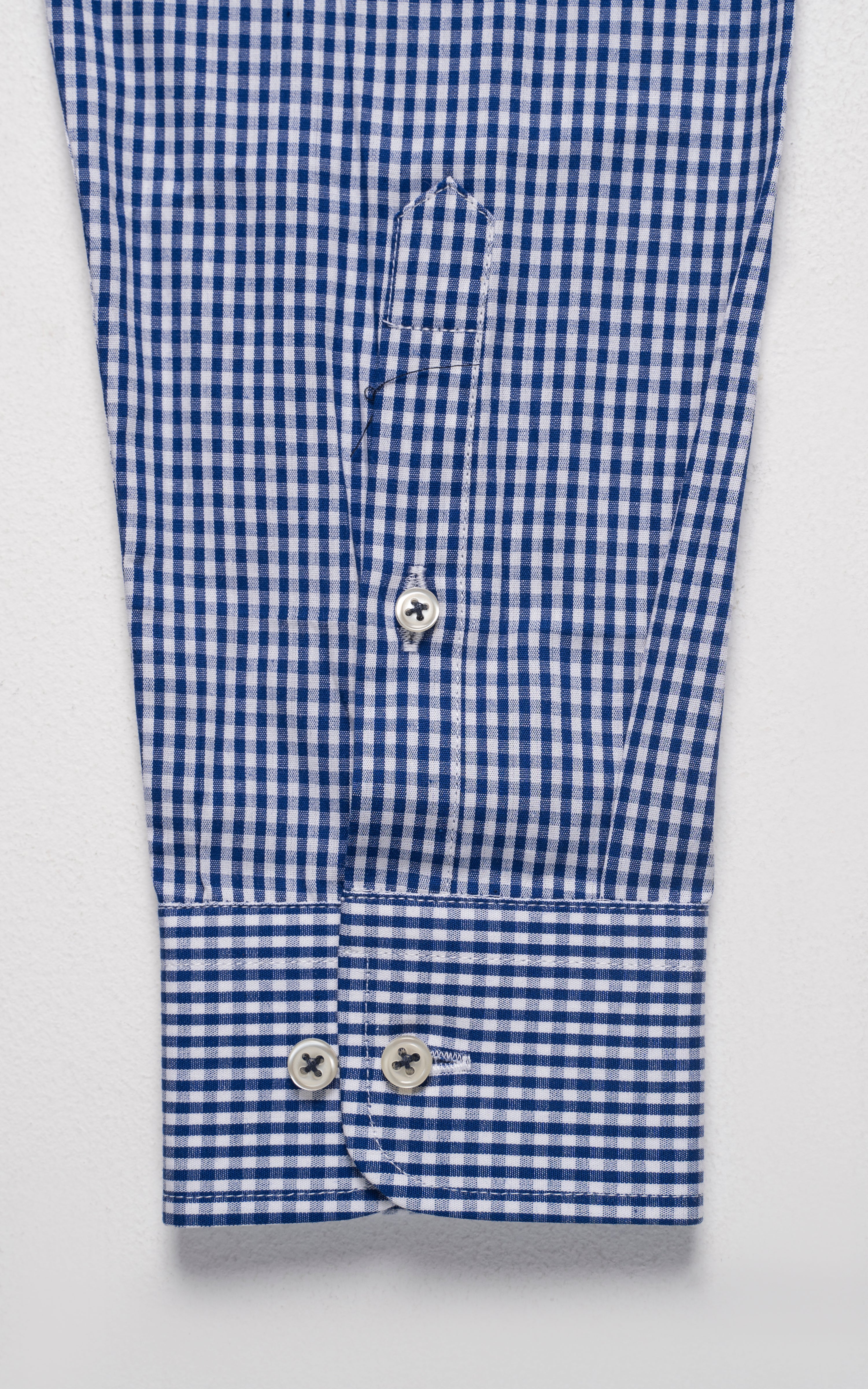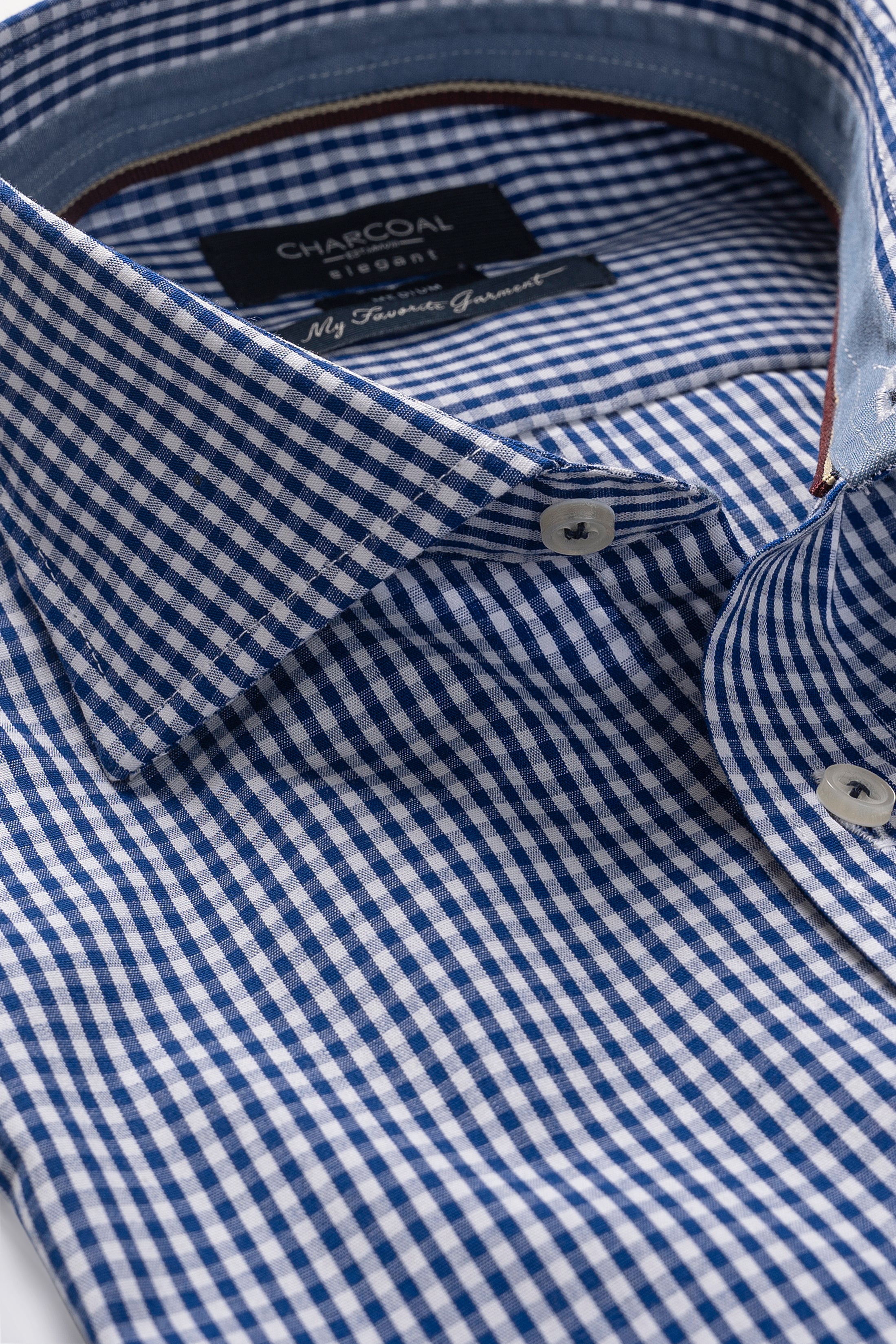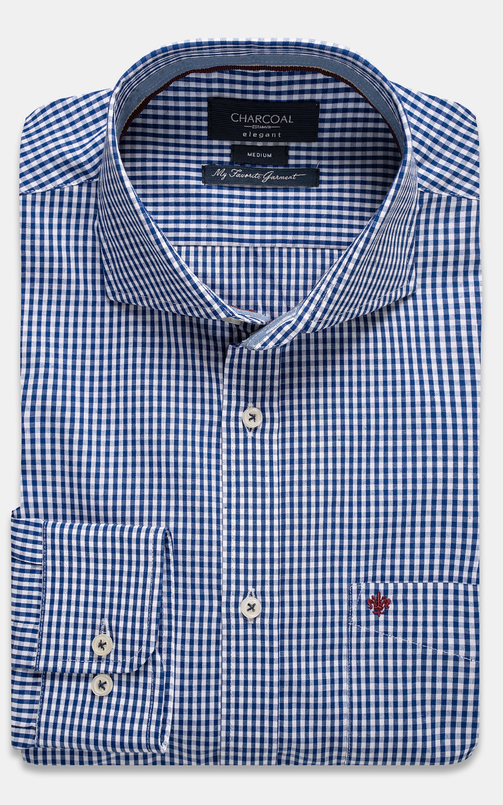 this shirt features a stylish french collar with a distinctive half contrast and twill tape detailing inside the band. it is crafted from cotton-rich mini check fabric for a classic yet modern look. the design includes a front pocket adorned with elegant embroidery and round cuffs for a refined touch. with full sleeves and the convenience of being machine washable, this shirt combines sophistication with practicality