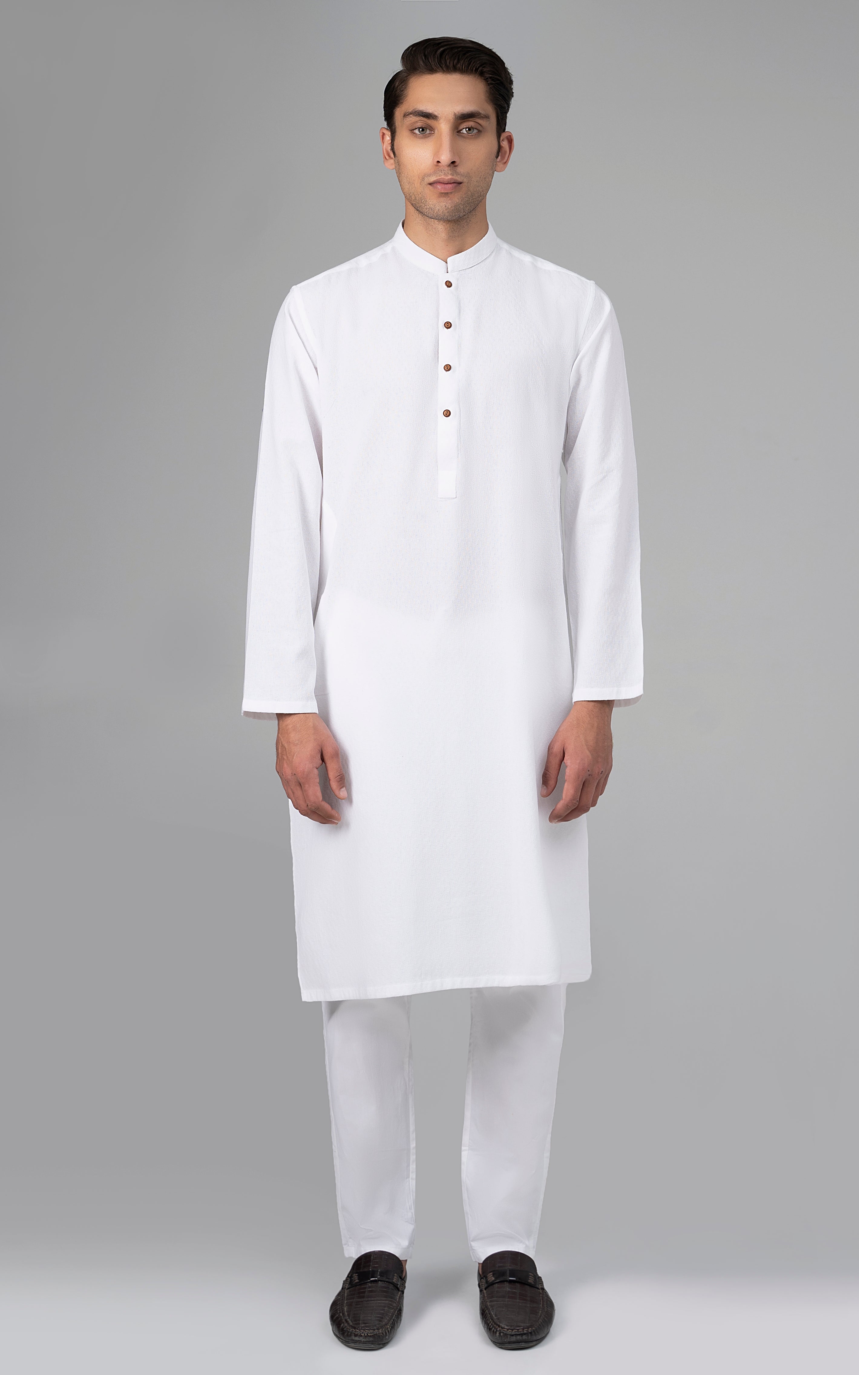 this dobby textured fabric is made with fine cotton. a textured cloth is created by using flexible fabric yarns into multiple variants of interlocking yarns to create a design that is in itself a pattern. this article offers the light colors, set in intriguing and elaborate designs. mandarin ban, half ban contrast inside, piping on button placket, visible placket, open cuff, straight hem, wooden buttons, cotton rich