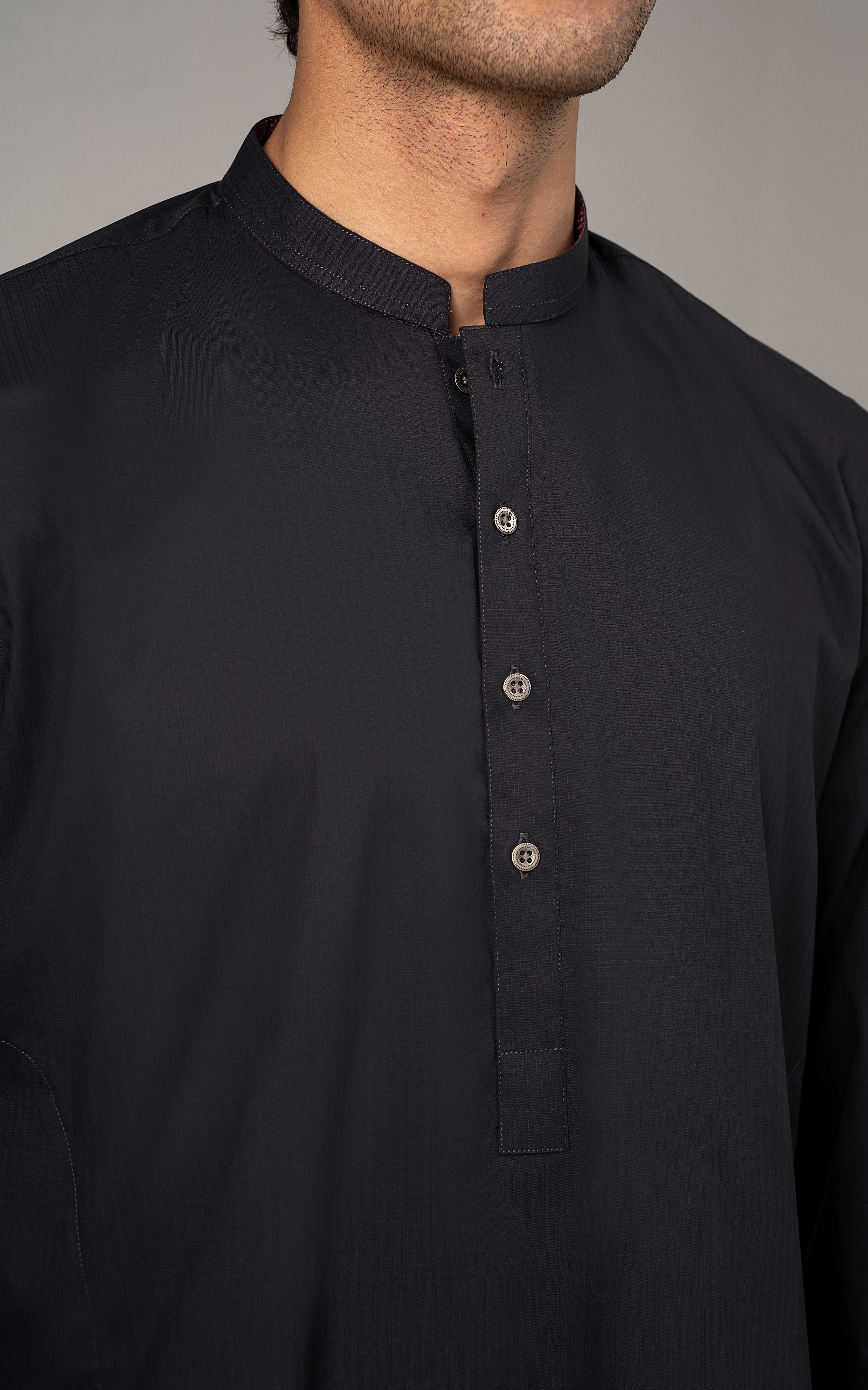 dobby is a woven fabric produced on a specialized dobby loom. these fabrics feature intricate designs and patterns or raised surfaces that create a sense of depth and dimension. this article is accessible in medium and dark colors. mandarin ban, half ban contrast with champa details inside ban, visible placket, piping on button placket, open cuff, straight hem, metal buttons, cotton rich