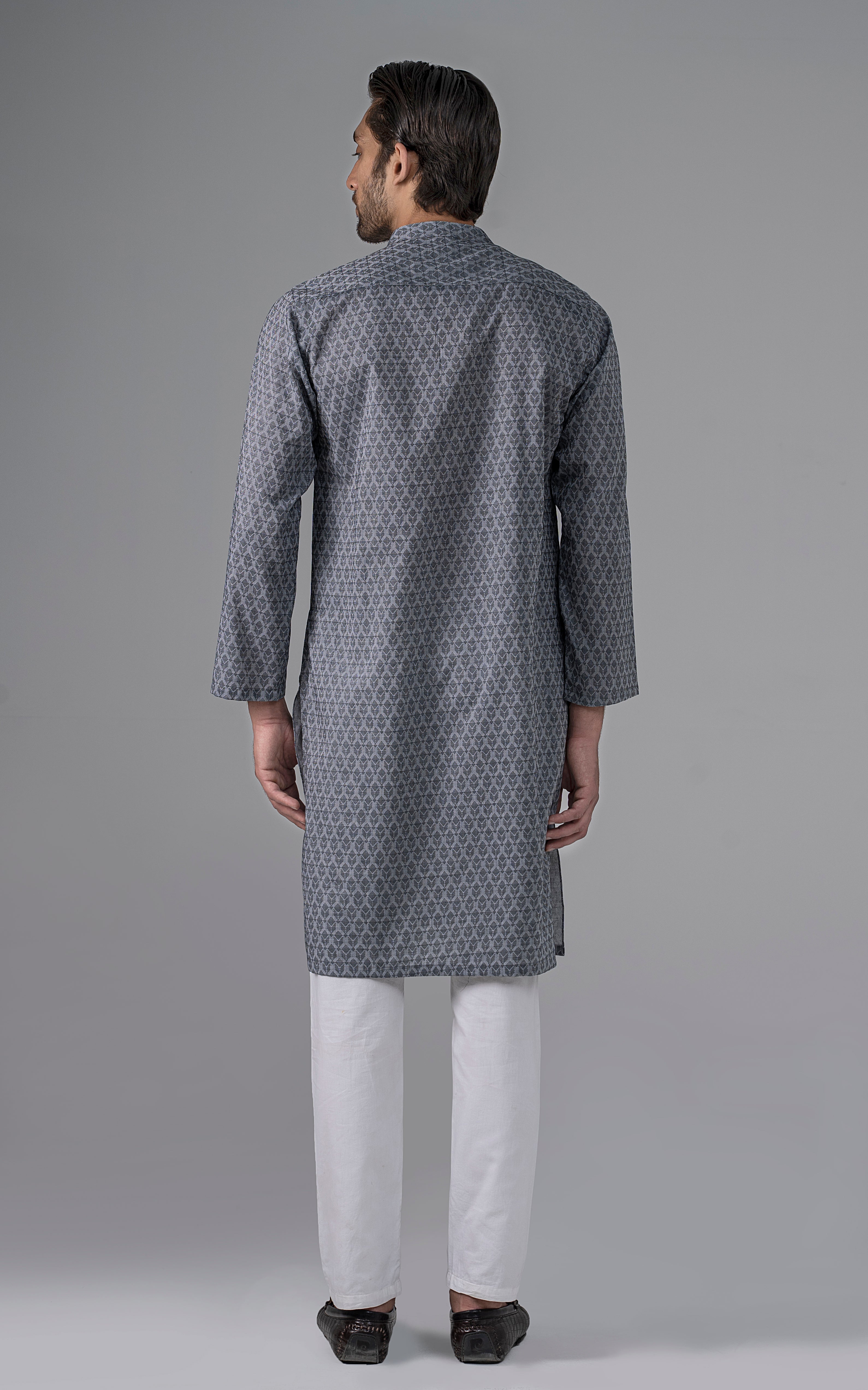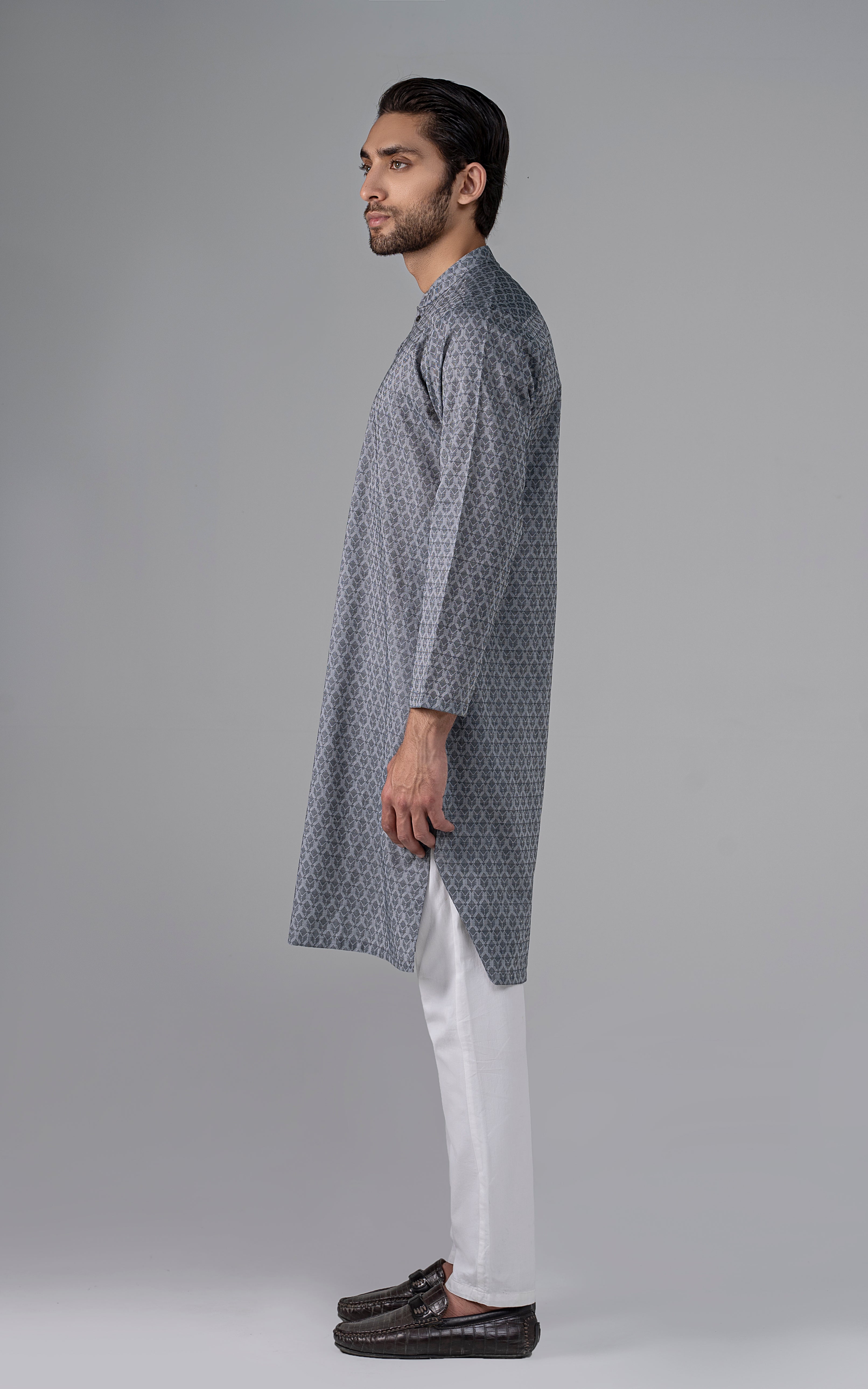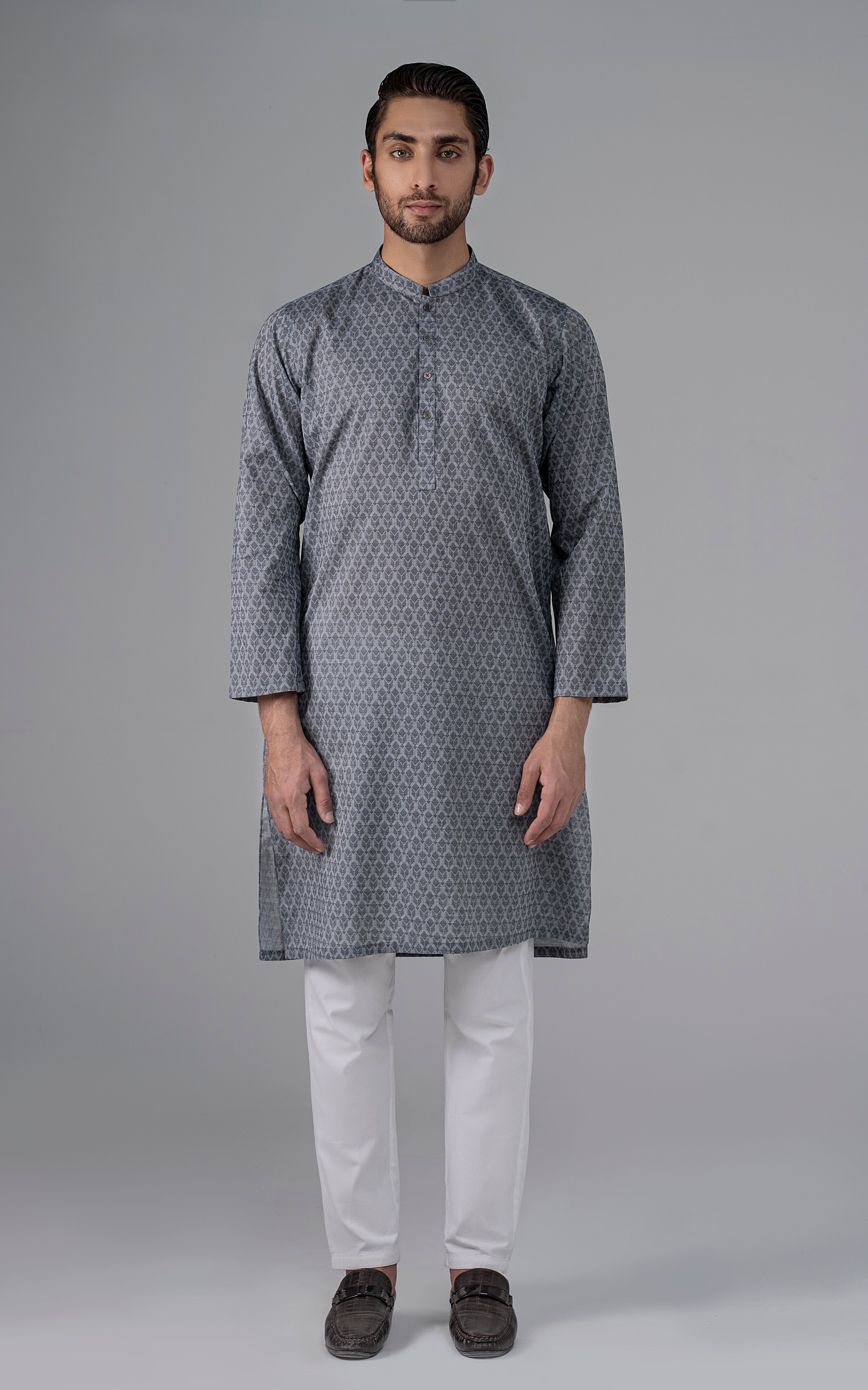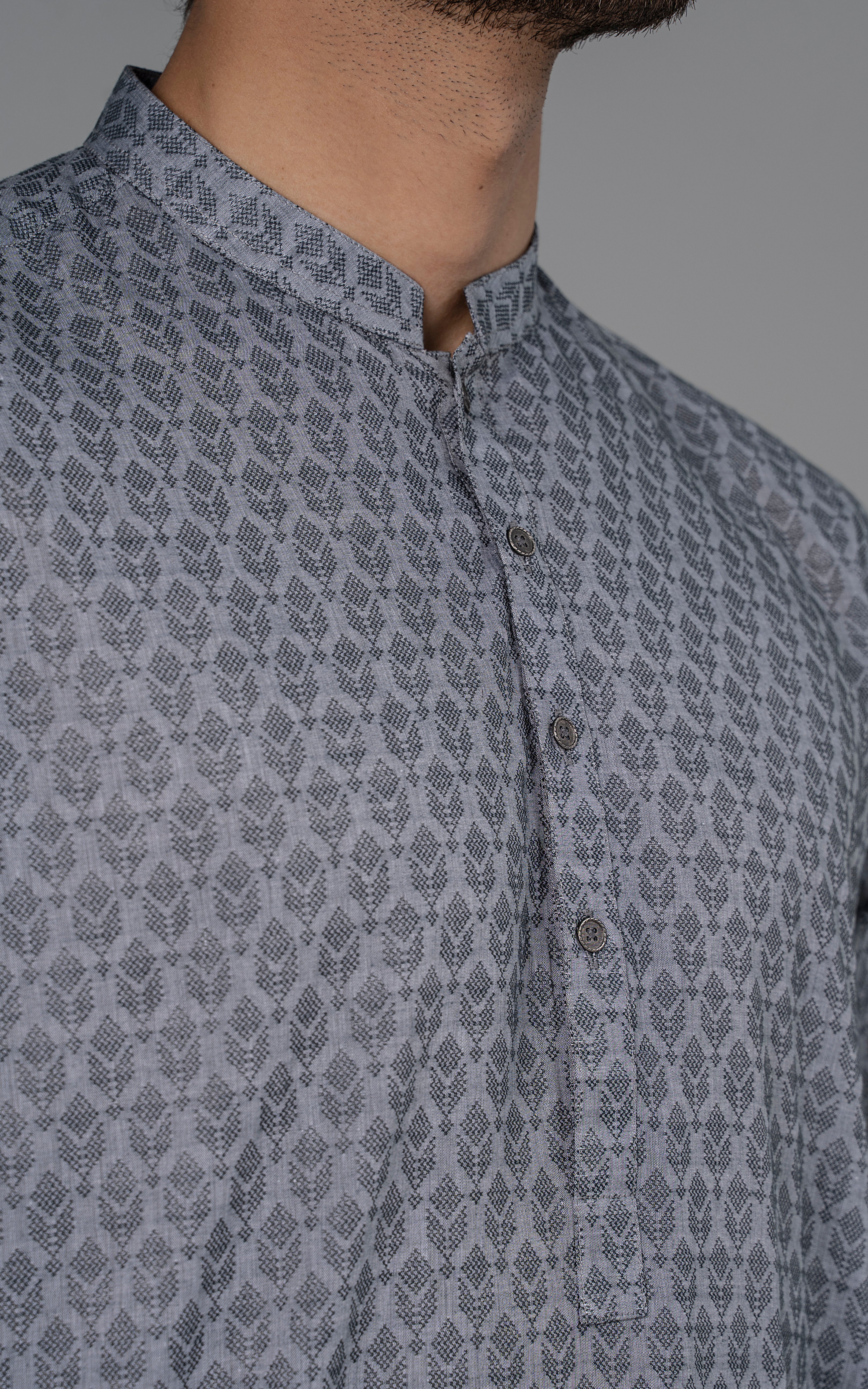 a yarn-dyed jacquard is woven using different color yarns of finest cotton in both the warp and the weft. this fabric is constructed by using white yarn in warp and colored yarn in weft. reach the pinnacle of style and grace by indulging in this premium collection. this article is accessible in natural light and dark colors. mandarin ban, piping on button placket, visible placket, open cuff, straight hem, metal buttons, yarn dyed jacquard