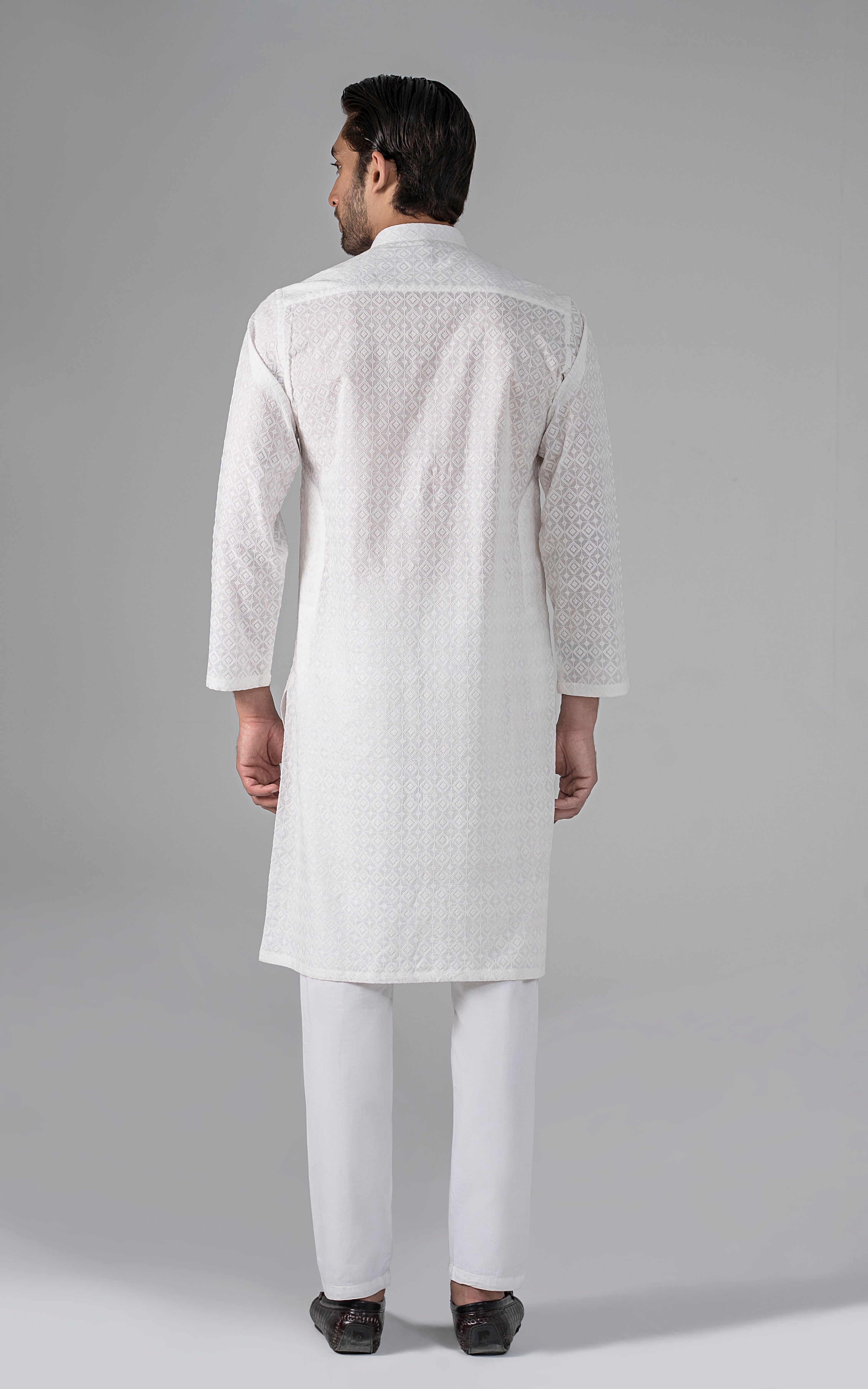 this is an impeccable embroidered fabric made from pure and super fine 100% cotton fibers. it is a very lightweight cotton fabric fully embroidered with signature patterns and designs to give you a more striking and distinctive look when worn. the color palette has a mesmerizing range of colors varying from light to dark. the embroidered kurta, mandarin ban, hidden placket, open cuff, straight hem, wooden buttons, 100% premium cotton