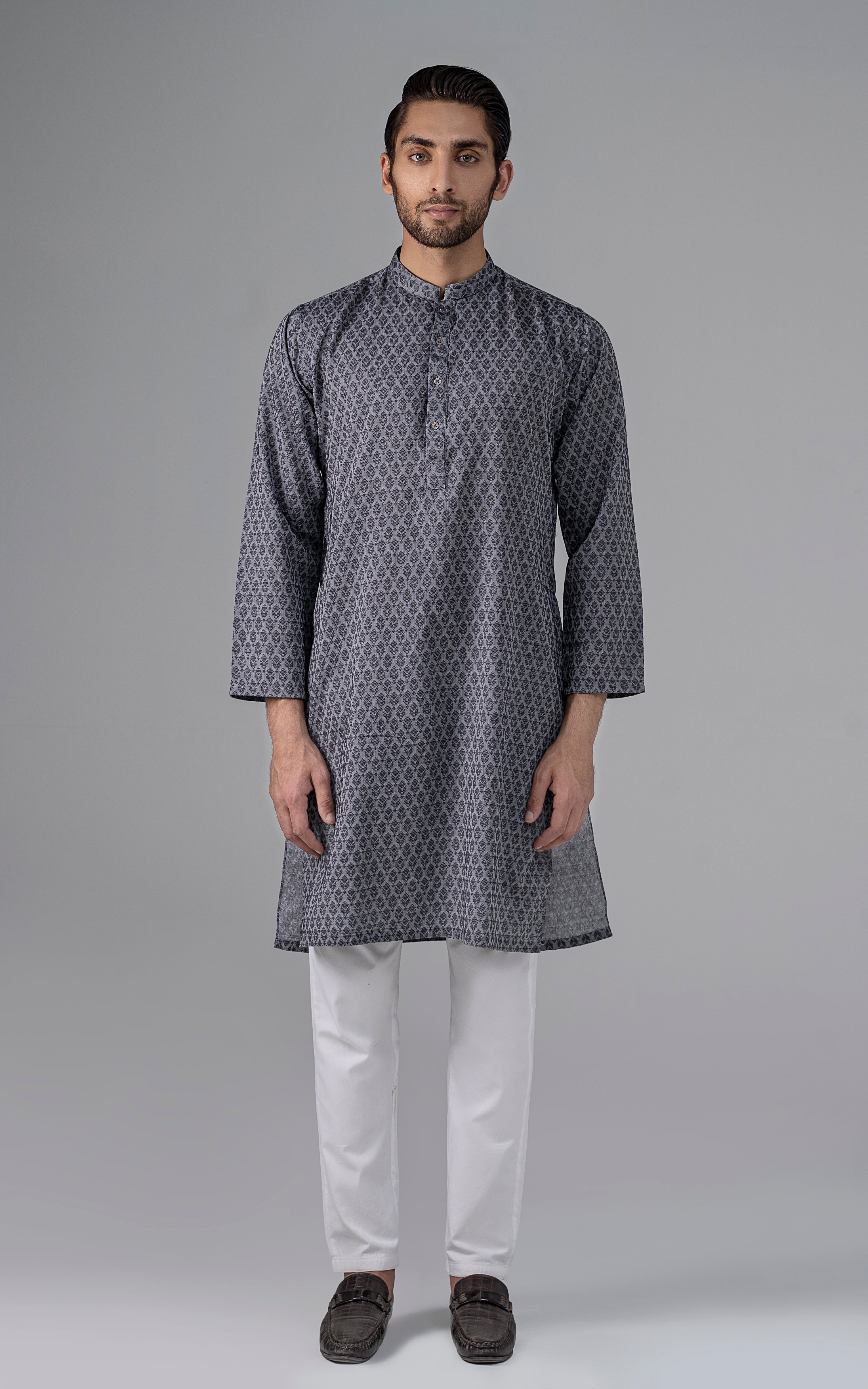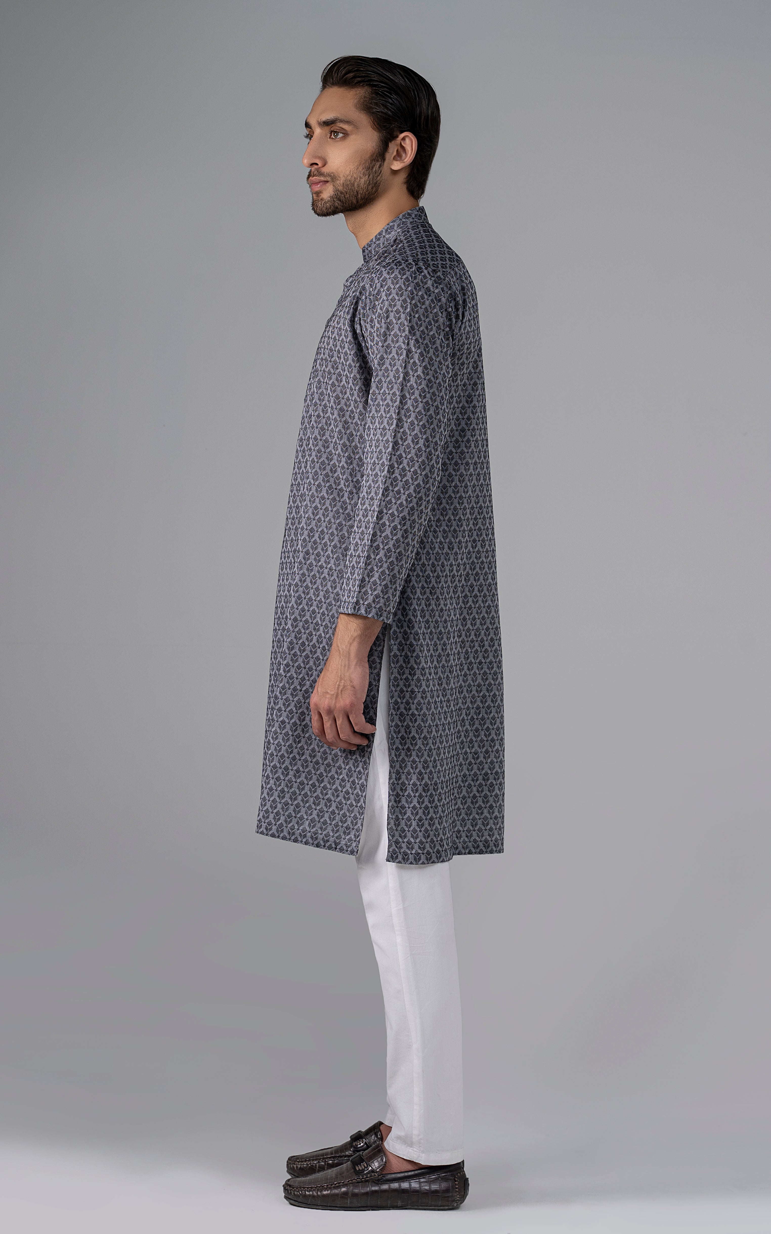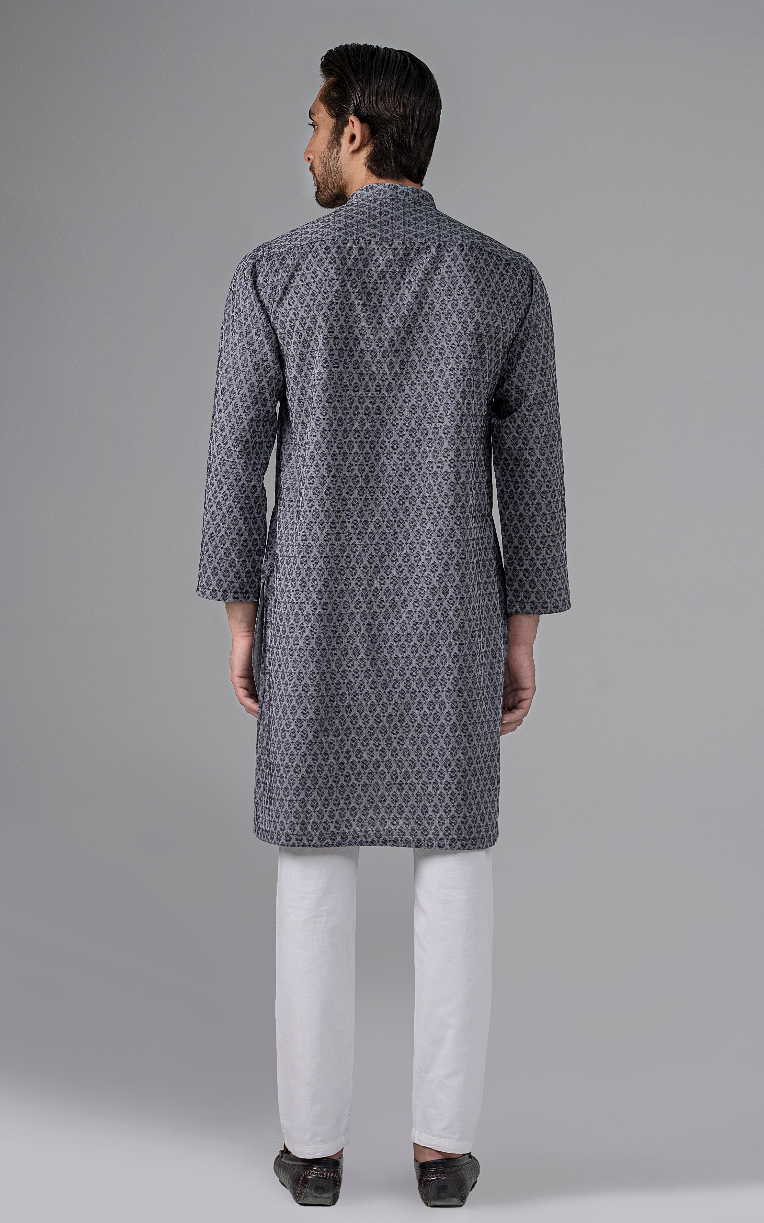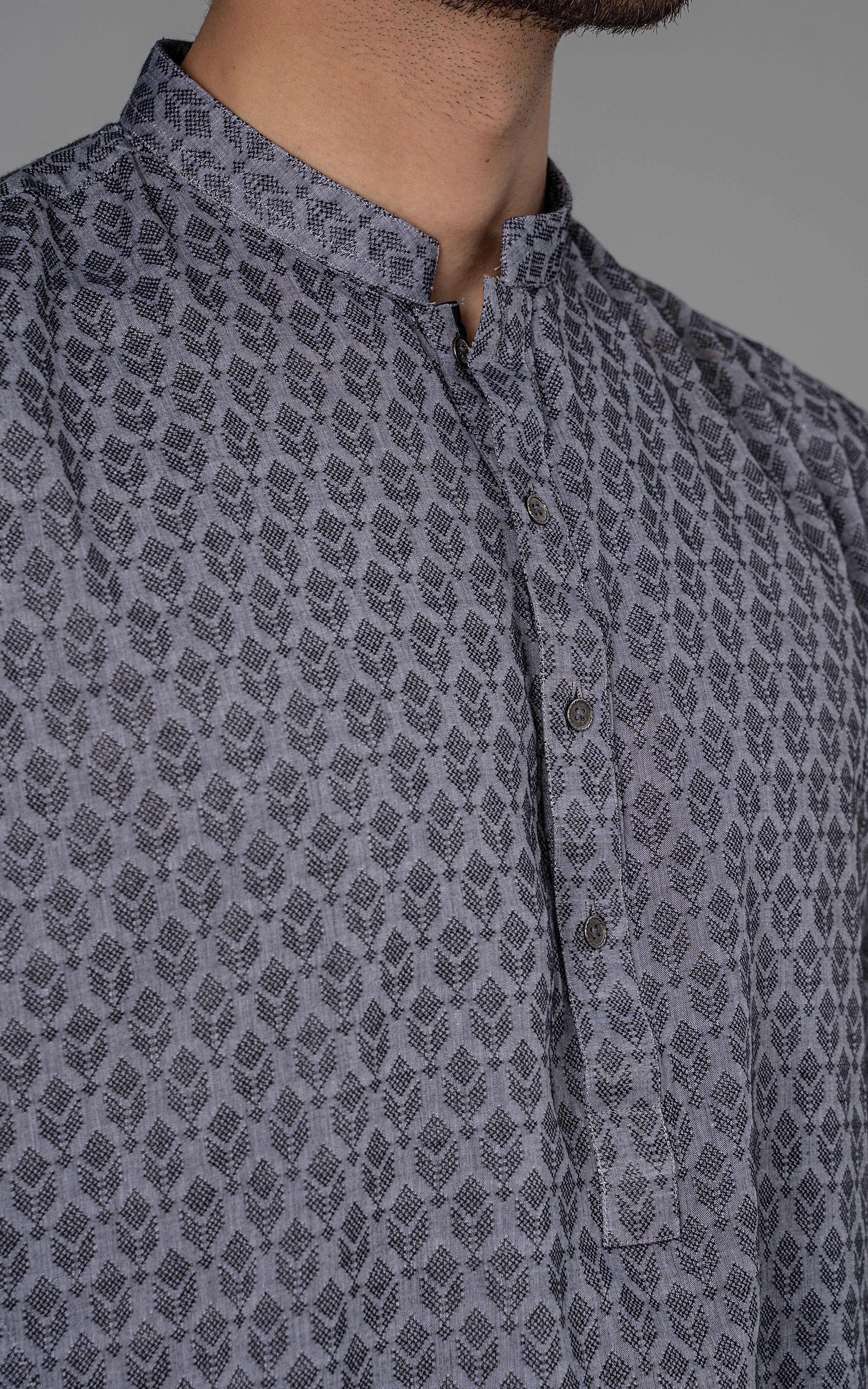 a yarn-dyed jacquard is woven using different color yarns of finest cotton in both the warp and the weft. this fabric is constructed by using white yarn in warp and colored yarn in weft. reach the pinnacle of style and grace by indulging in this premium collection. this article is accessible in natural light and dark colors. mandarin ban, piping on button placket, visible placket, open cuff, straight hem, metal buttons, yarn dyed jacquard