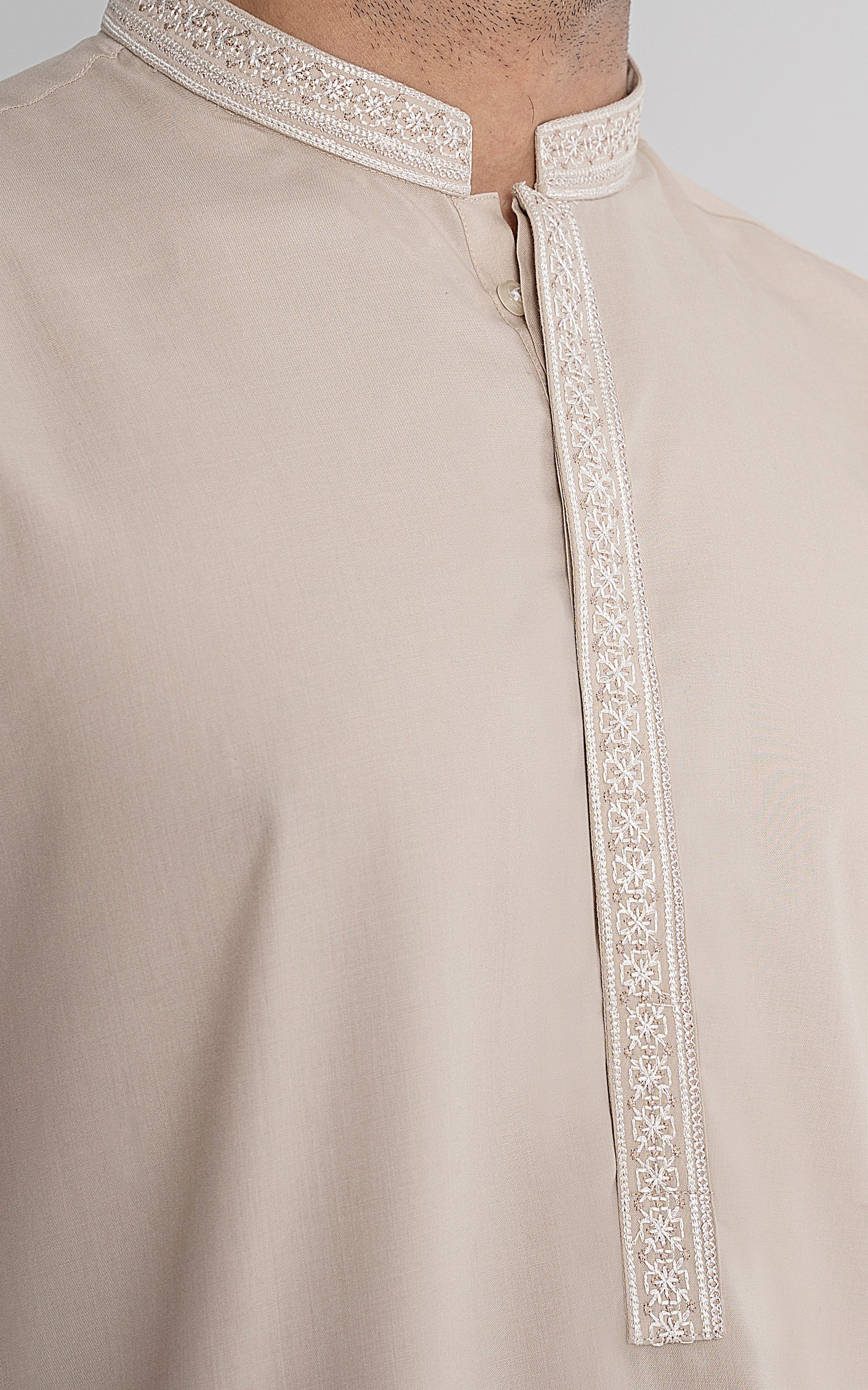 this fabric is constructed from special fibres of polyester and viscose. it is a splendid addition to our summer collection to make you look stupendous in this scathing heat. it also has signature embroidery on it. this article is accessible in medium hues. mandarin ban, hidden placket, dtm buttons inside, embroidery on ban and front placket, cut cuff, stitching details on cuff, straight hem, blended wash & wear