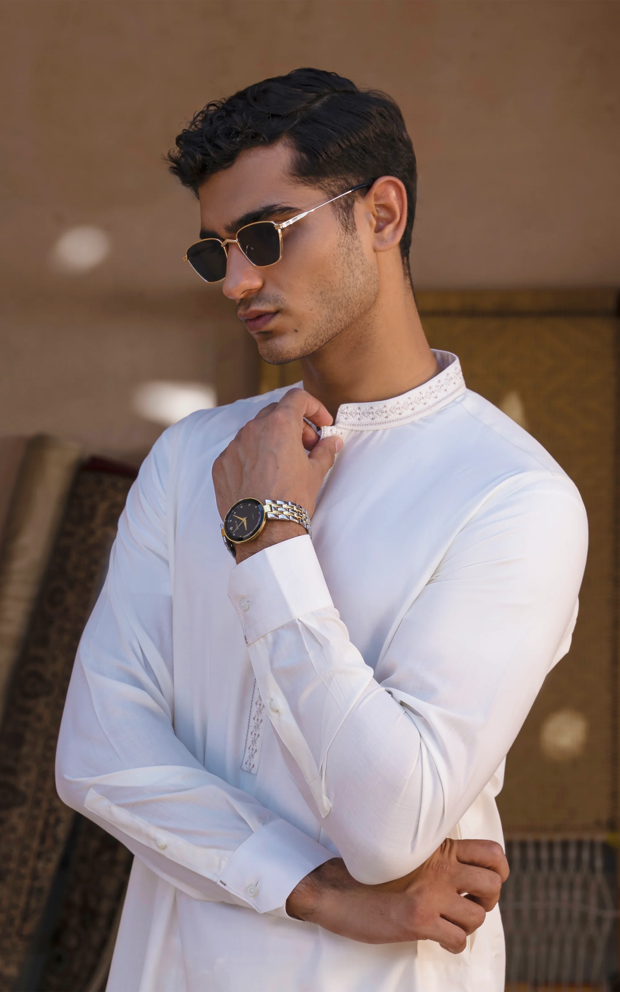 this fabric is constructed from special fibres of polyester and viscose. it is a splendid addition to our summer collection to make you look stupendous in this scathing heat. it also has signature embroidery on it. this article is accessible in medium hues. mandarin ban, hidden placket, dtm buttons inside, embroidery on ban and front placket, cut cuff, stitching details on cuff, straight hem, blended wash & wear