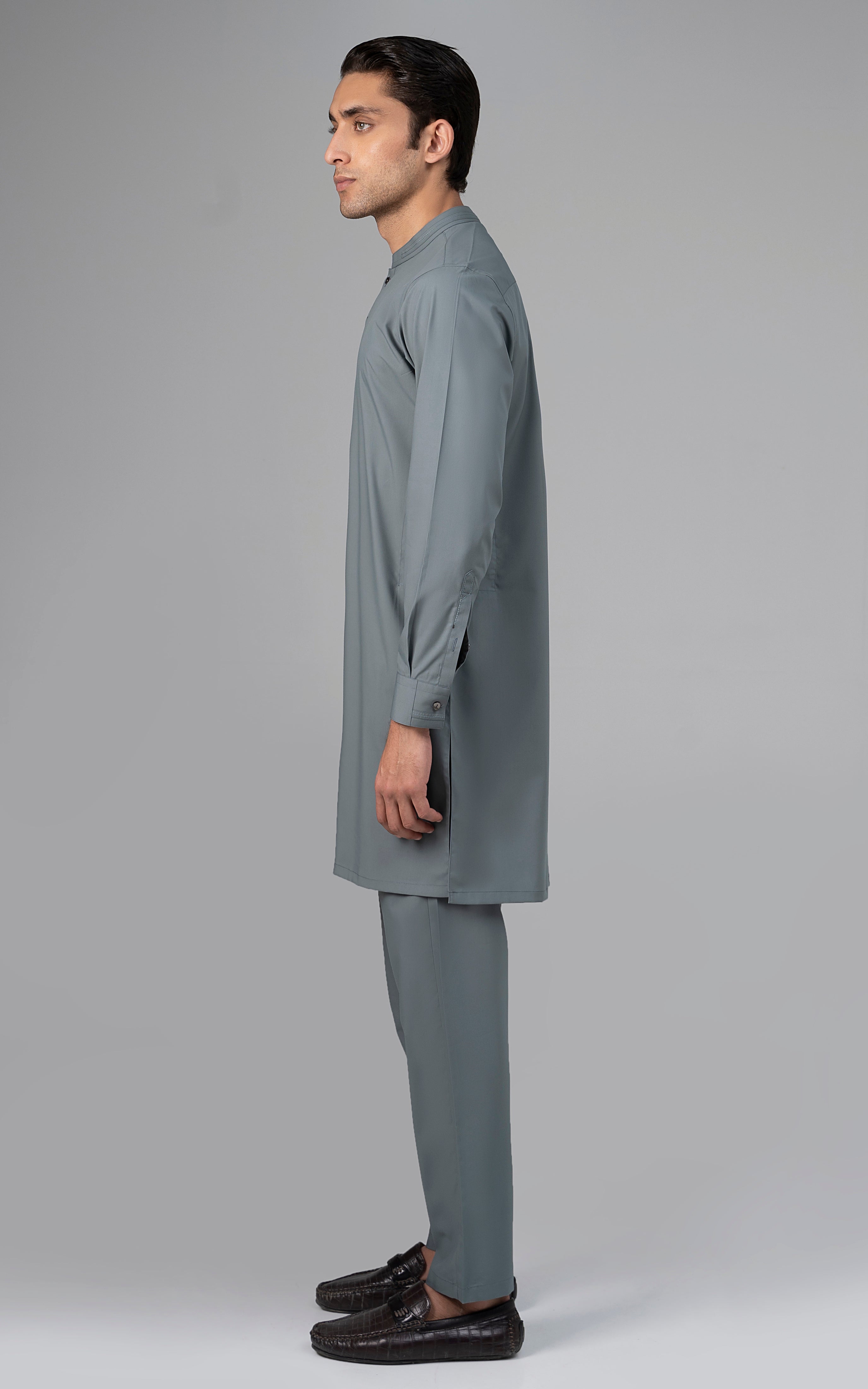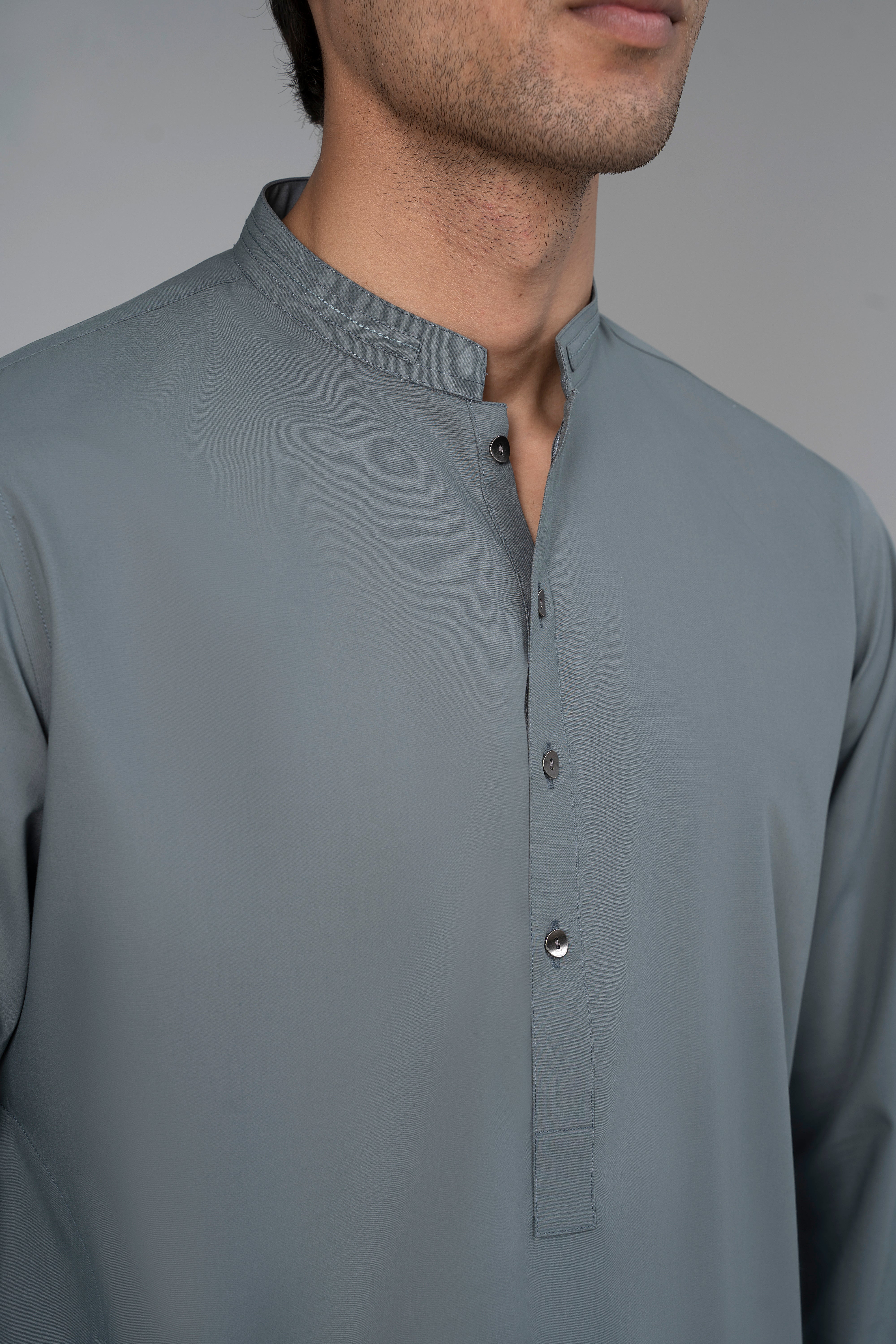 this fabric is the amalgamation of the two finest fibres of polyester and viscose. it has timeless appeal and versatile drape. this graceful cloth is available in beautiful light hues which are absolutely perfect for the summer season. mandarin ban, stitching and thread details on ban, visible placket, straight cuff, stitching and thread details on cuff and sleeve placket, straight hem, metal buttons, premium blended fabric