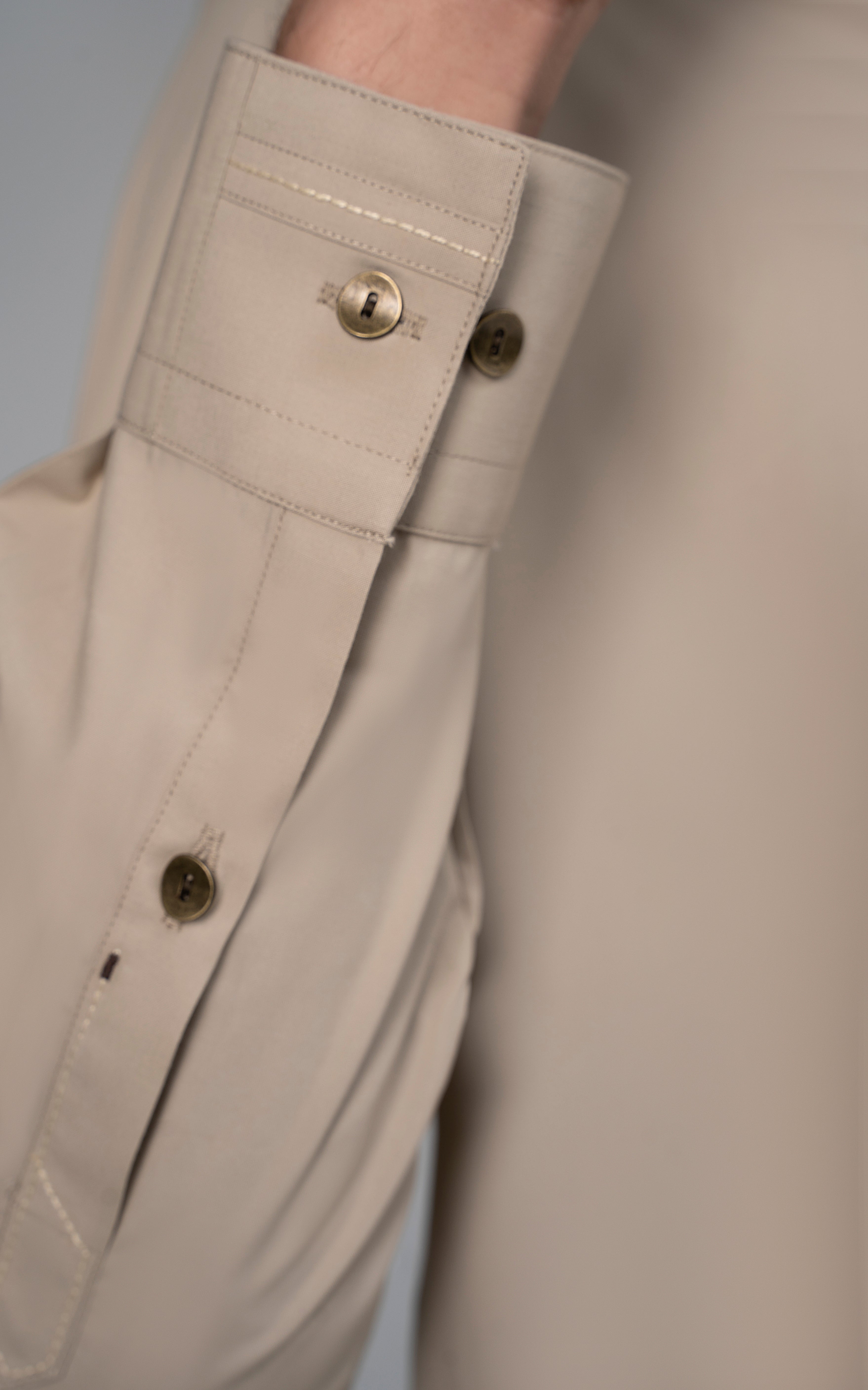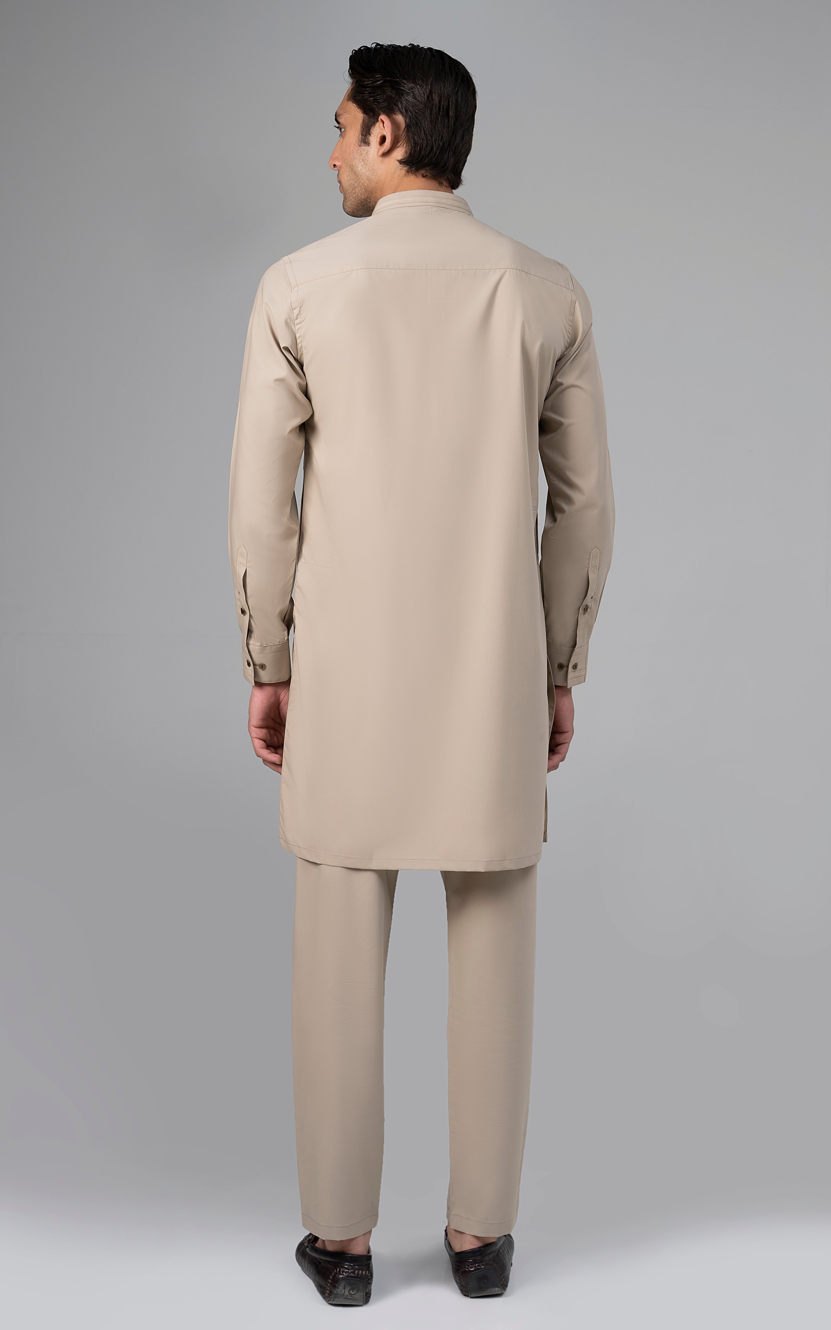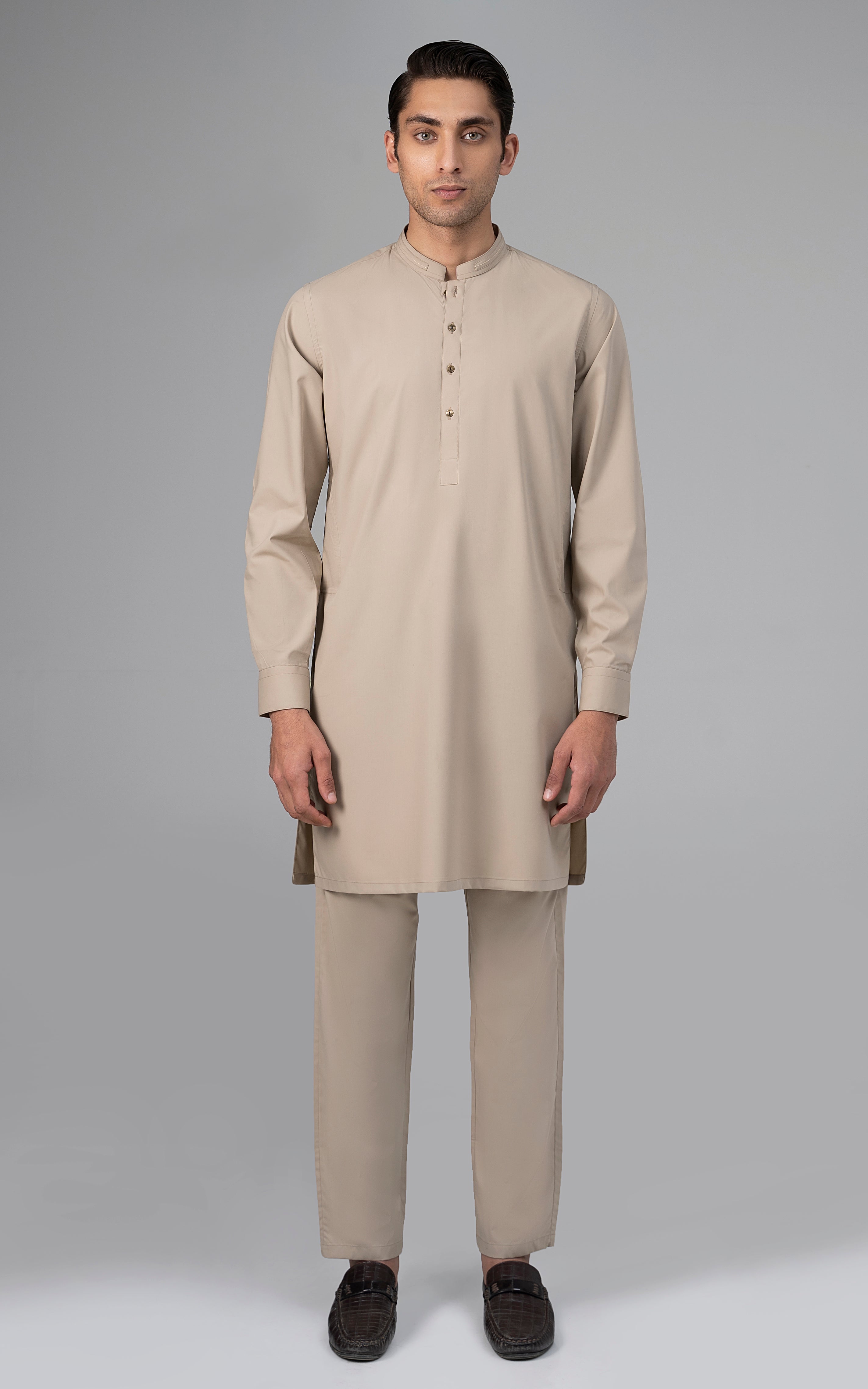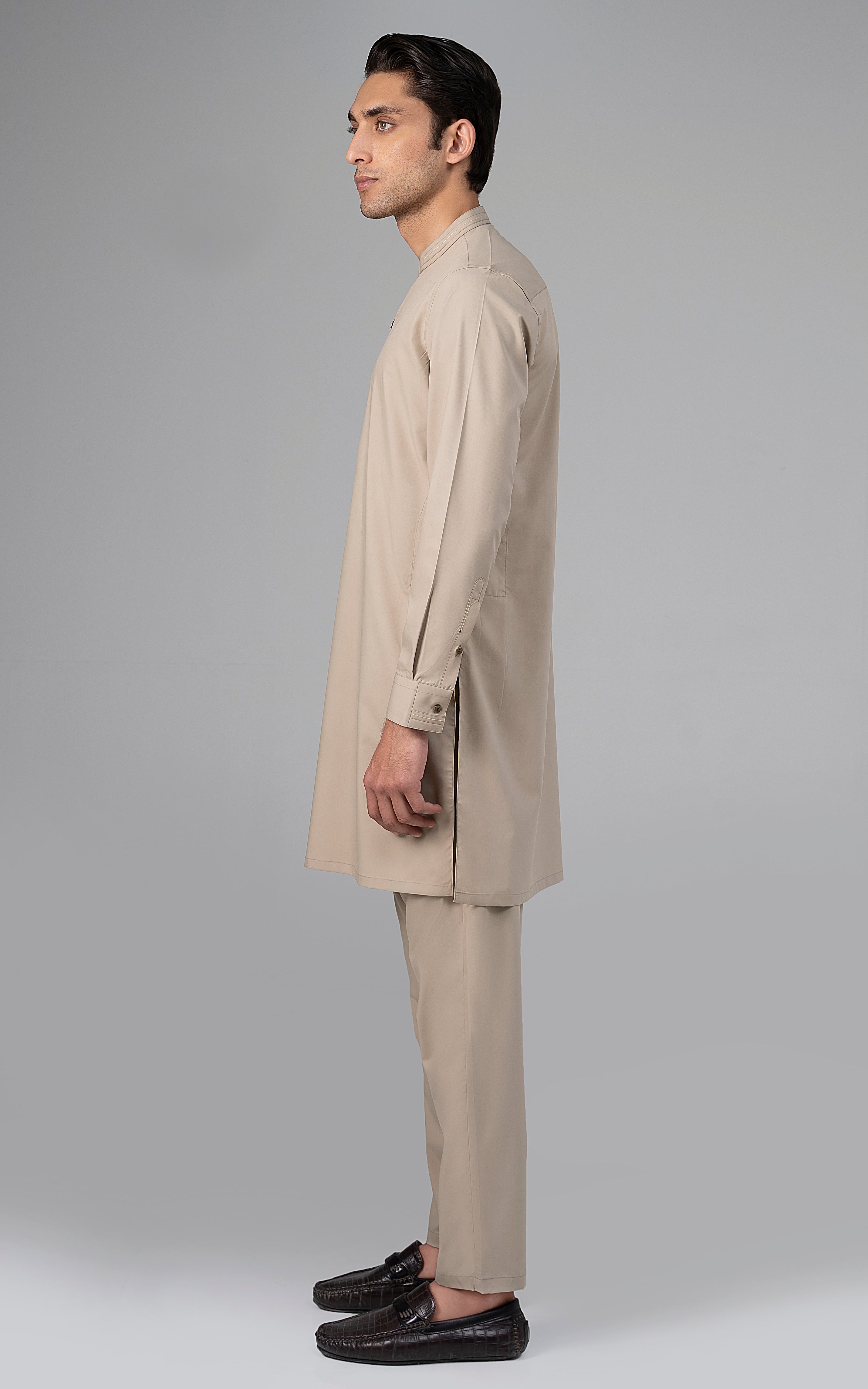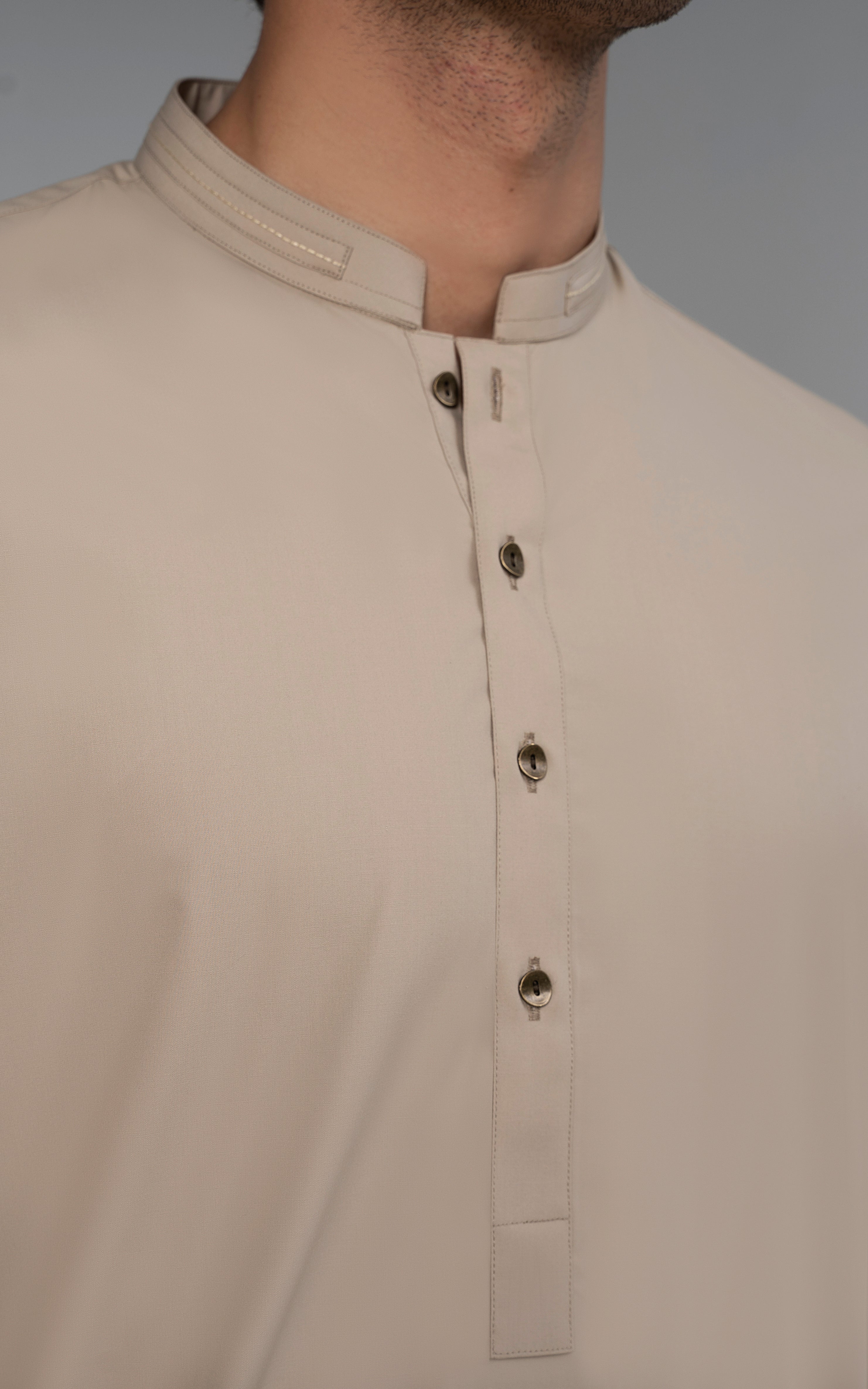 this fabric is the amalgamation of the two finest fibres of polyester and viscose. it has timeless appeal and versatile drape. this graceful cloth is available in beautiful light hues which are absolutely perfect for the summer season. mandarin ban, stitching and thread details on ban, visible placket, straight cuff, stitching and thread details on cuff and sleeve placket, straight hem, metal buttons, premium blended fabric