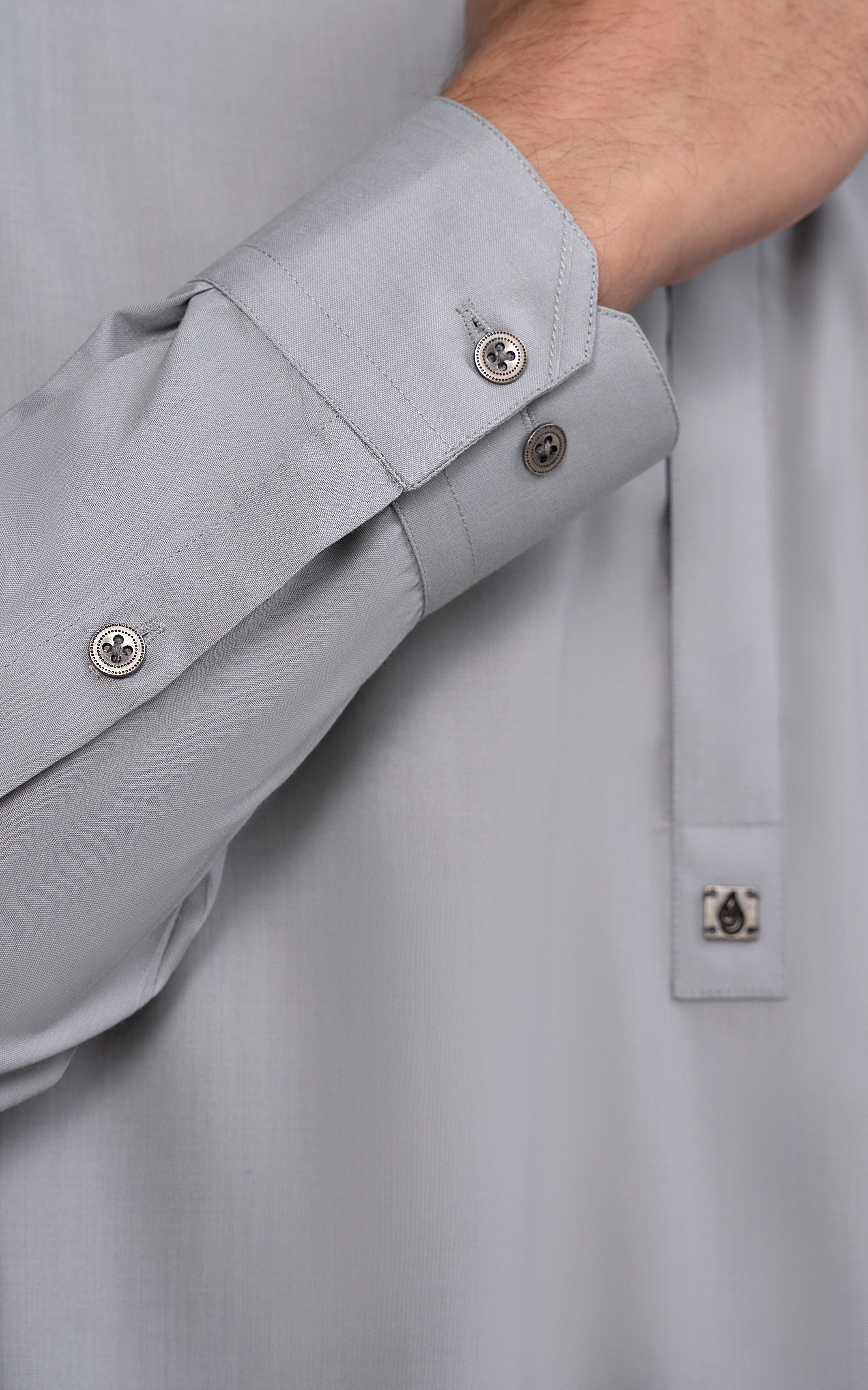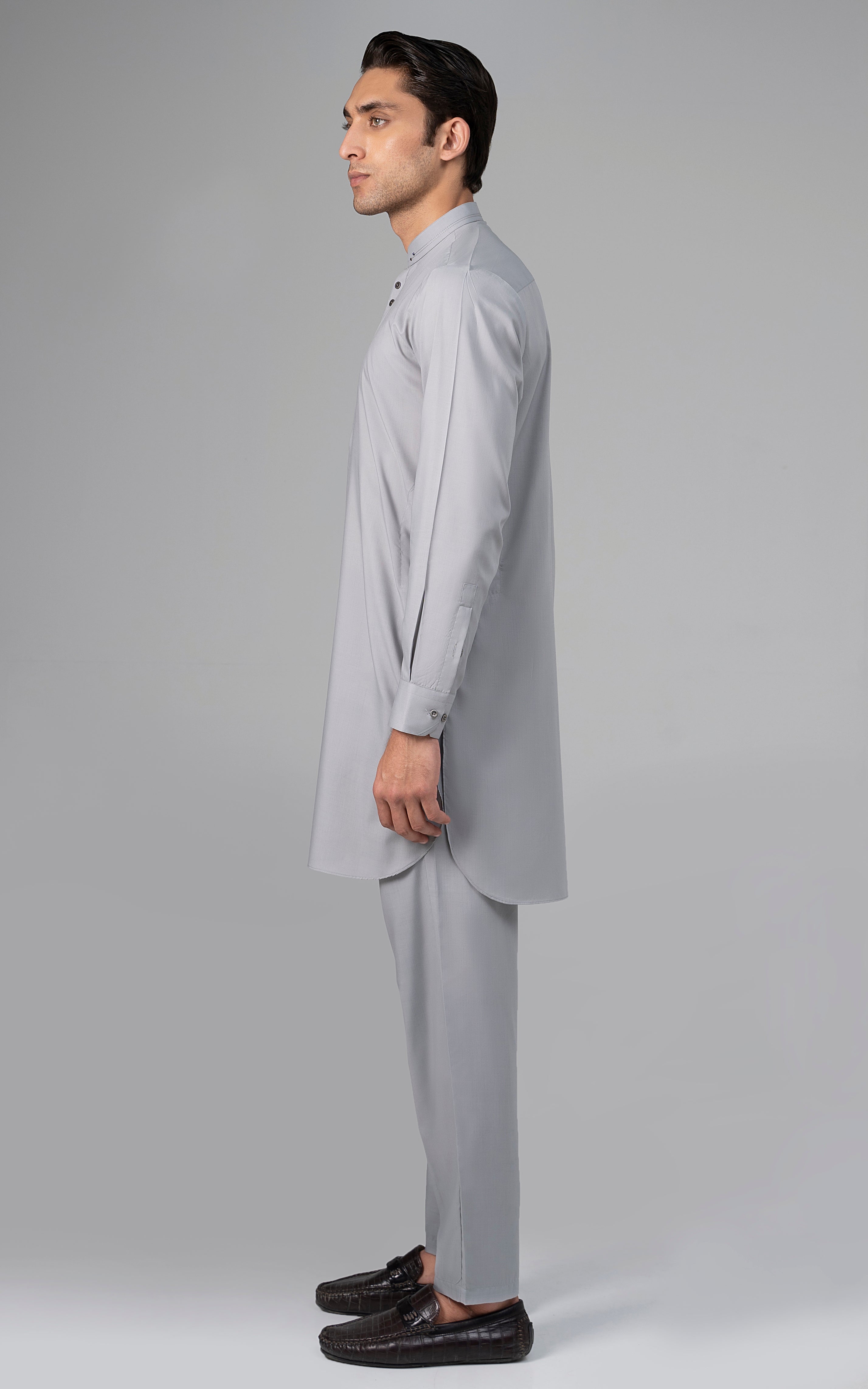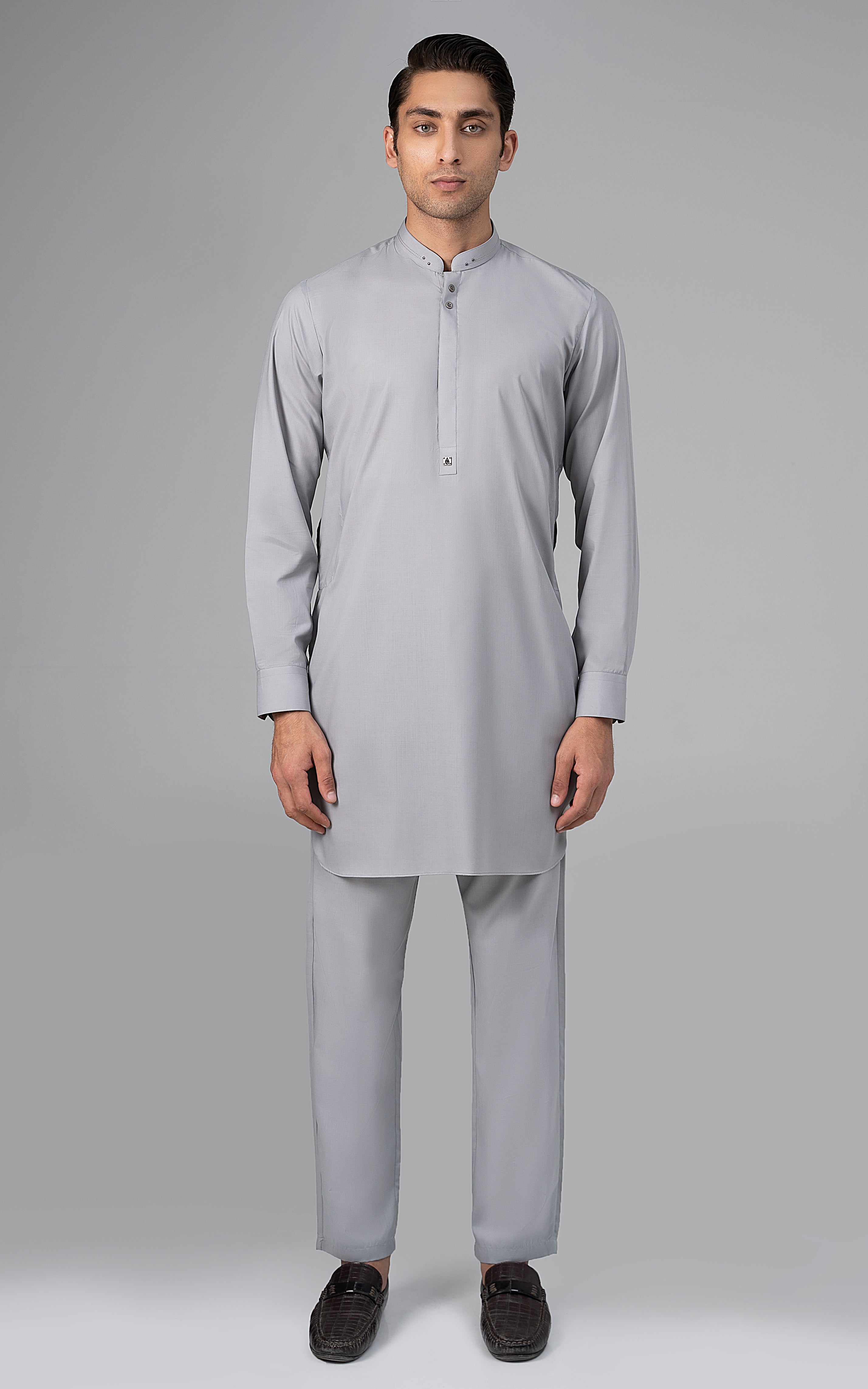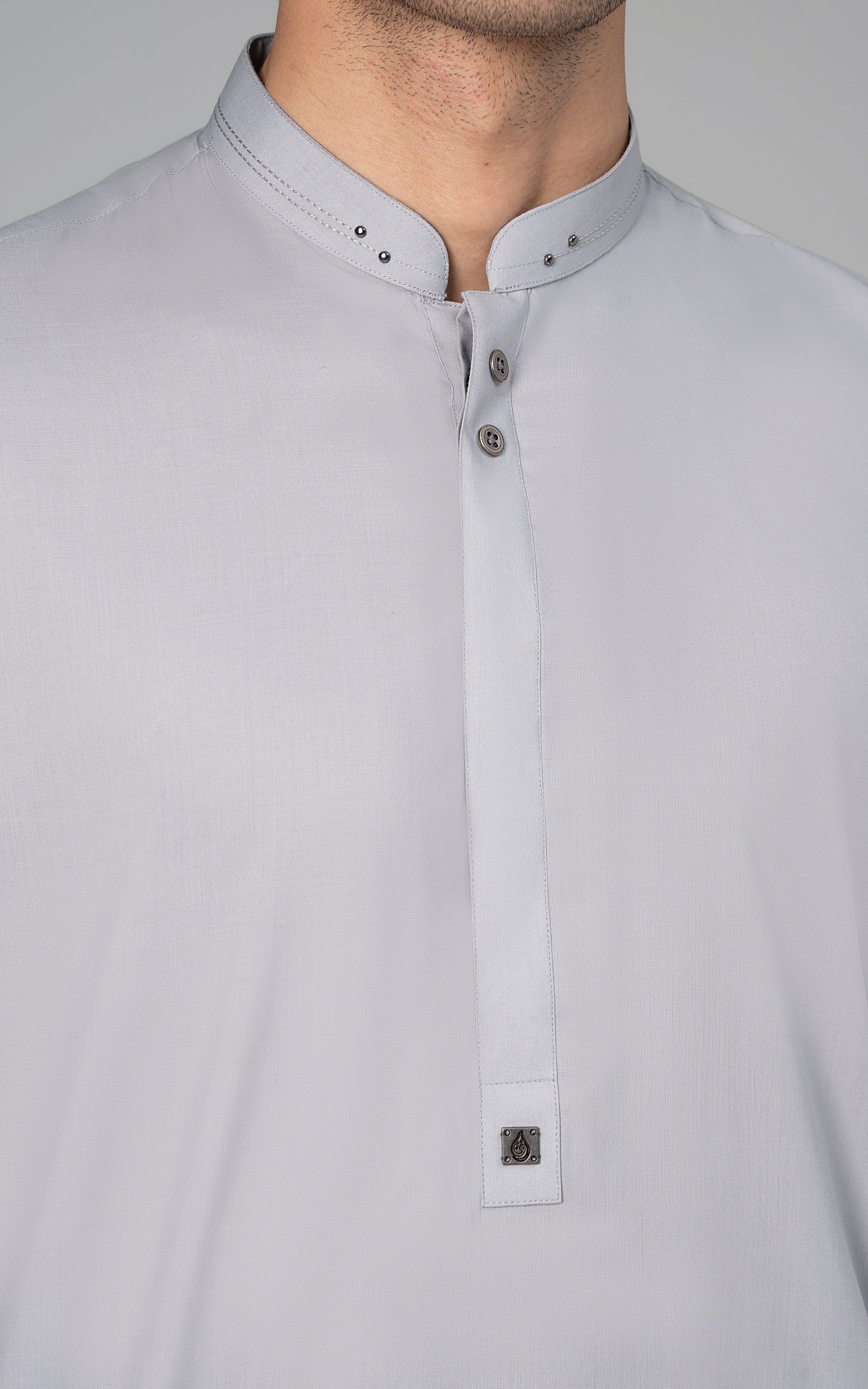 this fabric is ethereal and eminent blend of polyester and viscose. it is a marvelous fabric with a delicate touch and is admirably lustrous available in mesmerizing mellow light colors. mandarin ban, stitching and trim details on ban, hidden placket , trim details on front placket, cut cuff, round hem, metal buttons, pv blended
