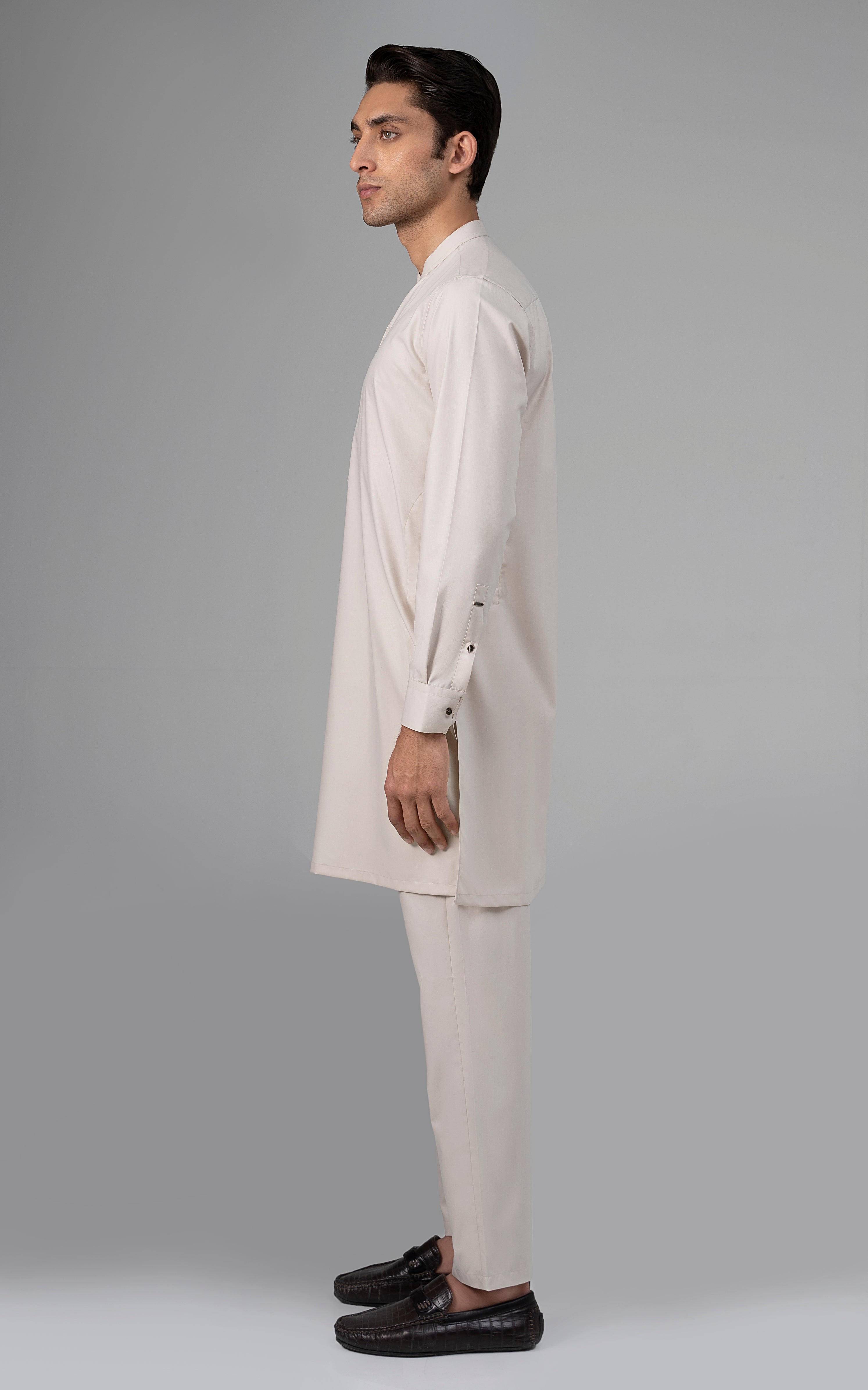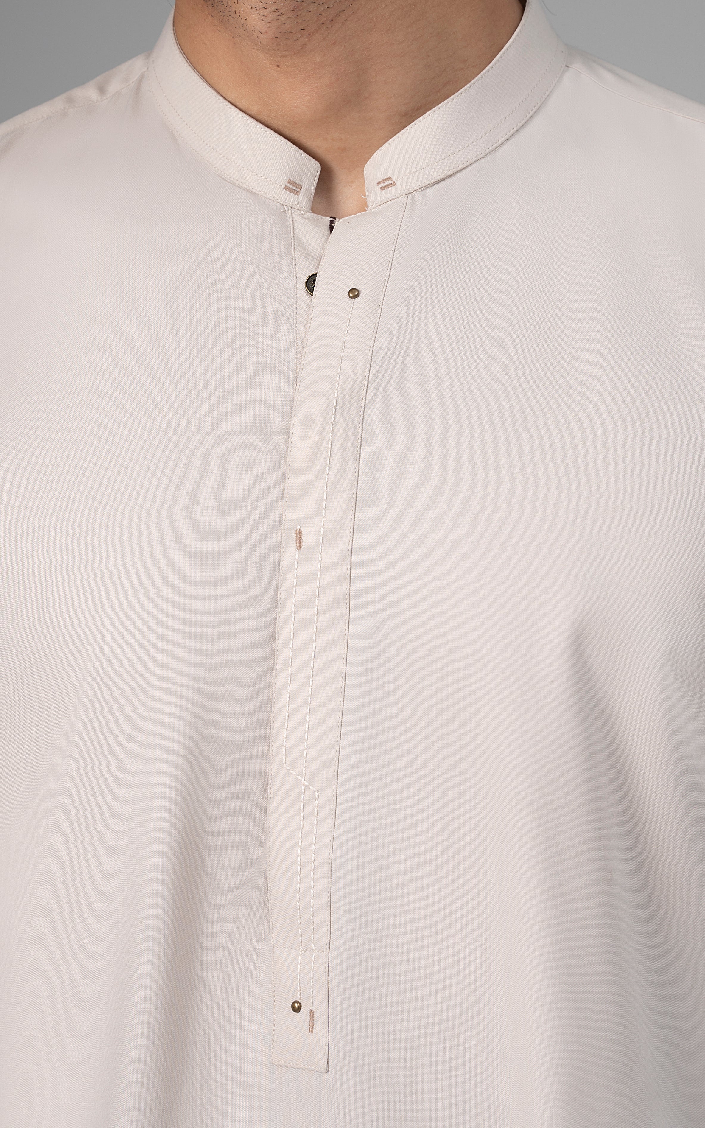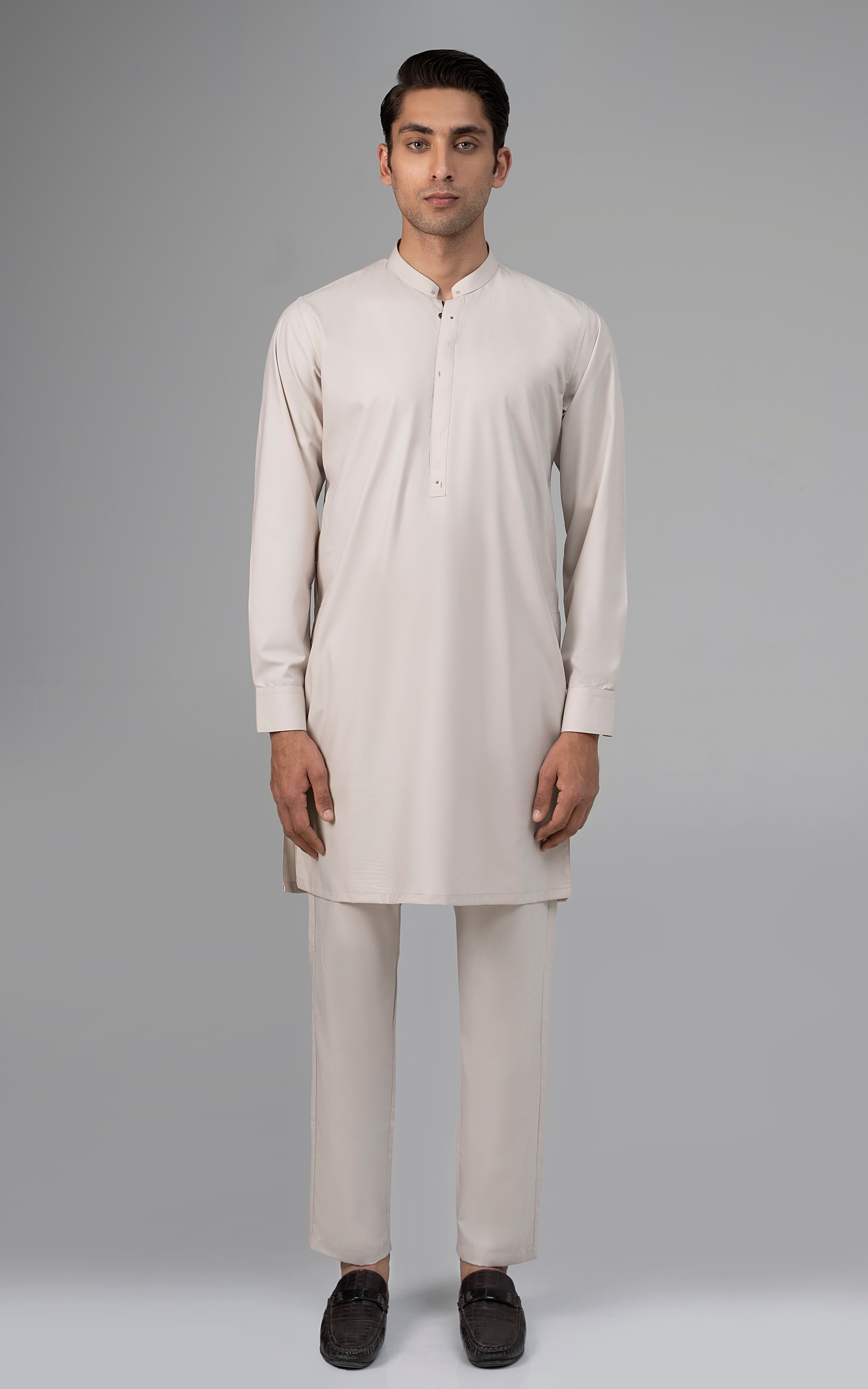 this fabric displays a blend of viscose and super fine polyester which manifests marvelous hand feel and appearance. it is available in striking and refreshing light colors in perfect harmony with the summer season. mandarin ban, piping on button placket, hidden placket, stitching and trim details on ban & front placket, cut cuff, stitching & trim details on cuff & sleeve placket, straight hem, pv blended