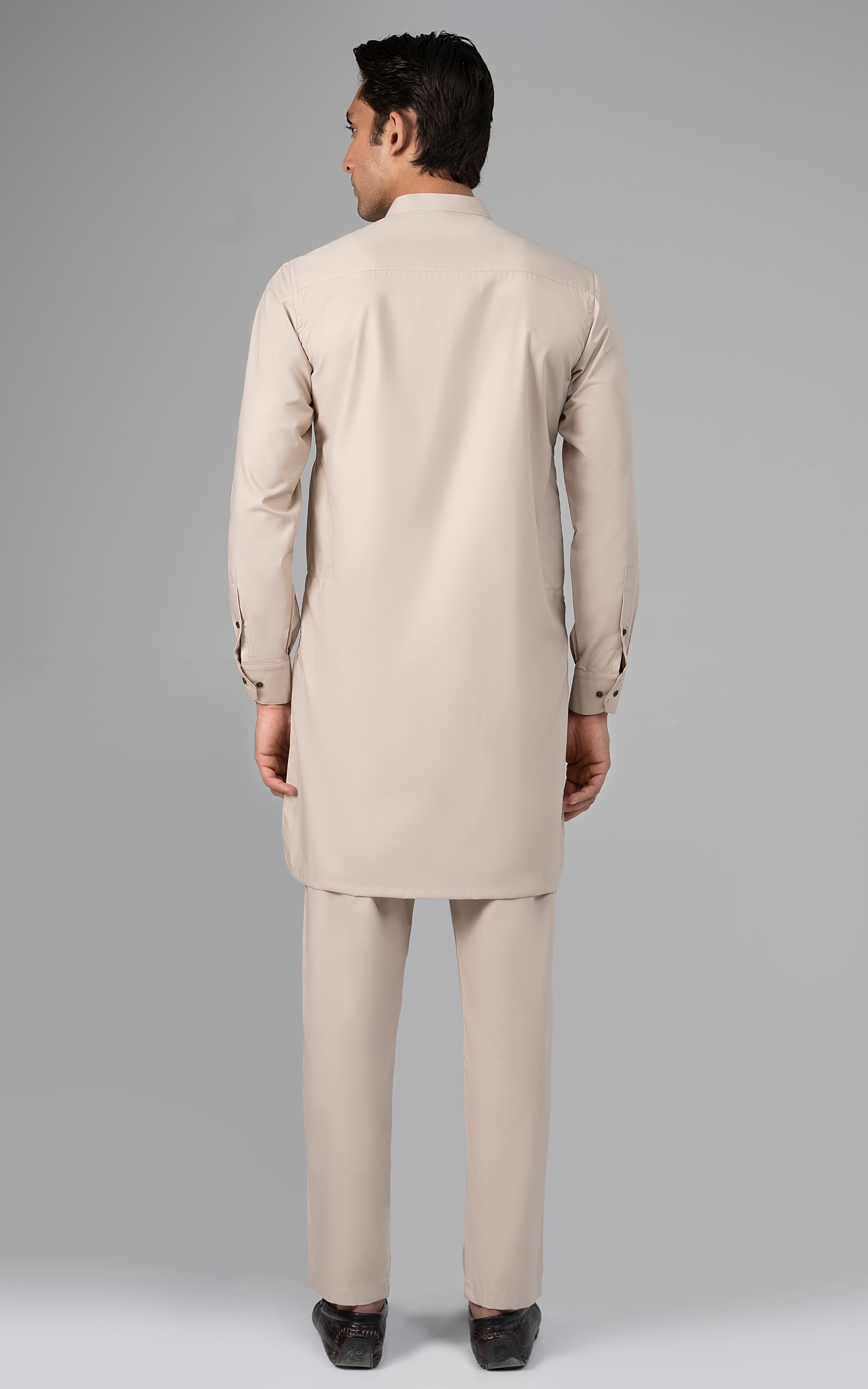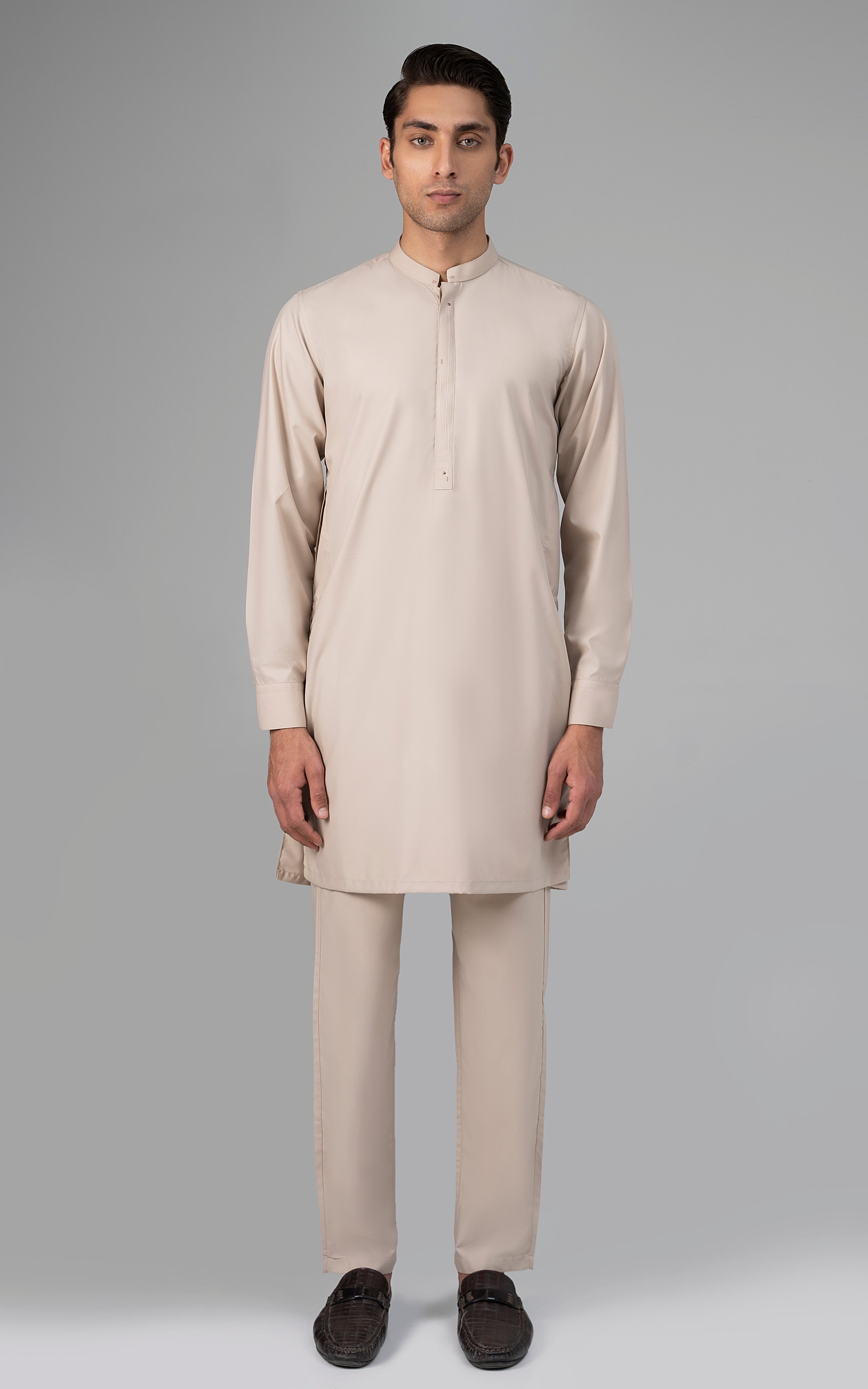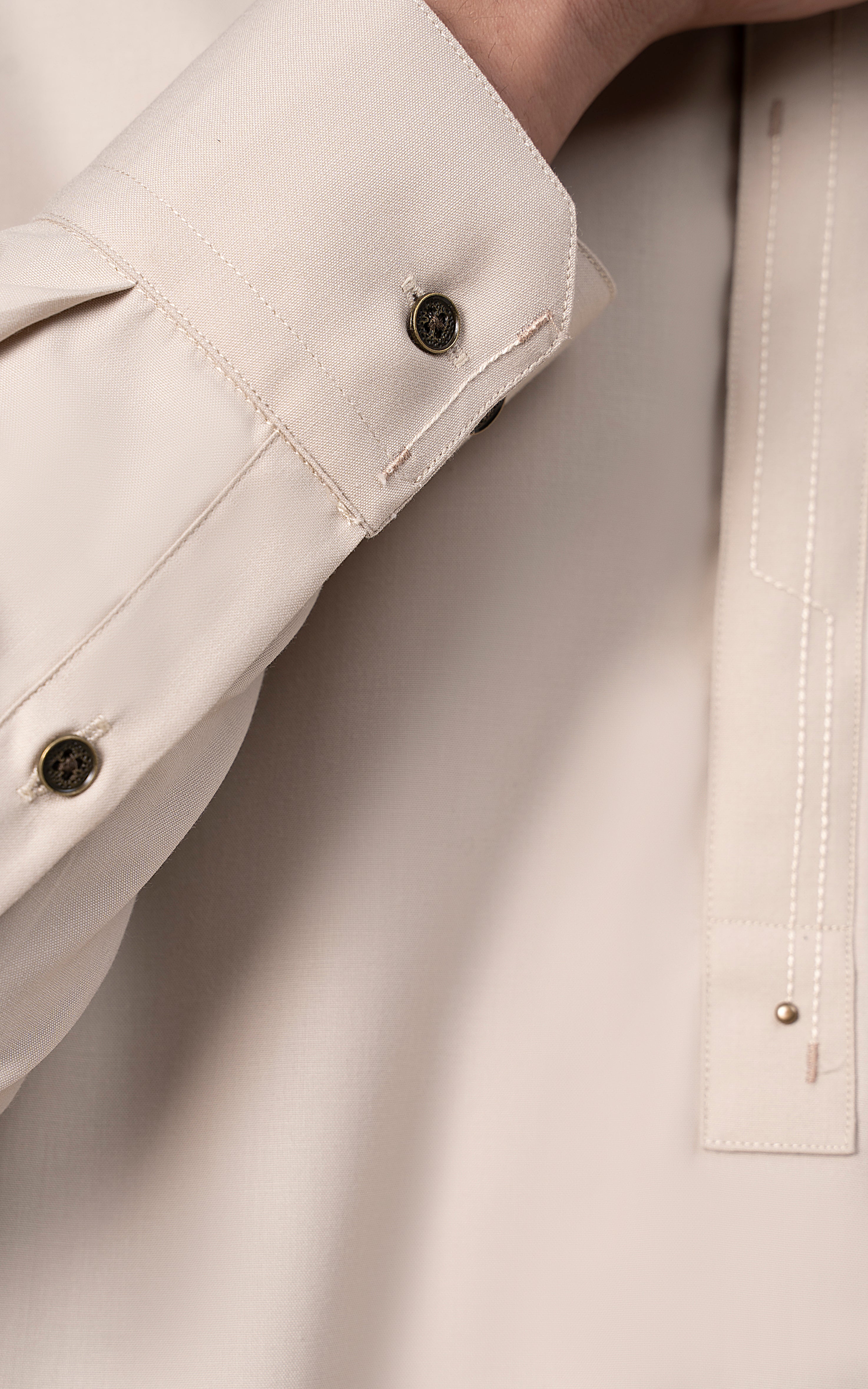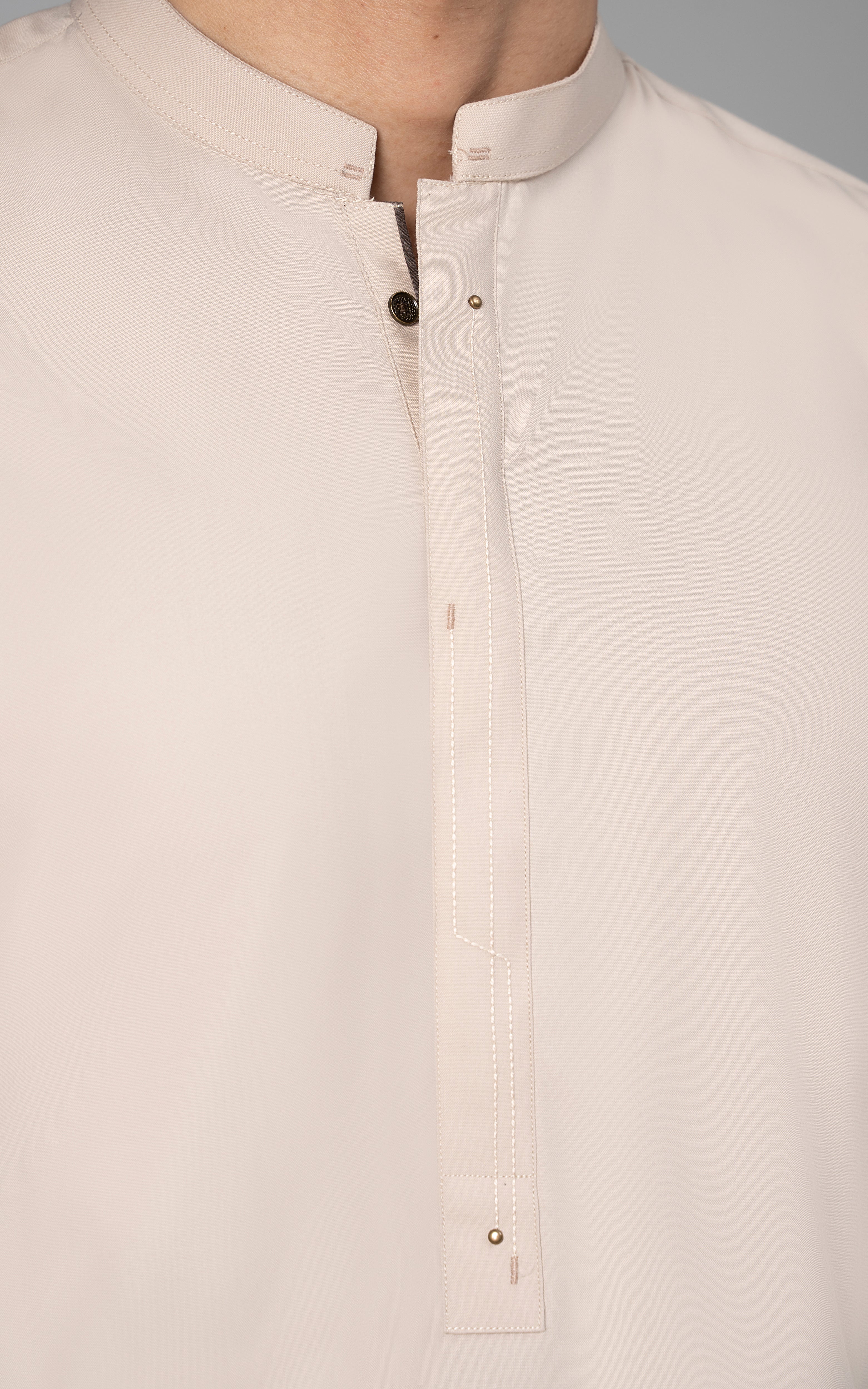 this fabric displays a blend of viscose and super fine polyester which manifests marvelous hand feel and appearance. it is available in striking and refreshing light colors in perfect harmony with the summer season. mandarin ban, piping on button placket, hidden placket, stitching and trim details on ban & front placket, cut cuff, stitching & trim details on cuff & sleeve placket, straight hem, pv blended