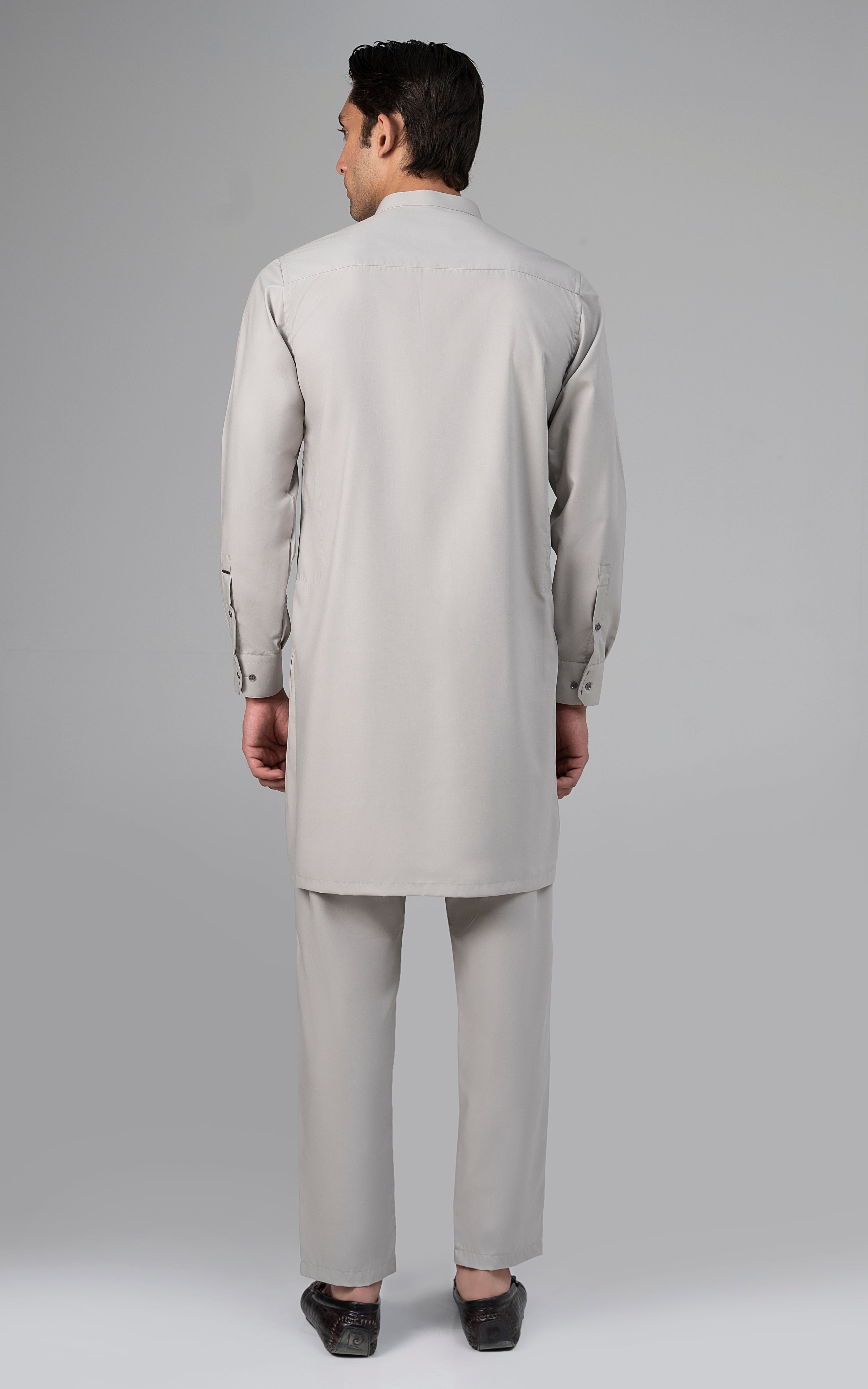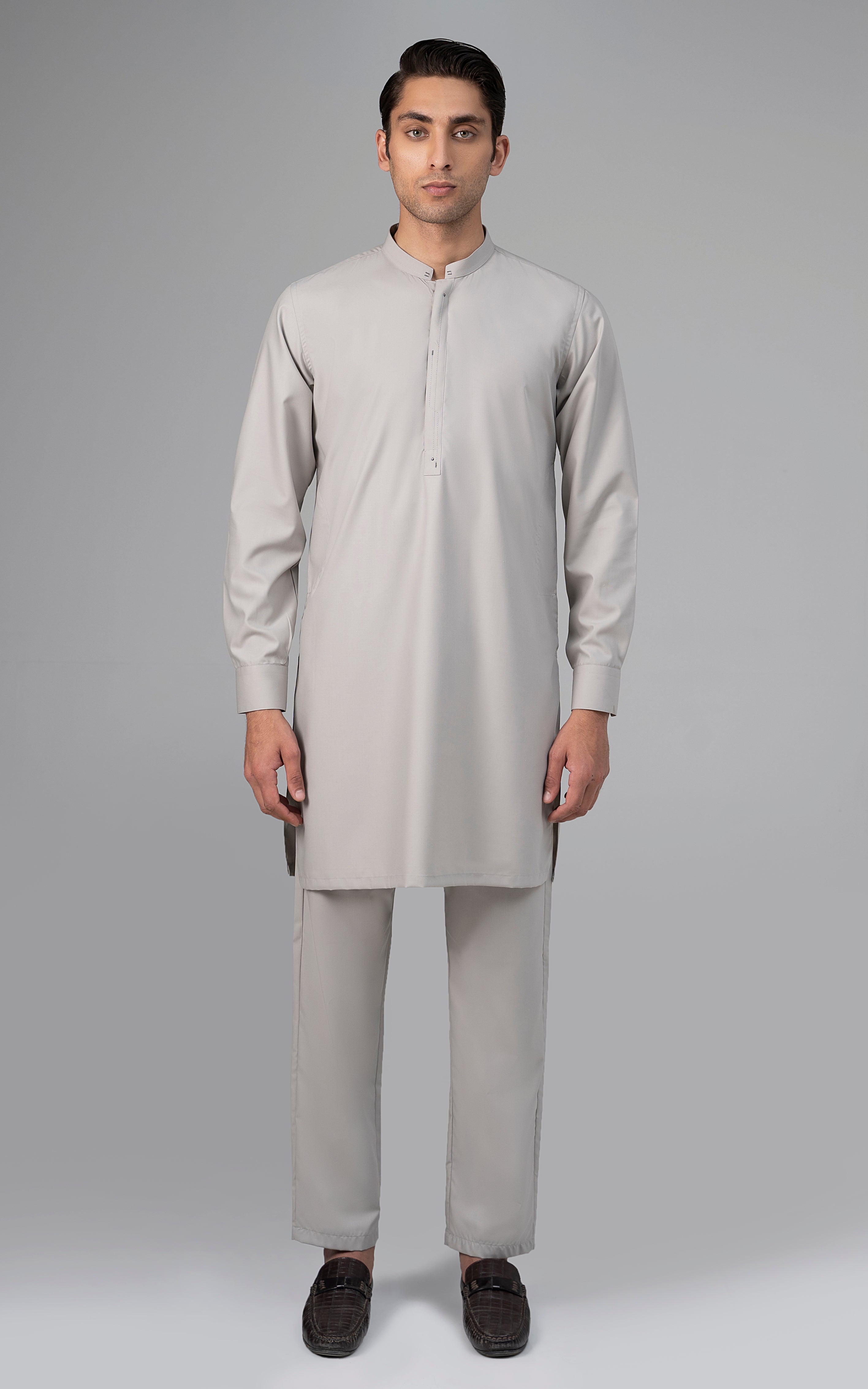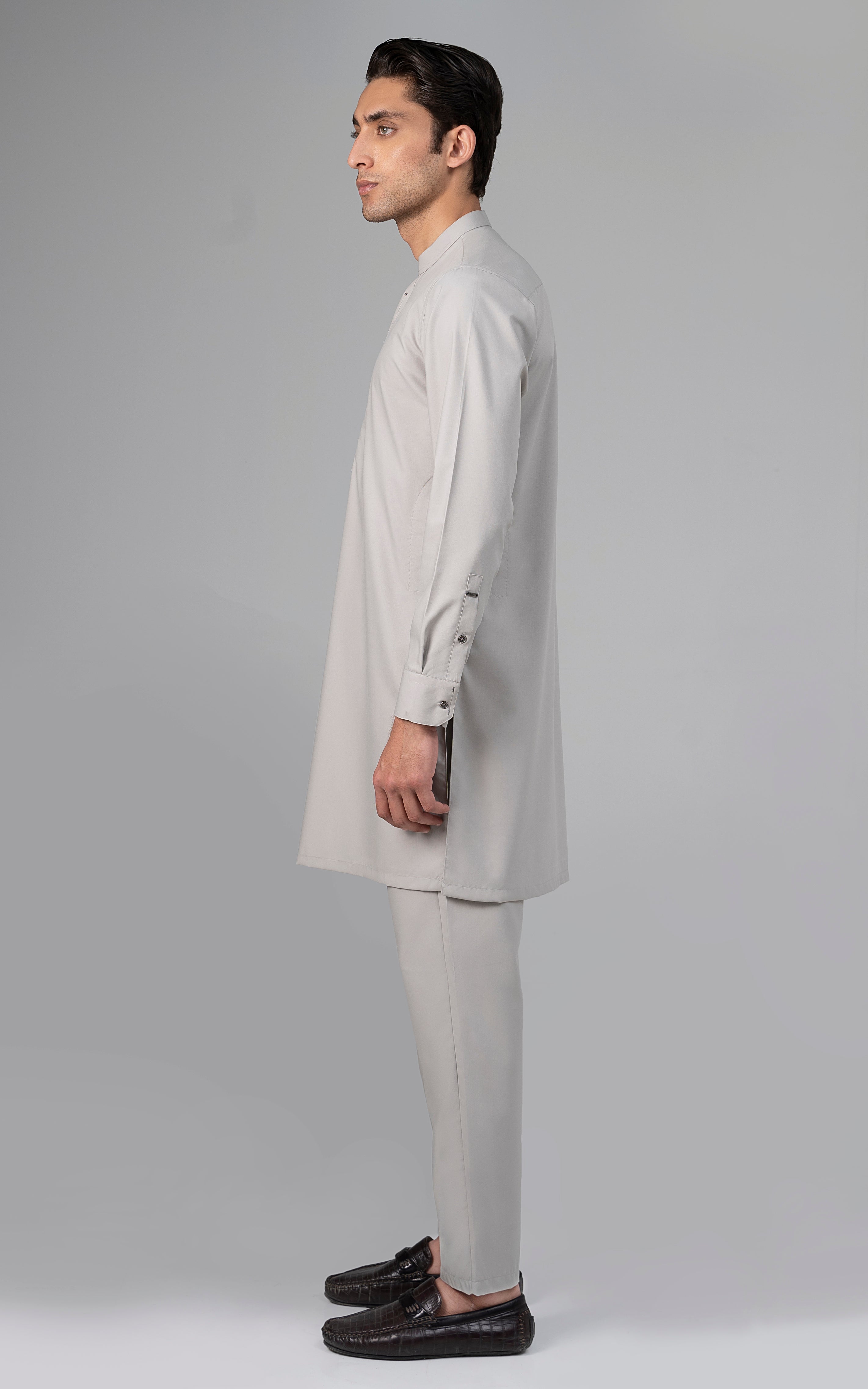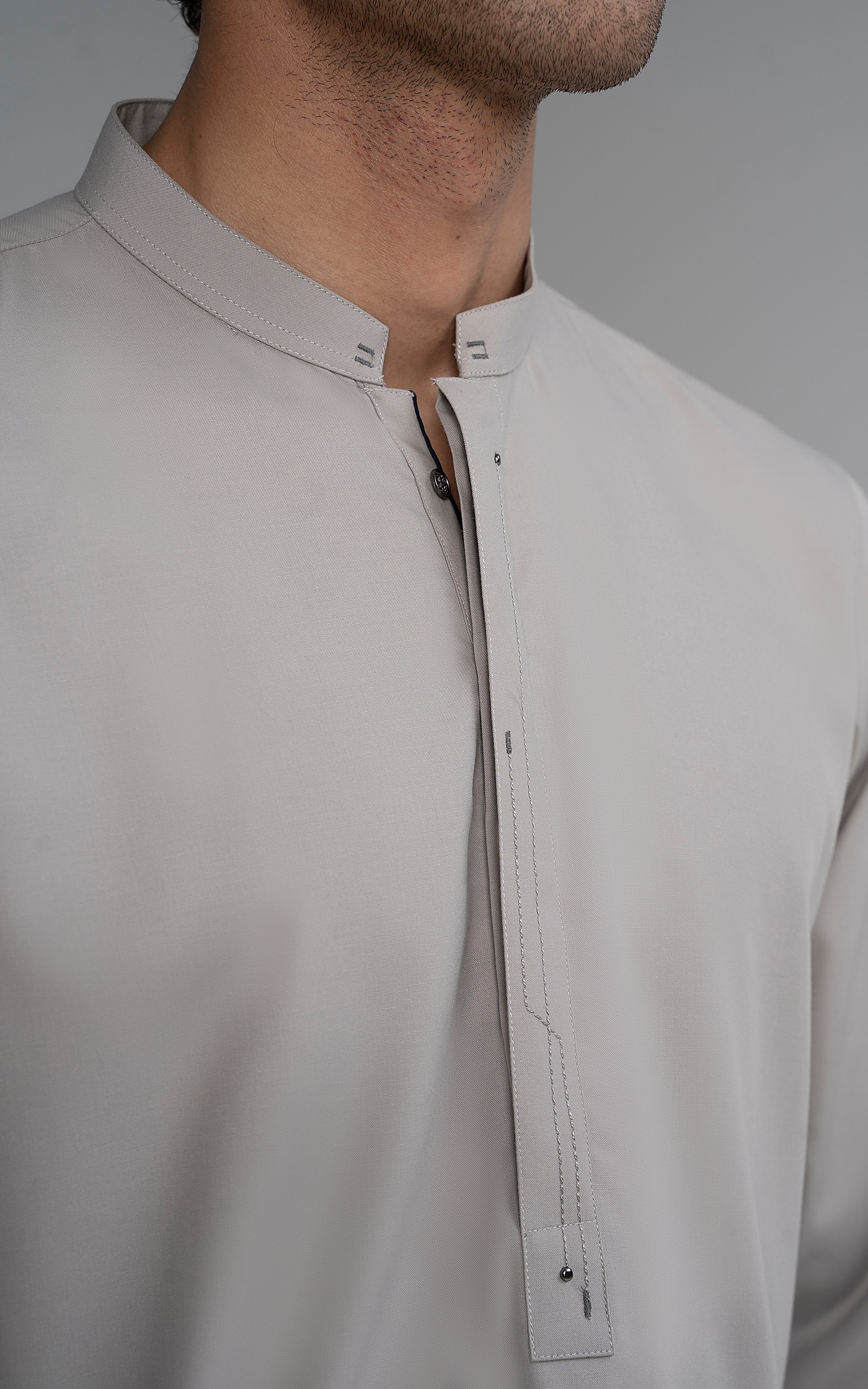 this fabric displays a blend of viscose and super fine polyester which manifests marvelous hand feel and appearance. it is available in striking and refreshing light colors in perfect harmony with the summer season. mandarin ban, piping on button placket, hidden placket, stitching and trim details on ban & front placket, cut cuff, stitching & trim details on cuff & sleeve placket, straight hem, pv blended