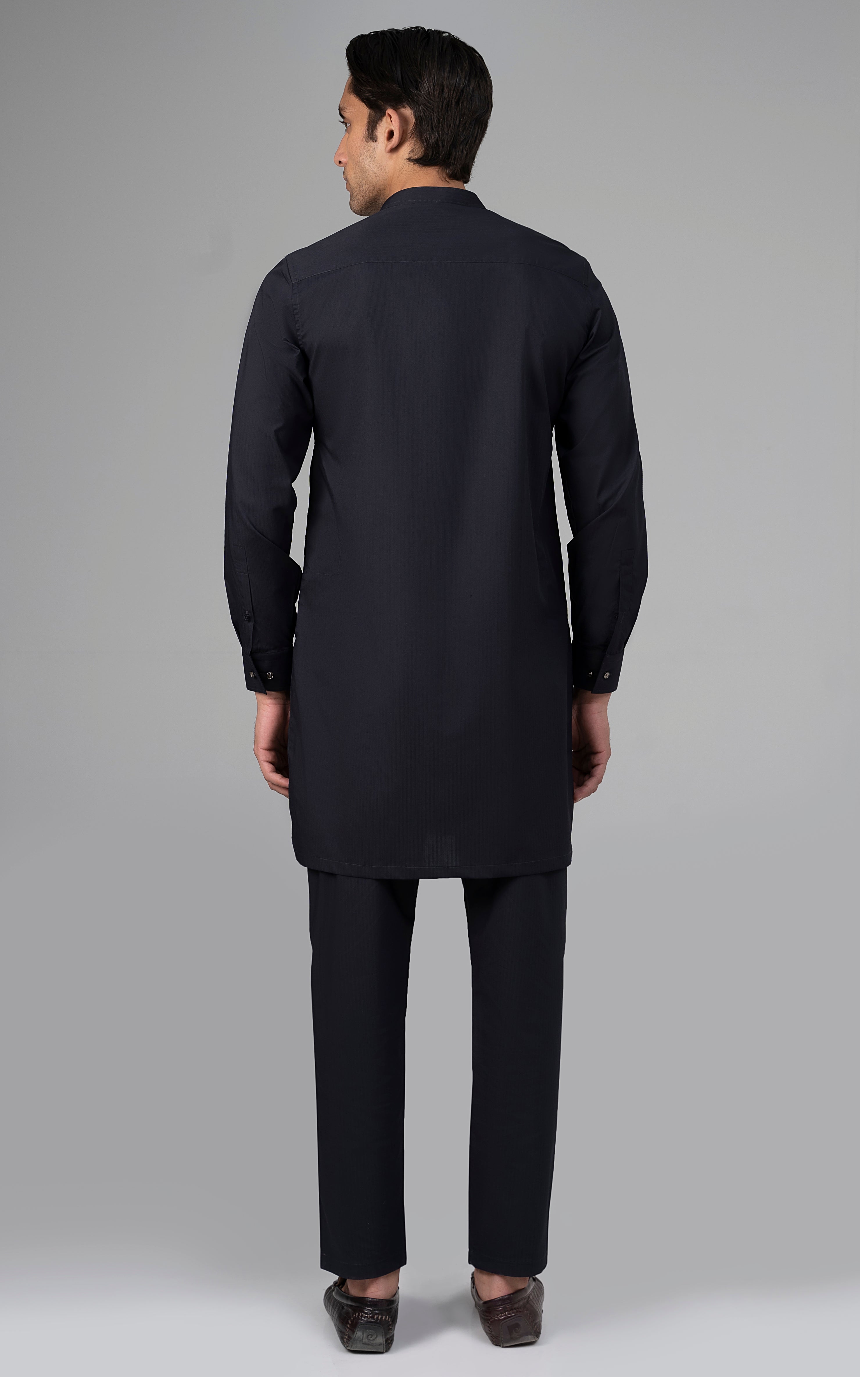 this self lining textured fabric is constructed with super fine cotton and polyester. a textured cloth is created by using flexible fabric yarns into multiple variants of interlocking yarns to create a design that is in itself an impeccable pattern. this article is available in black color. mandarin ban, piping on button placket, visible placket, straight cuff, straight hem, special buttons, cotton blended
