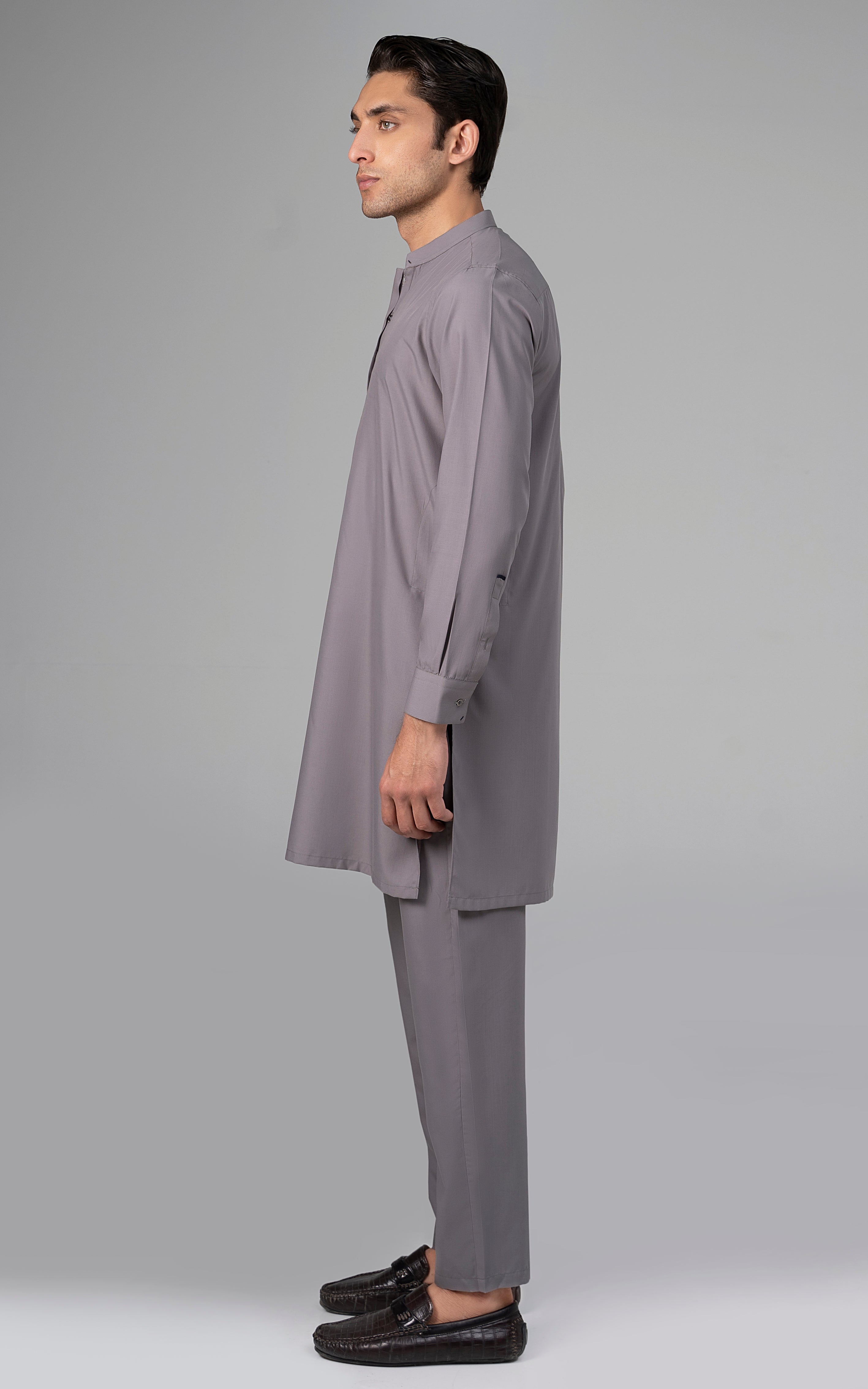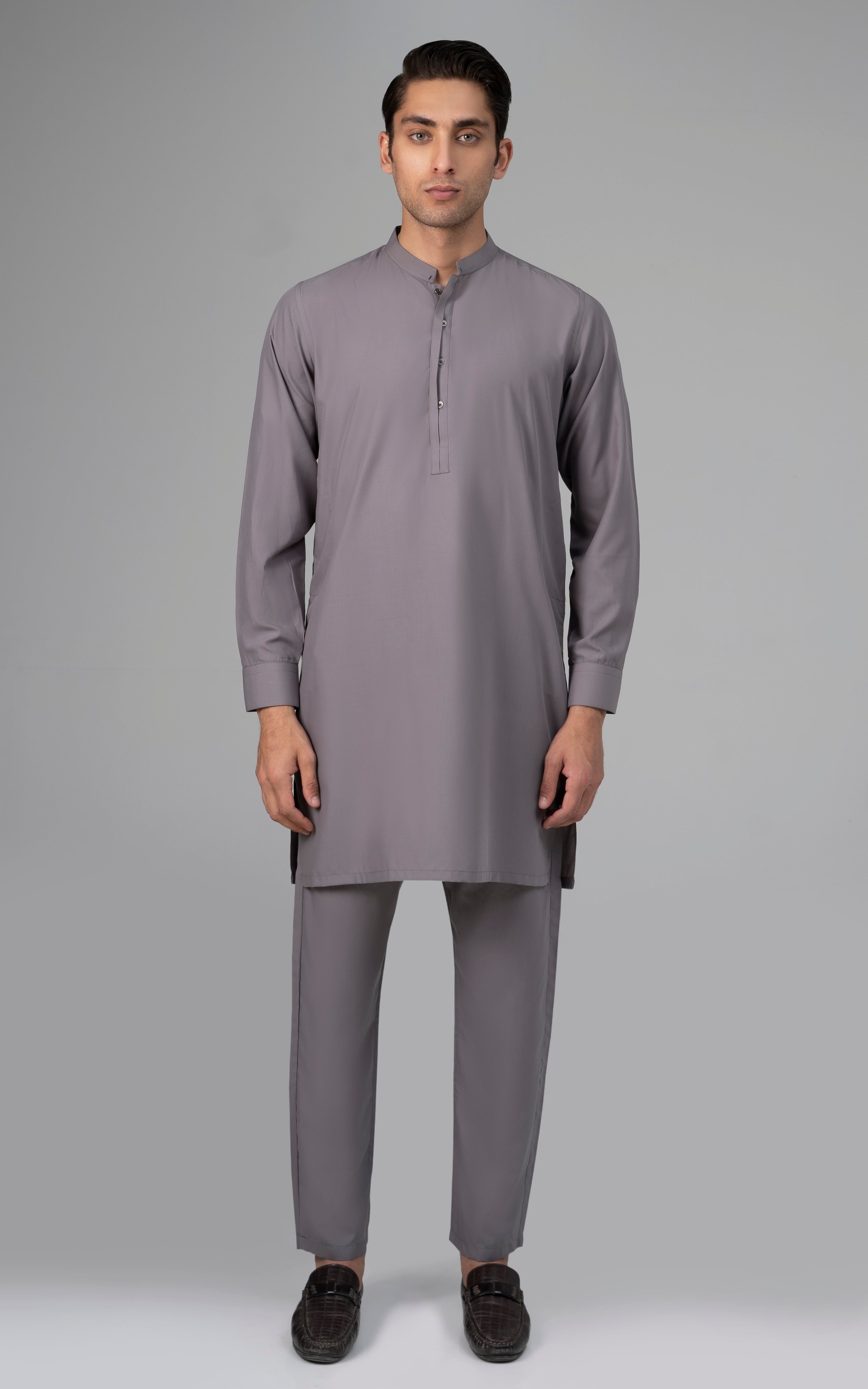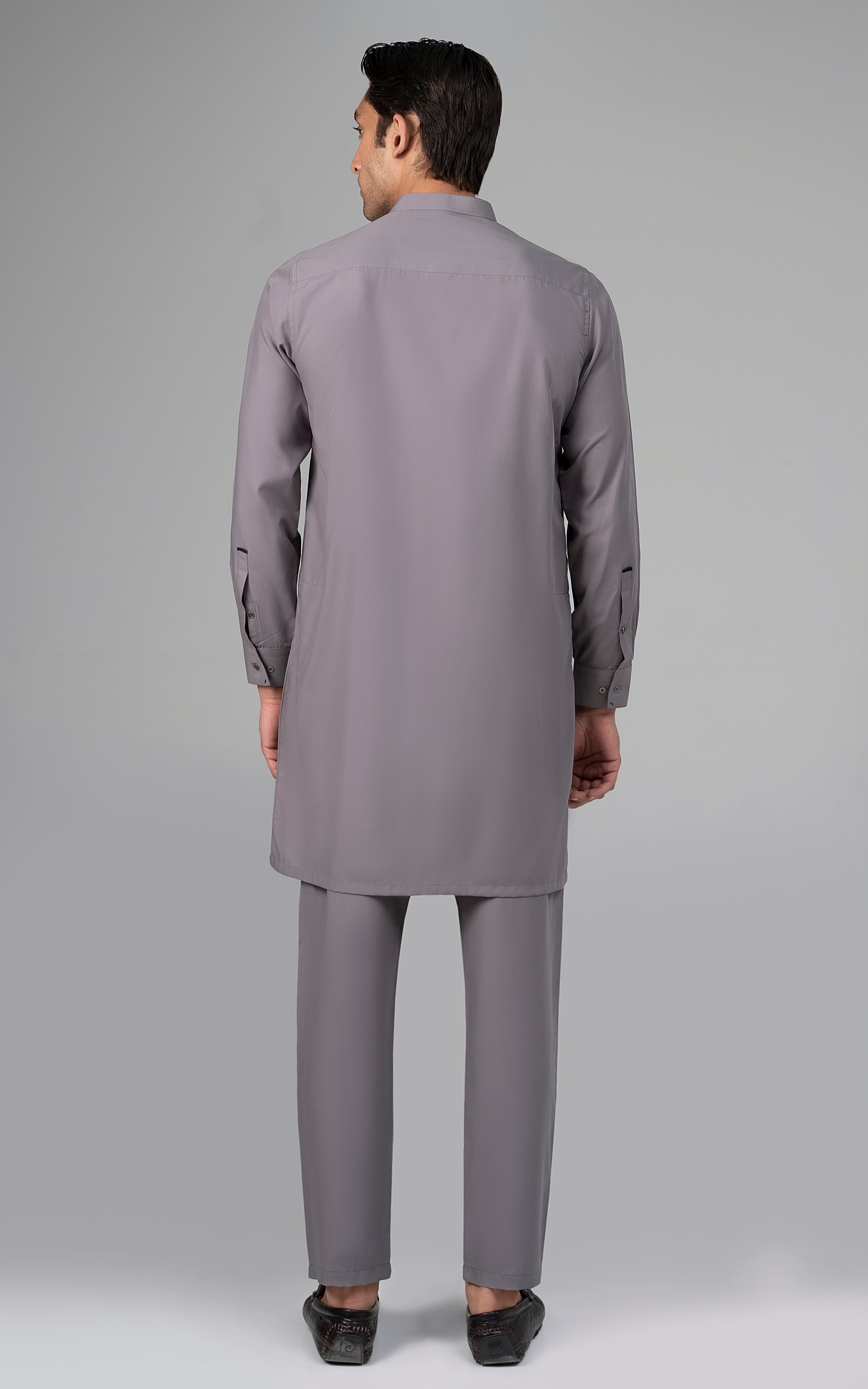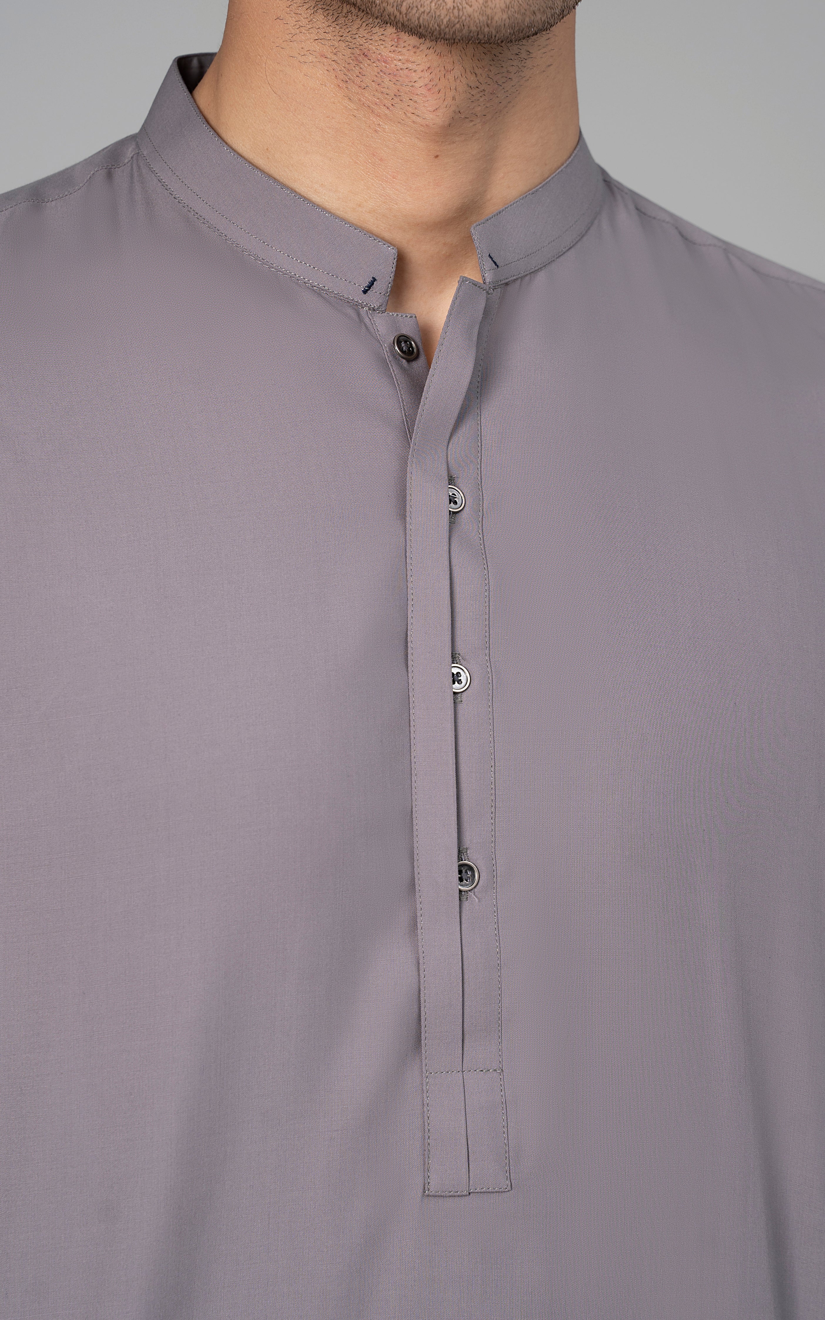 this self lining textured fabric is constructed with super fine cotton and polyester. a textured cloth is created by using flexible fabric yarns into multiple variants of interlocking yarns to create a design that is in itself an impeccable pattern. this article is available in black color. mandarin ban, piping on button placket, visible placket, straight cuff, straight hem, special buttons, cotton blended