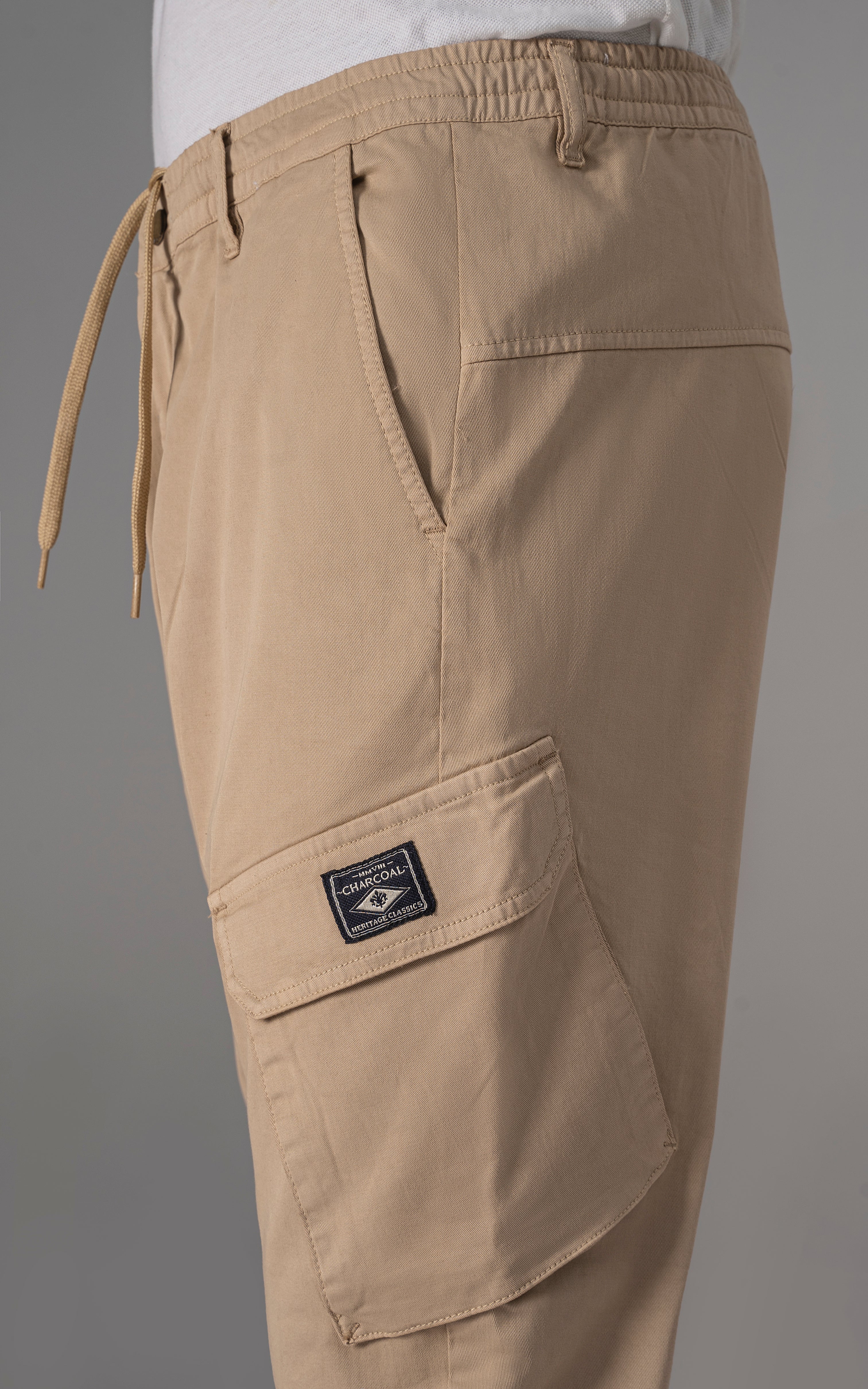 introducing our cargo pockets jogger trousers: crafted from super stretch twill cotton for all-day comfort. featuring slanted cargo pockets with a zipper on the left leg, and a branded label for style. with an elasticated waistband and back yoke with a bone pocket, these trousers offer both comfort and urban flair. perfect for any occasion.