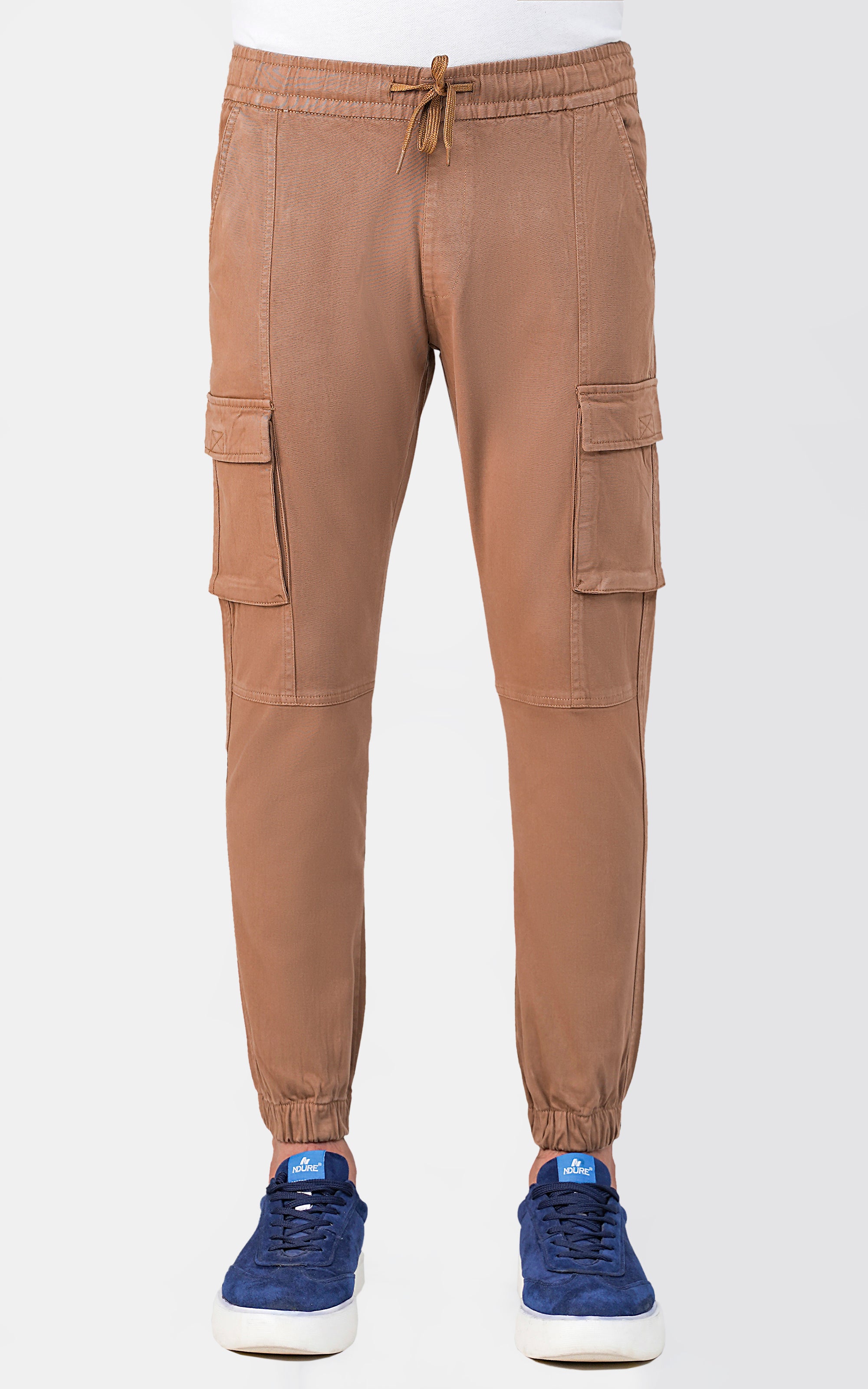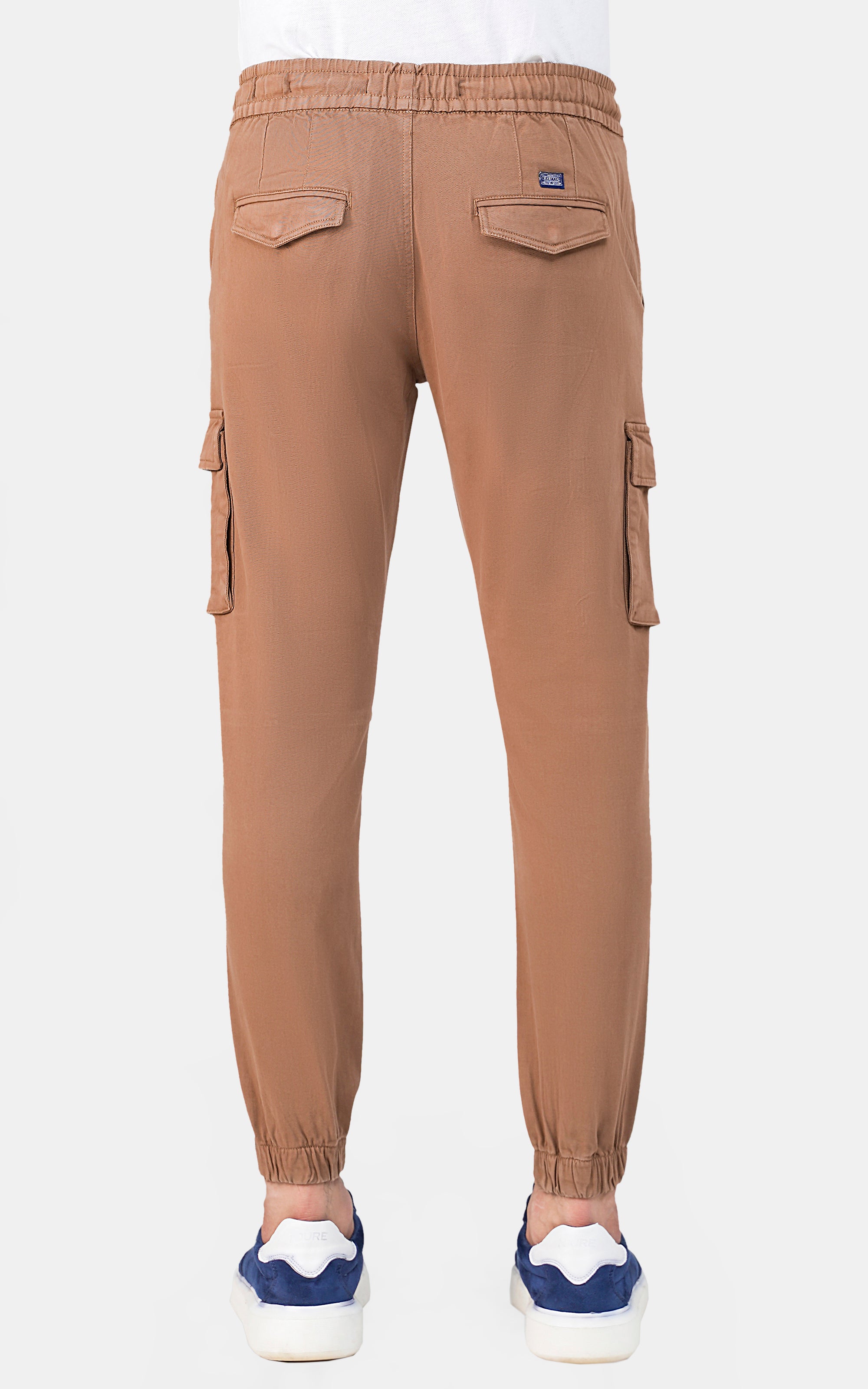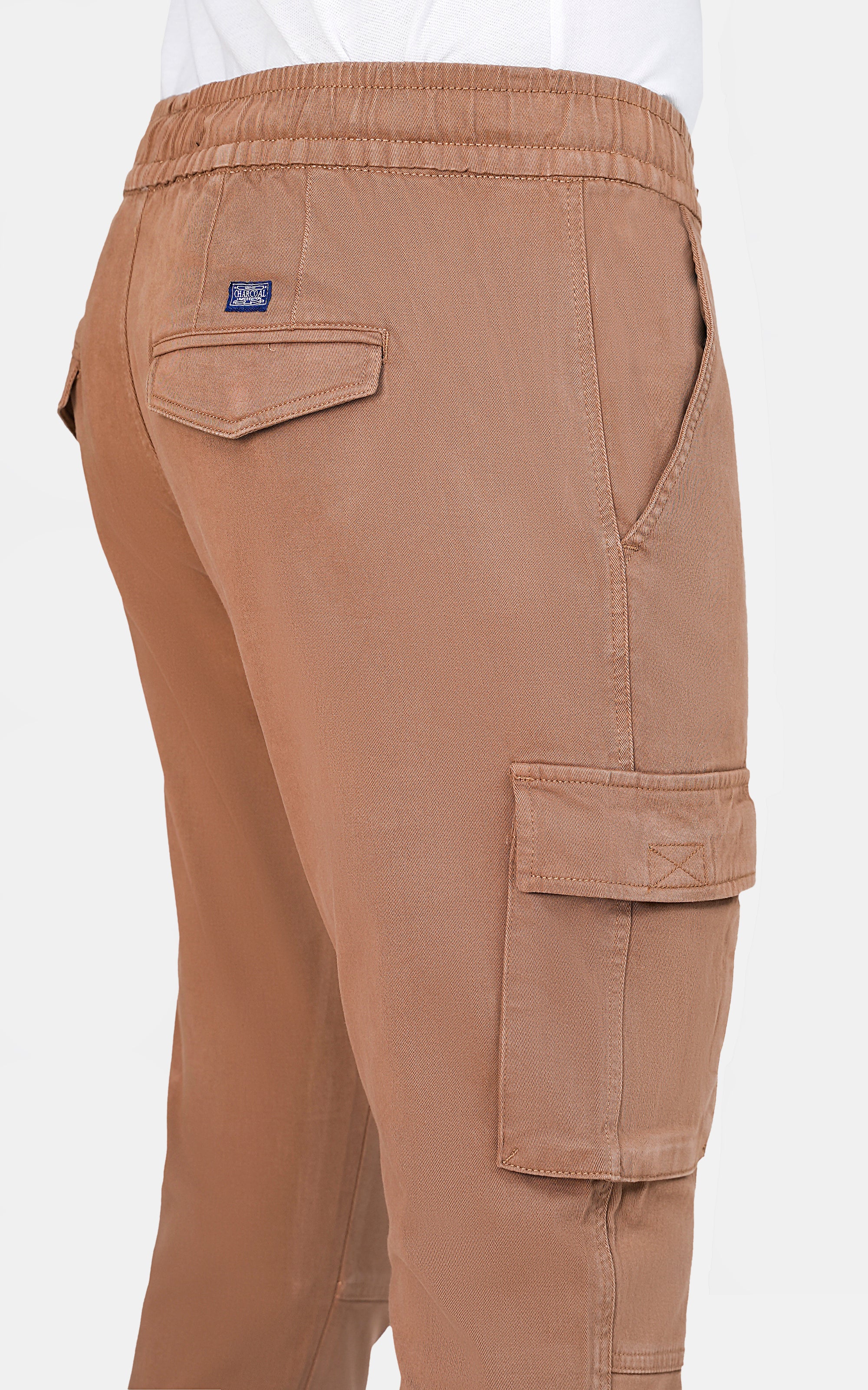 cargo joggers in a stretch twill cotton weave with covered elastication and a drawstring at the waist, diagonal side pockets and back bone pockets and leg pockets with concealed press-studs. tapered legs with seams and darts at the knees and covered elastication at the hems.