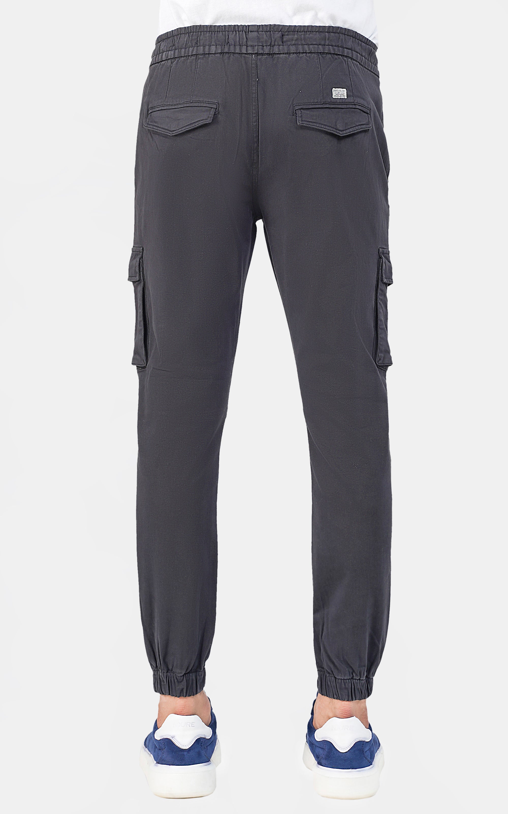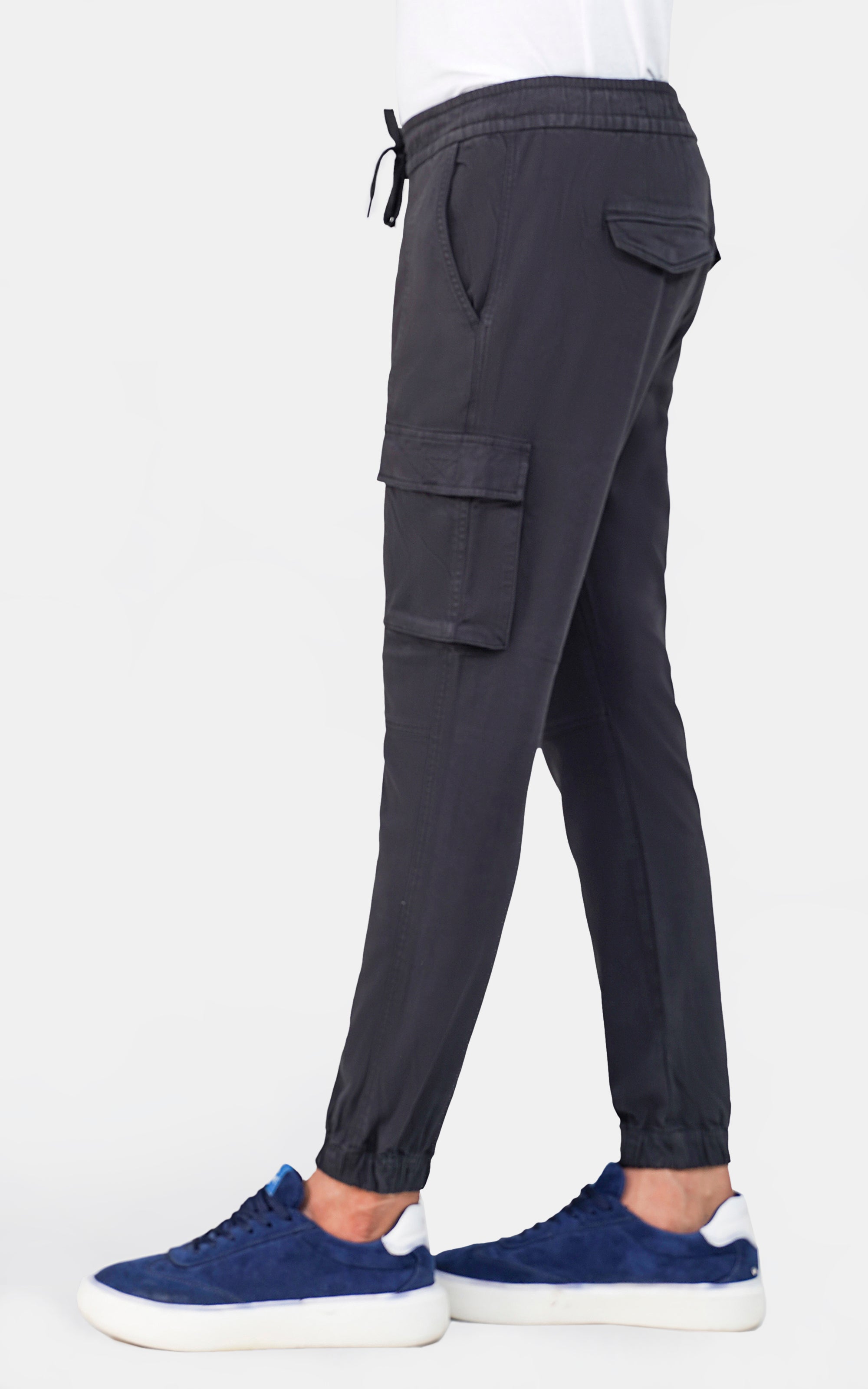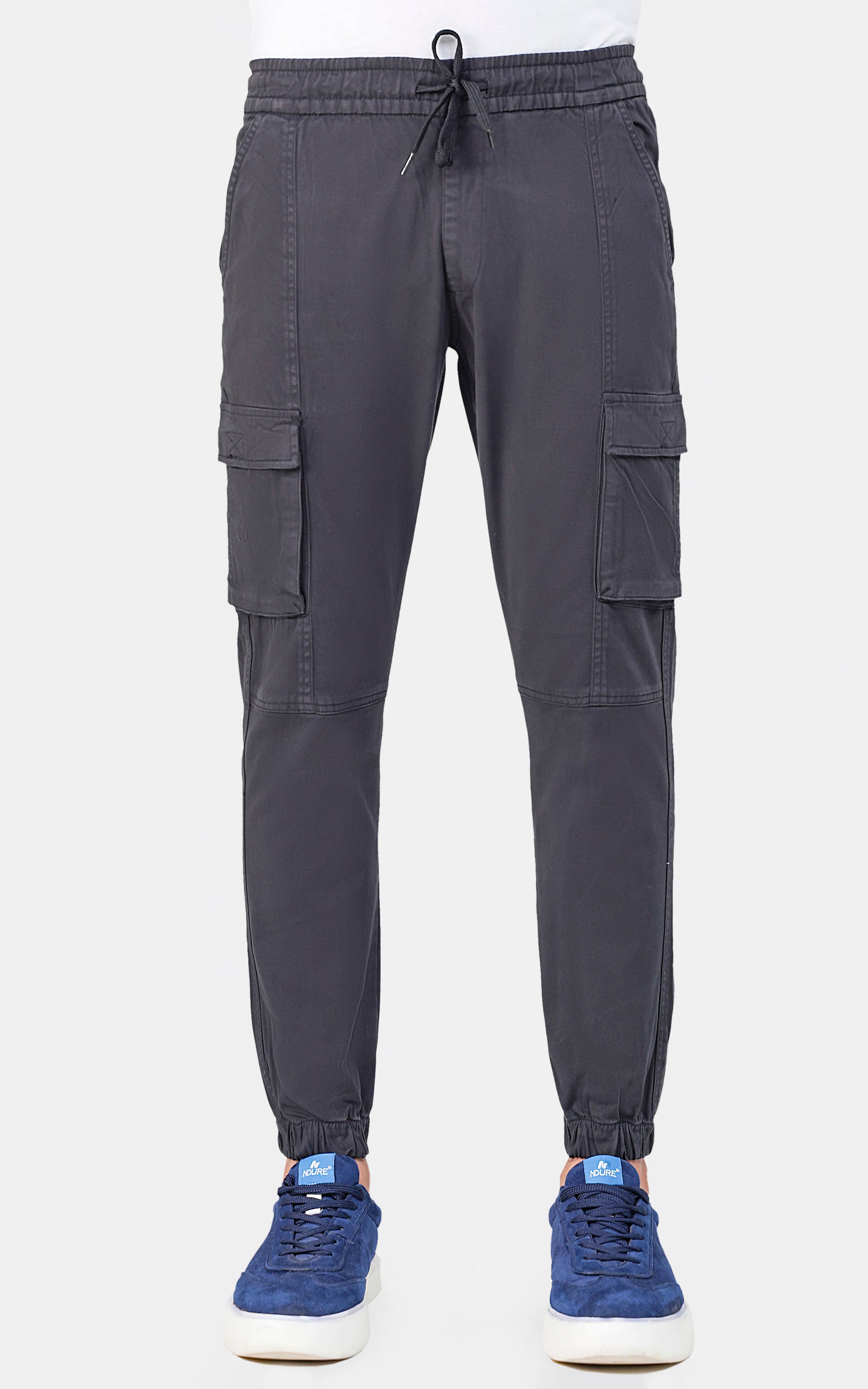 cargo joggers in a stretch twill cotton weave with covered elastication and a drawstring at the waist, diagonal side pockets and back bone pockets and leg pockets with concealed press-studs. tapered legs with seams and darts at the knees and covered elastication at the hems.