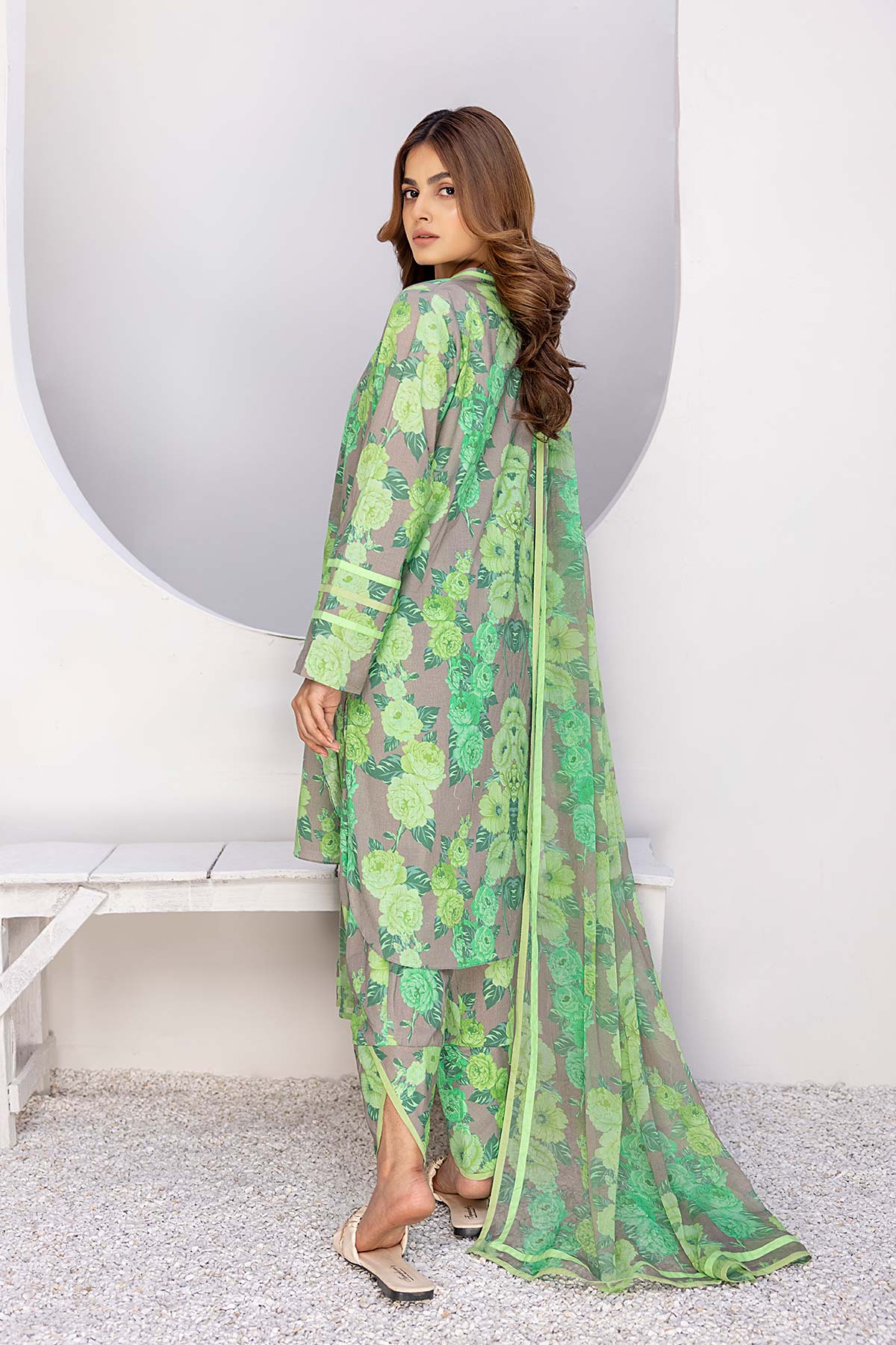 - digital lawn parrot green floral printed shirt - finished with fashion of plain fabric on sleeves and neckline - printed floral lawn trouser - floral printed bamber chiffon dupatta finished with patti of plain fabric measurement length 36" 36" 38" 38" flare/ daman width 26" 26" 28" 28"