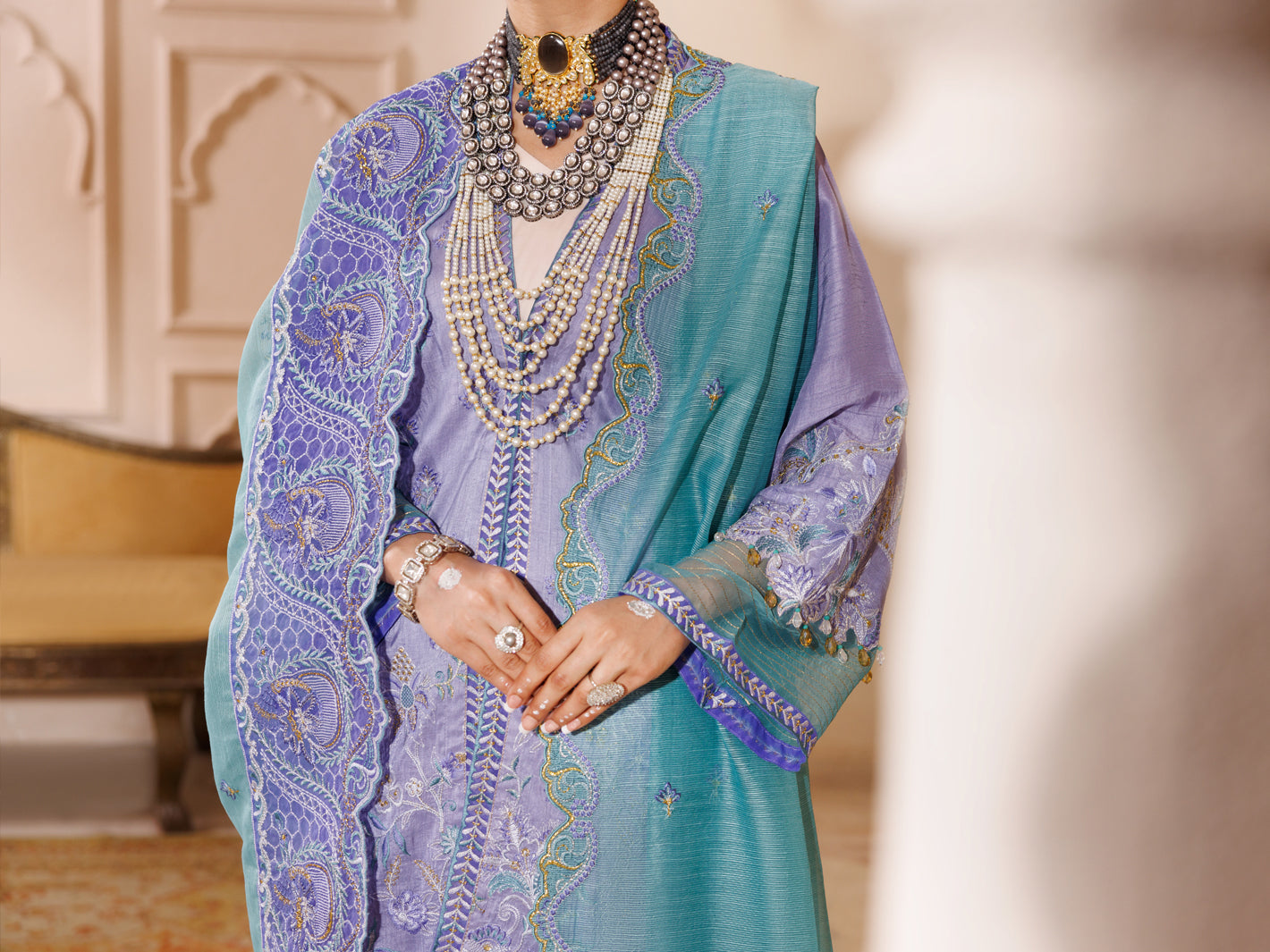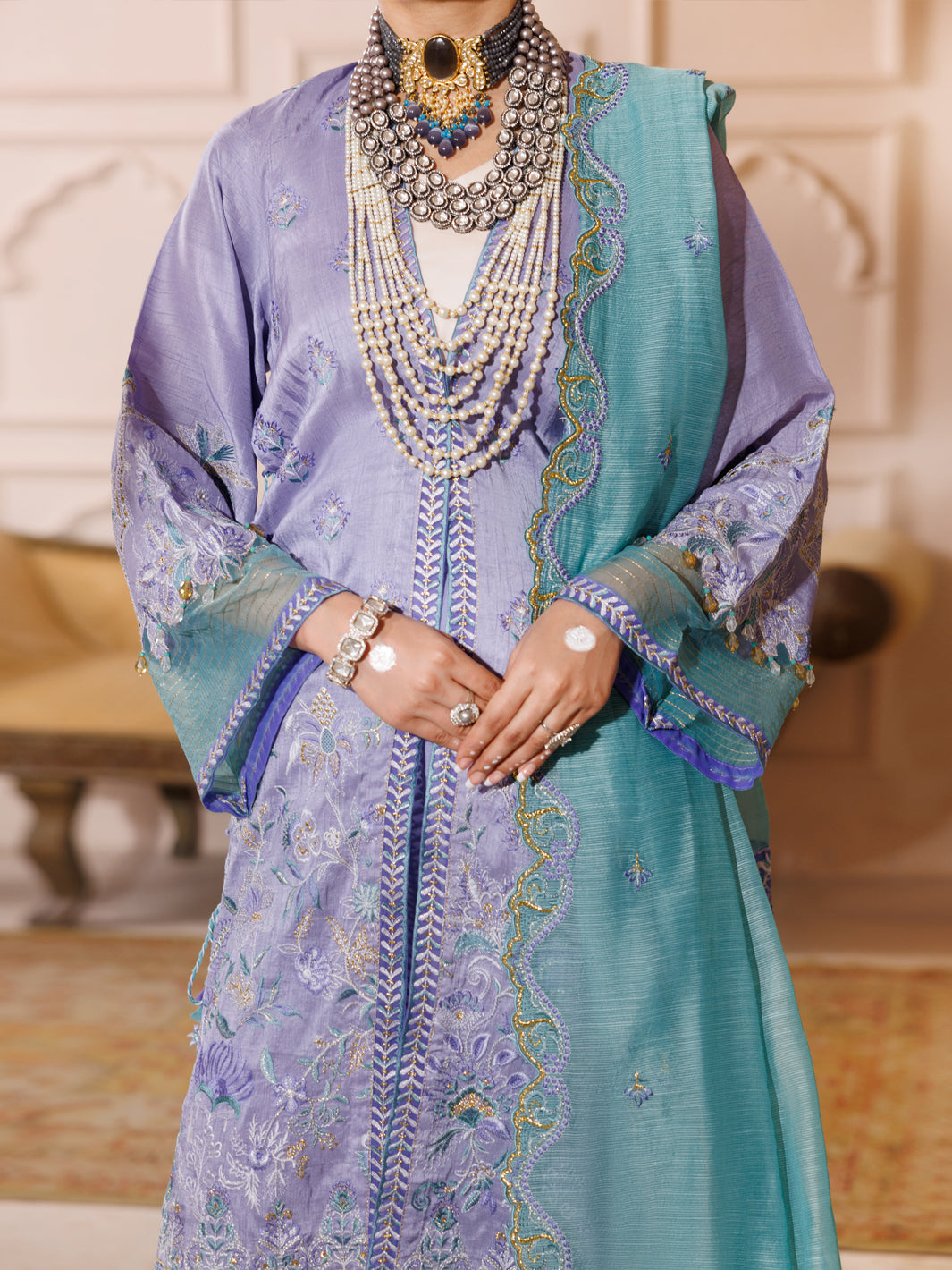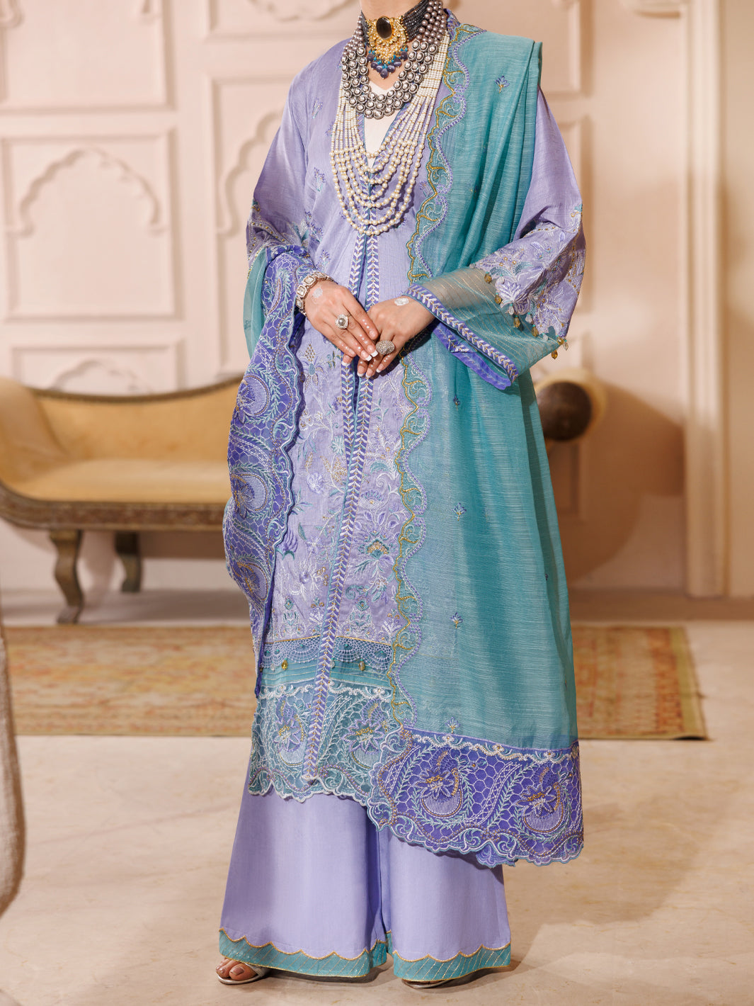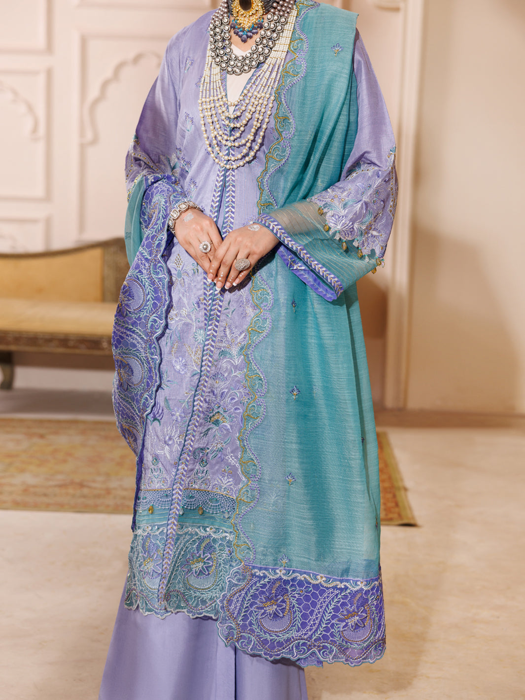 raw silk front embroidered panel: 0.70 meter raw silk dyed shirt back & trouser & inner: 5.50 meters raw silk sleeves embroidery: 01 set khaddi stripe dupatta with embroidery: 2.25 meters front & sleeves embroidered patti: 3.80 meters daman embroidered border: 1.40 meter trouser running stitch embroidery: 1.65 meters shirt running stitch embroidery: 1.80 meters dupatta embroidered border: 2.15 meters handmade tassels with dori: 1 set