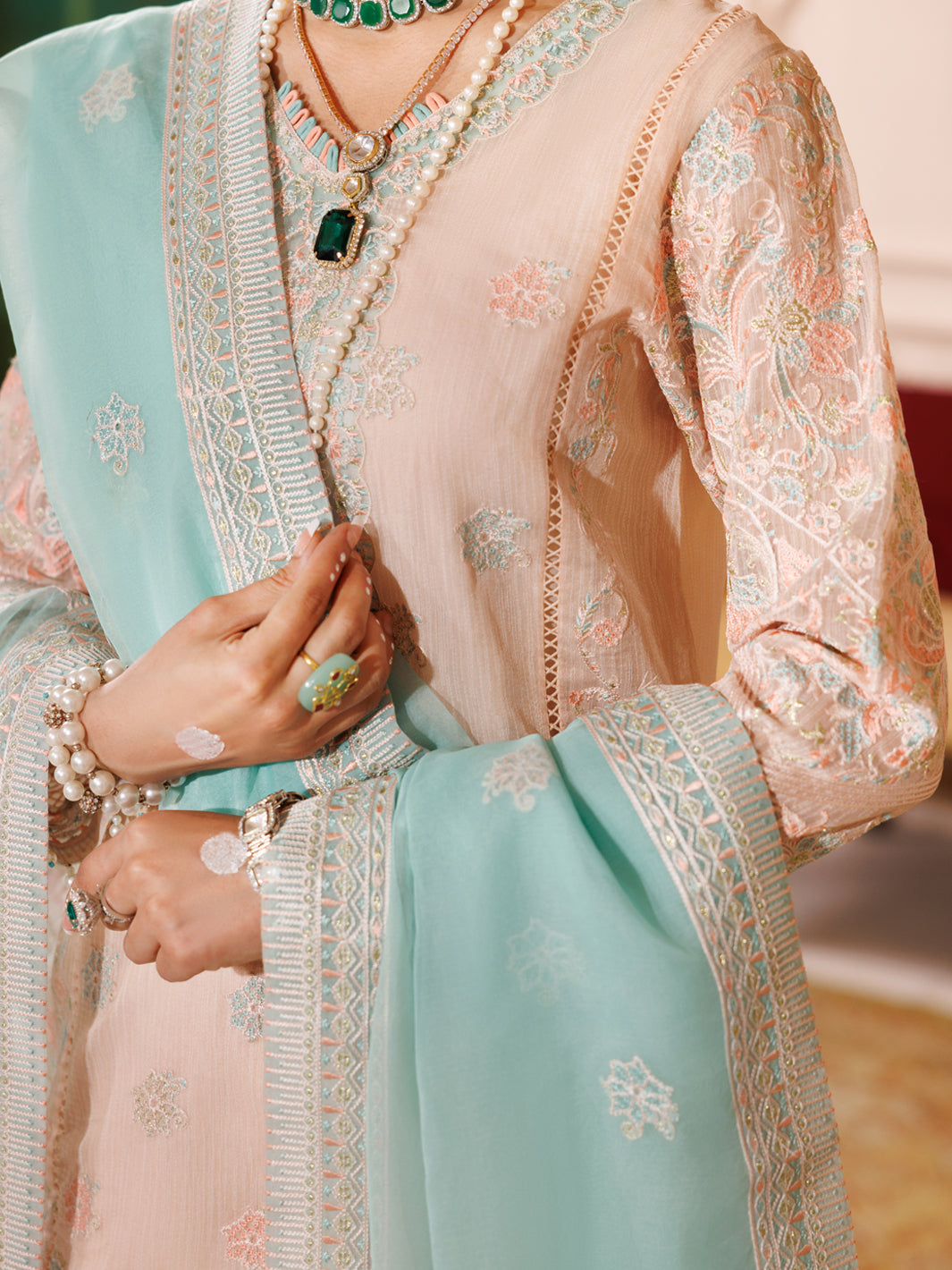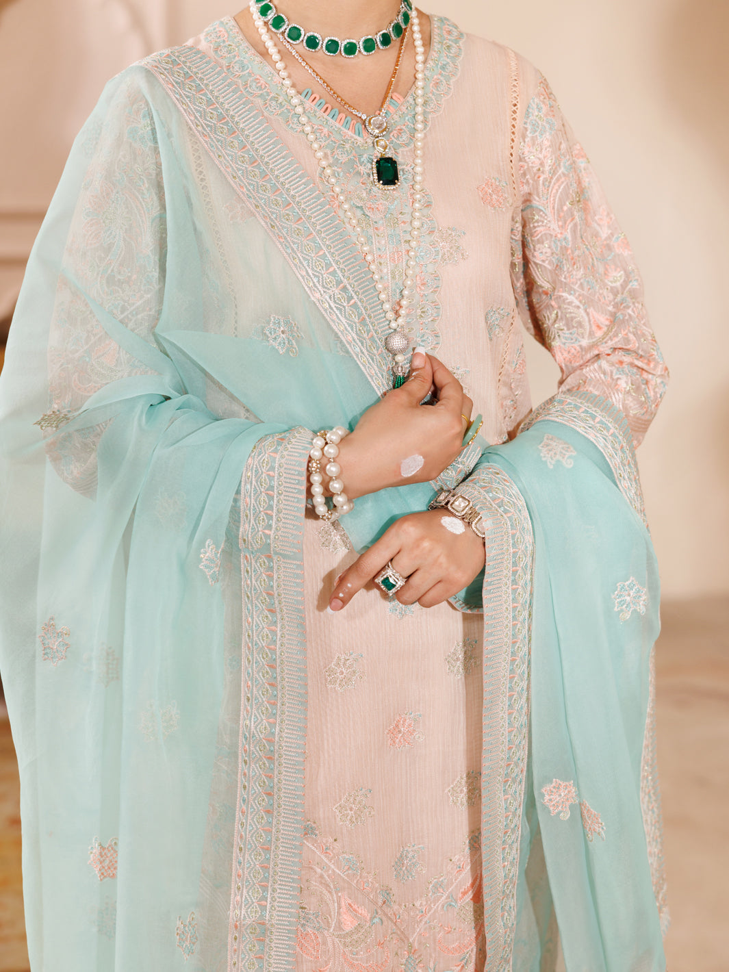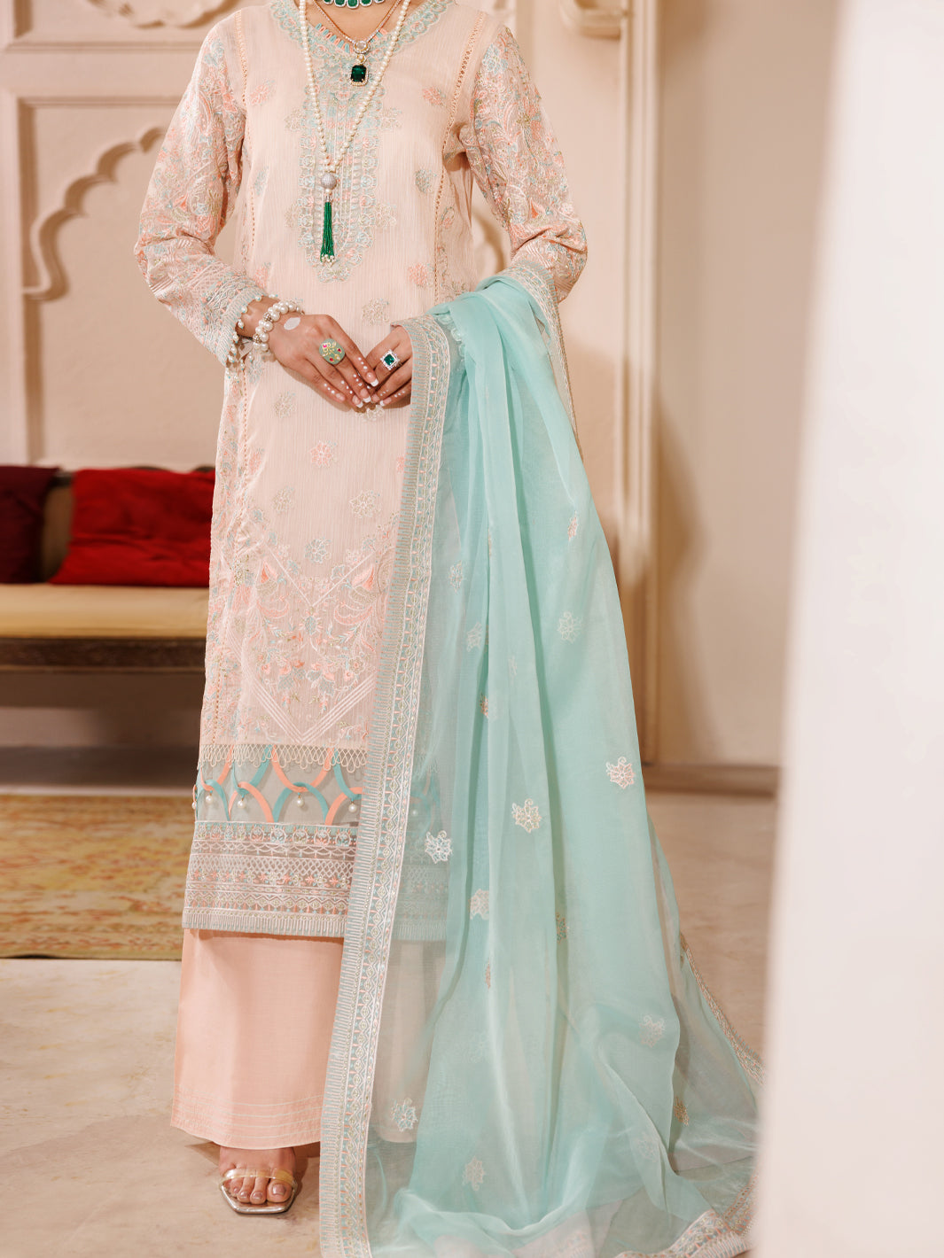 organza stripe front centre embroidered panel: 01 pc organza stripe side kali embroidery: 01 set organza stripe dyed shirt back: 1.10 meter organza stripe sleeves embroidery: 01 set poly organza dupatta with embroidery: 1 pc viscose dyed shirt inner: 2 meters viscose dyed trouser: 2.5 meters daman embroidered border: 1.5 meters sleeves embroidered border (1): 0.80 meter sleeves & dupatta pallu embroidered border: 3 meters neckline embroidered bunch: 1 pc add-on dyed organza: 1 pc