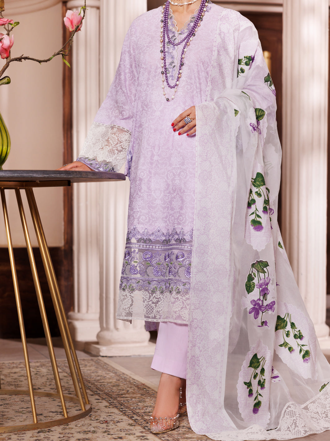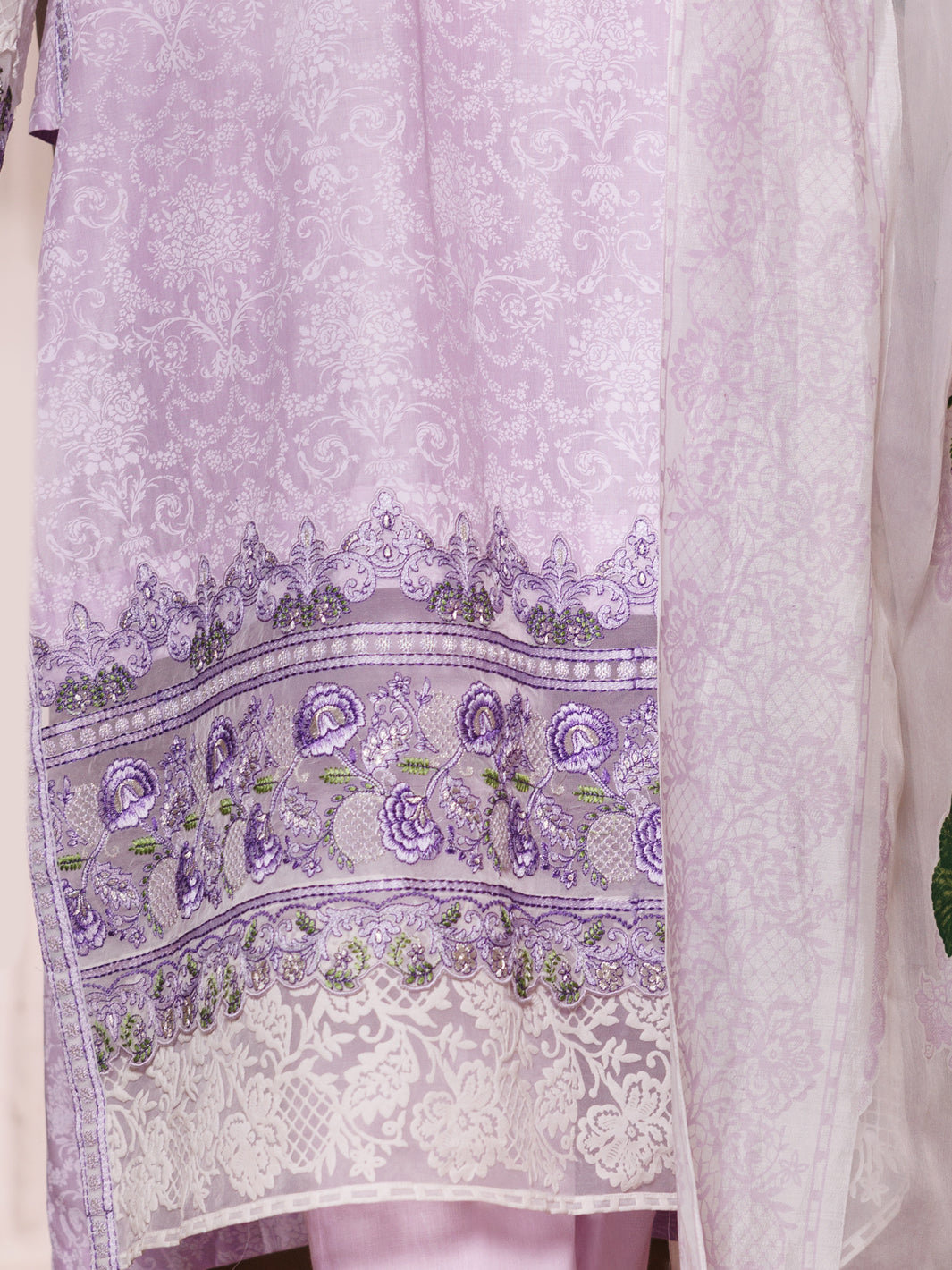 cambric paste printed shirt: 2.5 meters organza burnout dupatta: 1pc cambric dyed trouser: 2 meters organza foam printed border: 3.60 meters neckline embroidered patti: 0.85 meter sleeves embroidered border: 1.10 meter daman embroidered border: 0.75 meter chalk embroidered patti: 3.90 meters