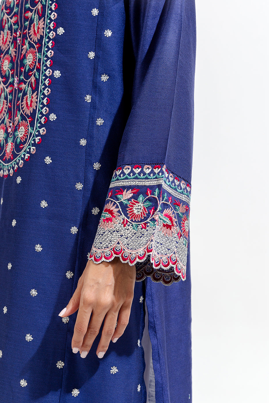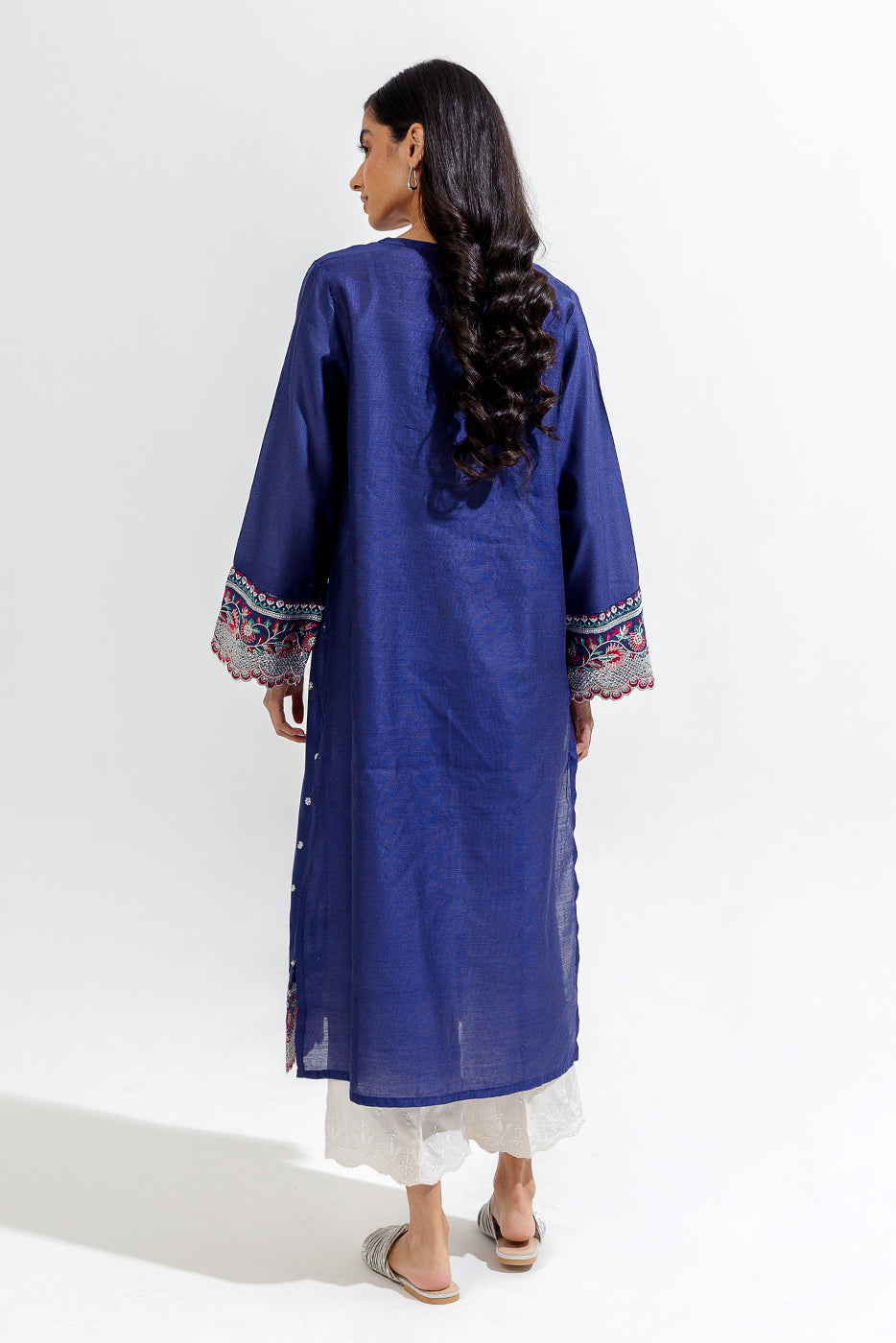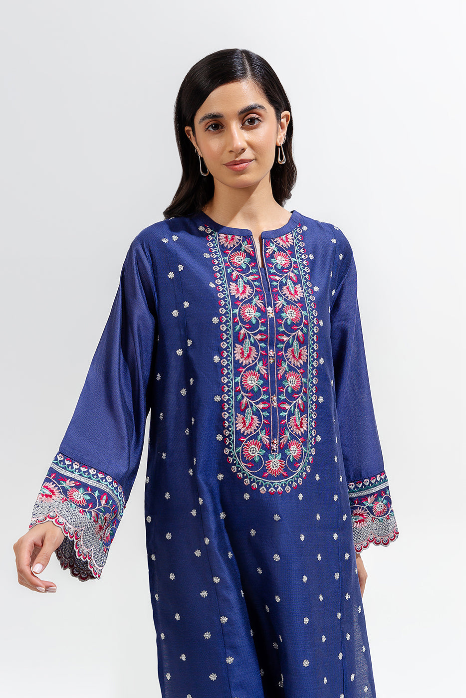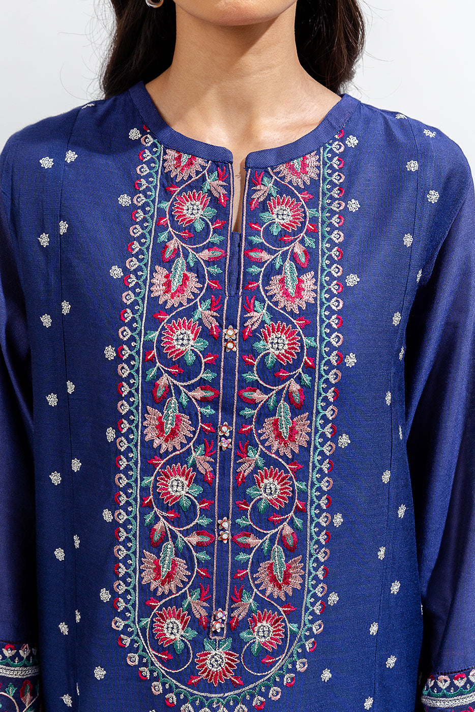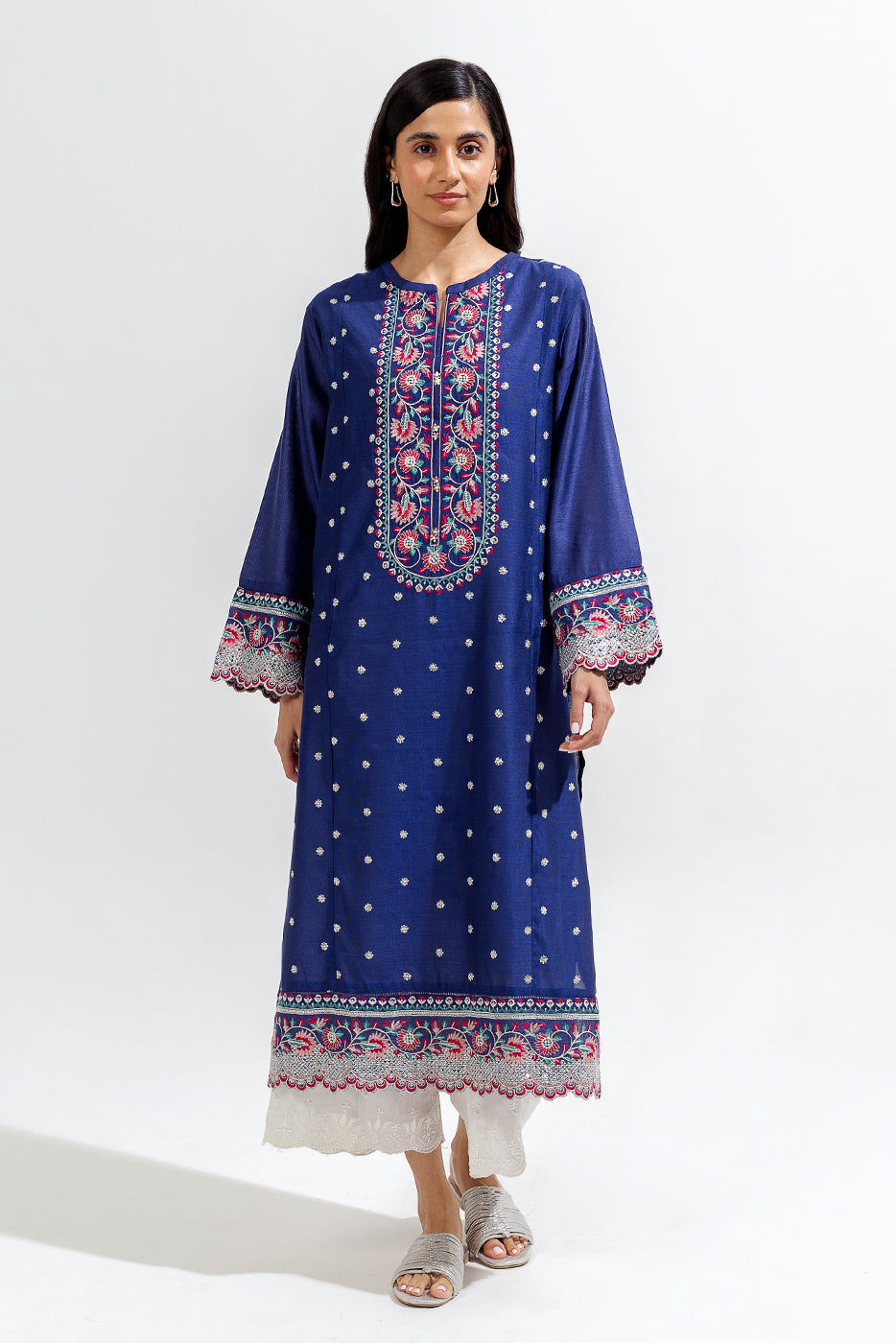 description: embroidered front with band neck and slit.button detail on front.embroidered border on sleeves. scallopped front and sleeves border. fabric: two tone what you'll get: shirt fit: casual fit size & fit: model height is 5'6" model is wearing 8 size