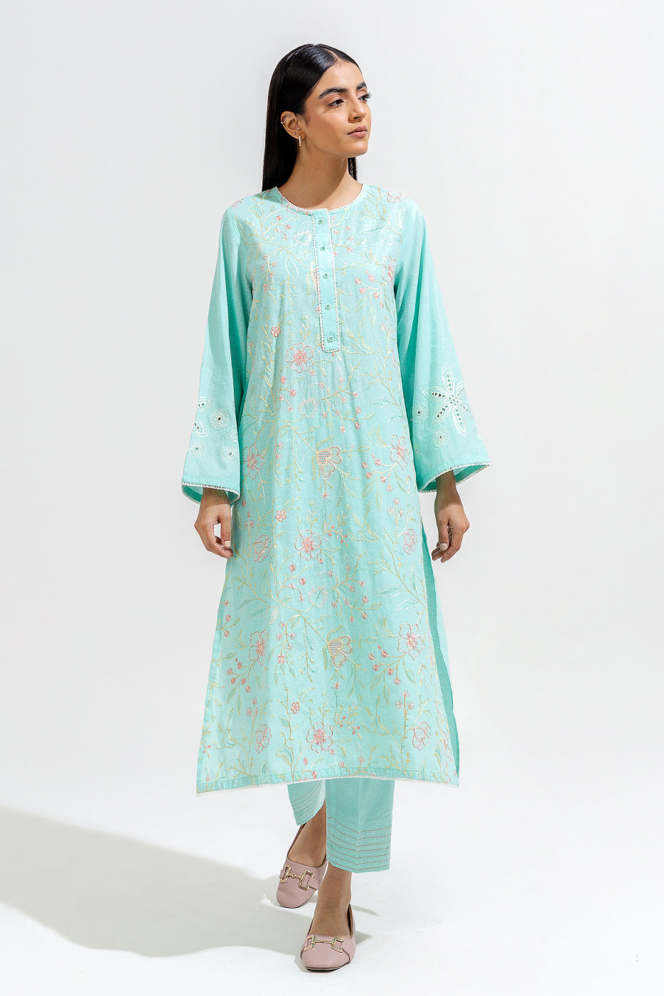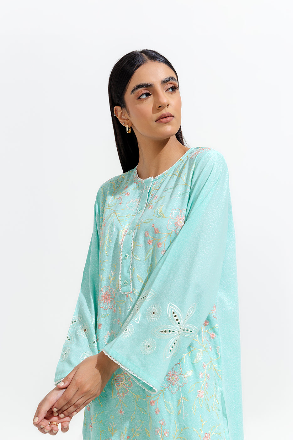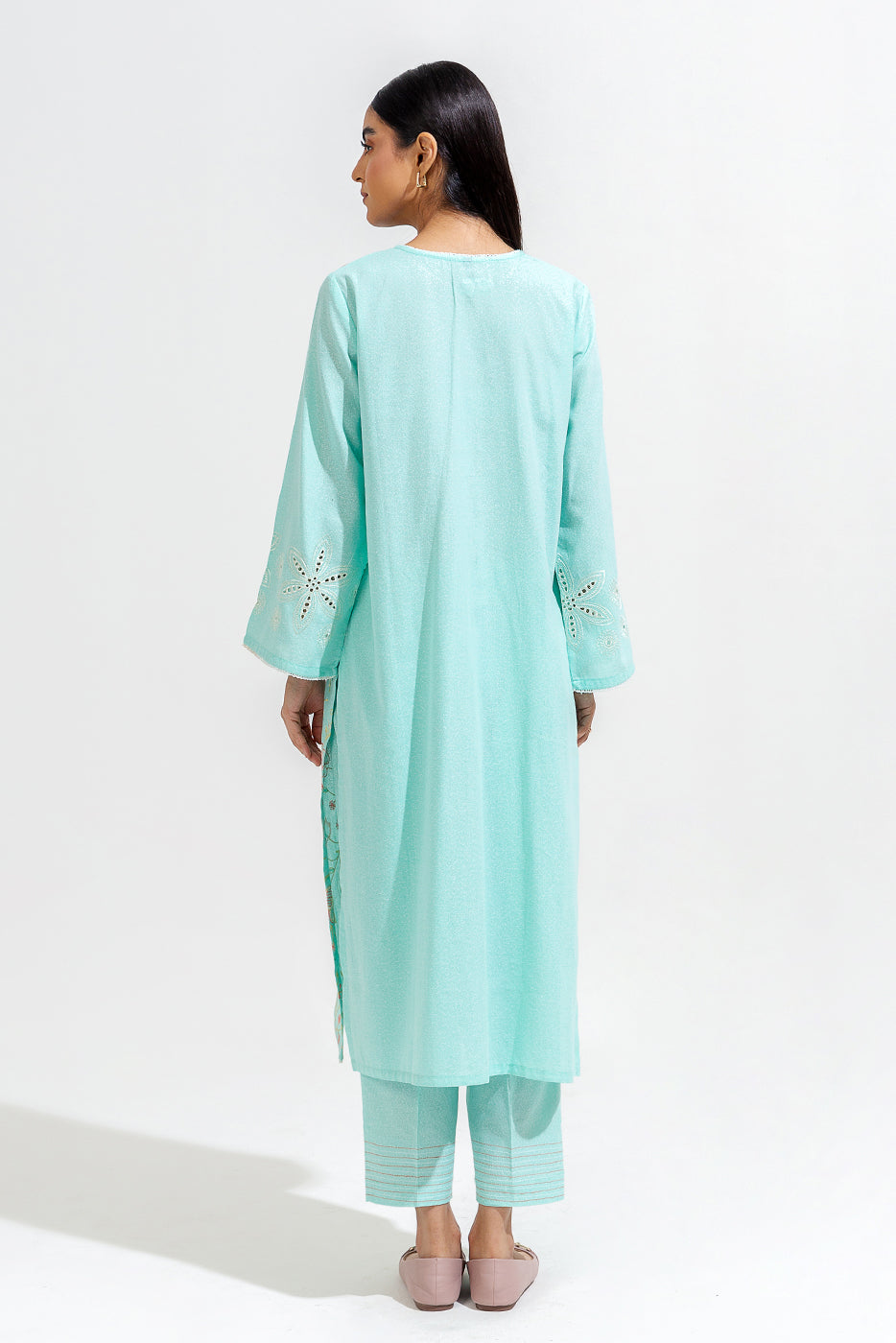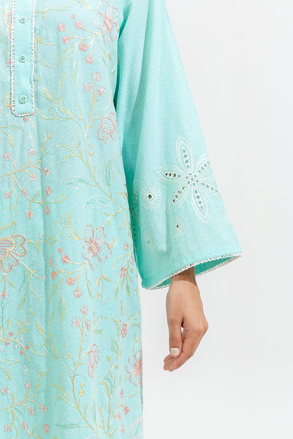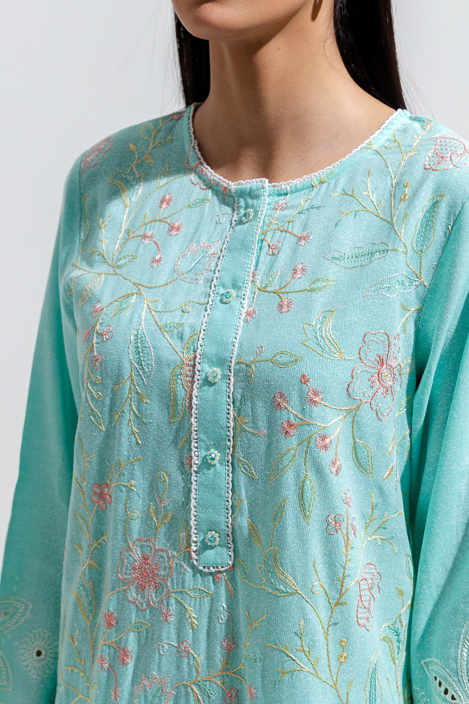 description: two piece embroidered set with shirt having a round neckline with pearls button and lace detail all over, paired with straight pants. fabric: karandi what you'll get: shirt+pant fit: casual fit size & fit: model height is 5'6" model is wearing 8 size